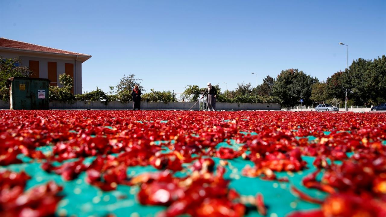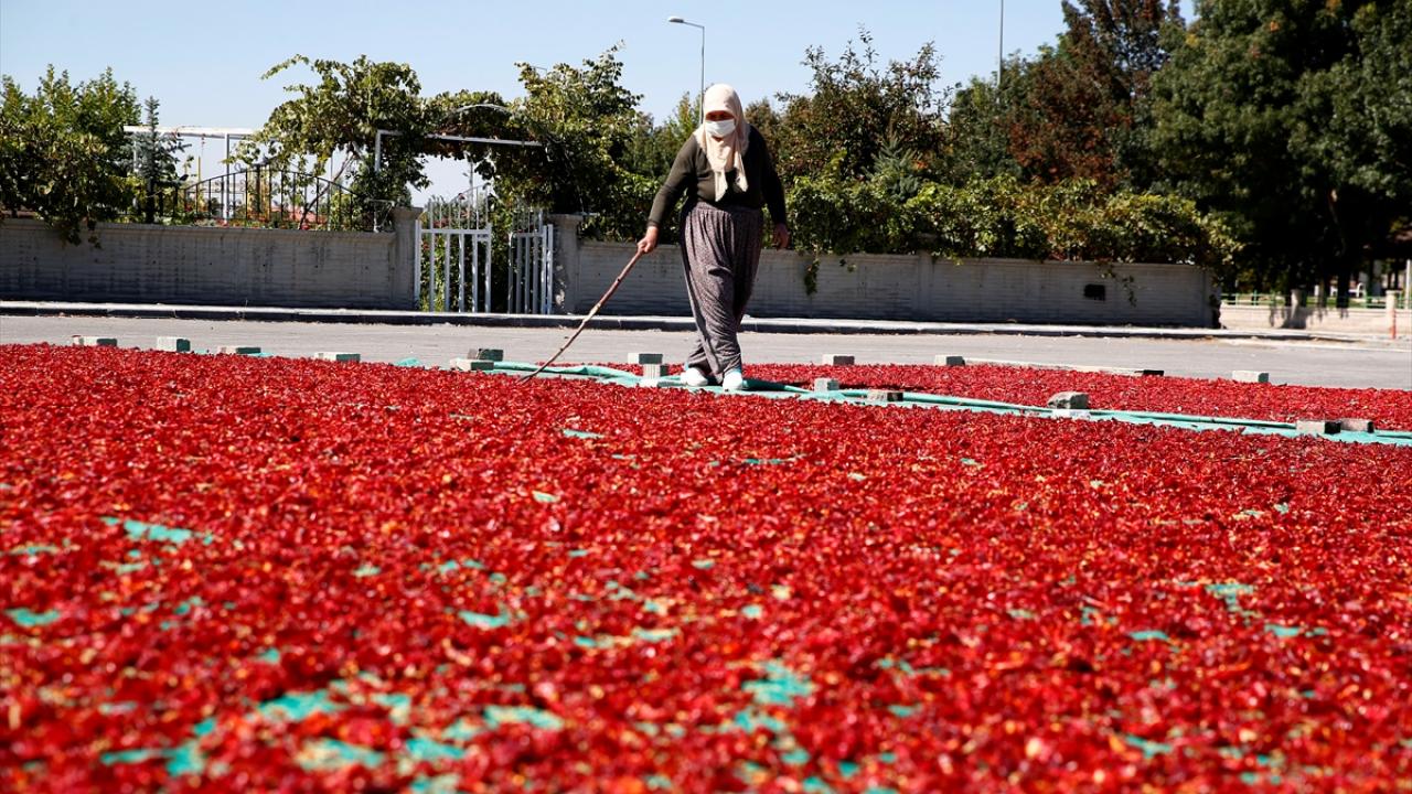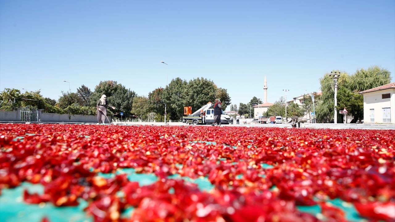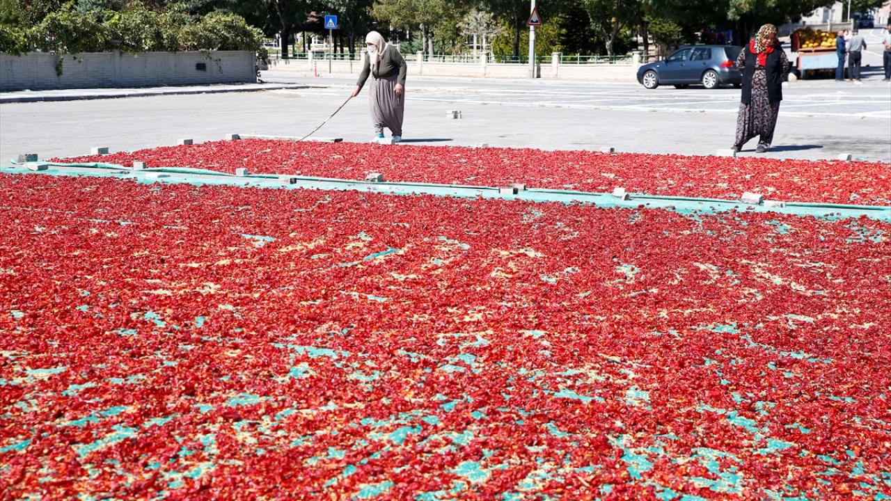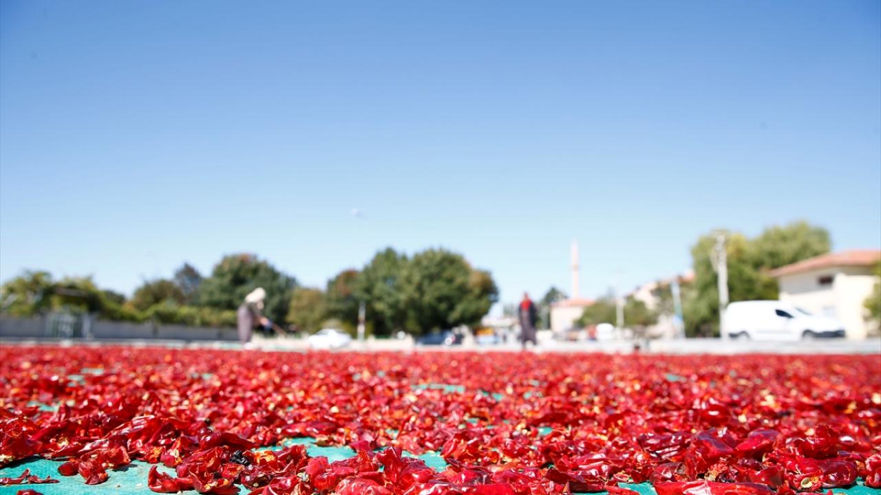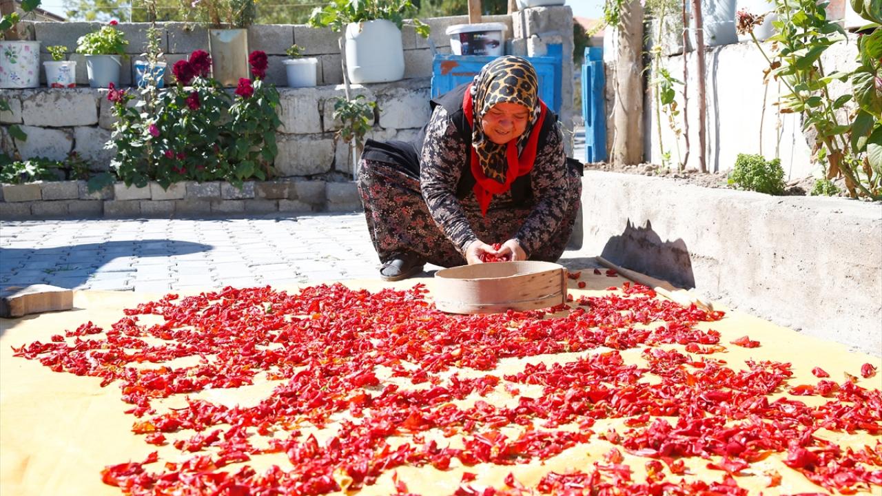 Kayseri'de bir mahallede yetiştirilen tescilli Cırgalan biberi, kadınlar tarafından ayıklanıp parçalara ayrıldıktan sonra çatılar, sokak araları ve mahalle meydanında kurutulmaya bırakılıyor.