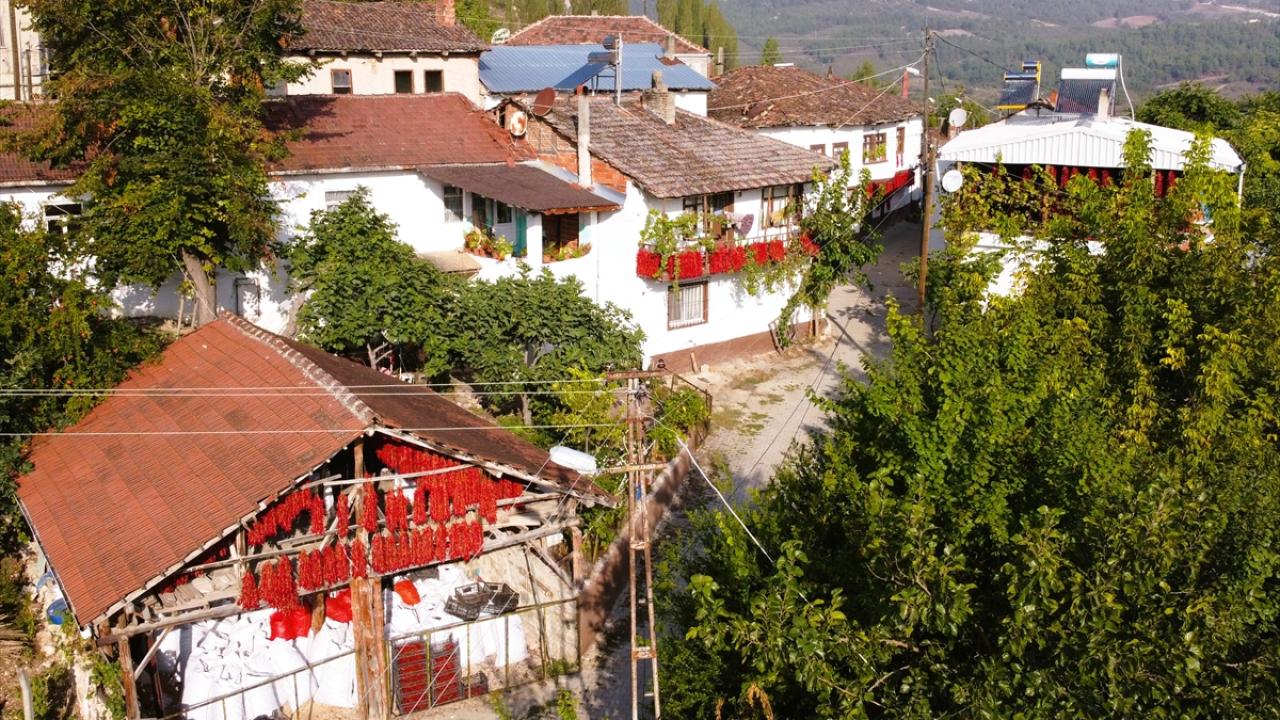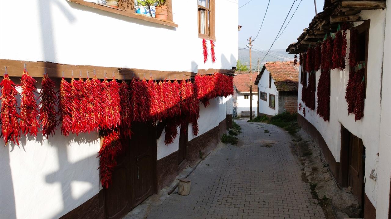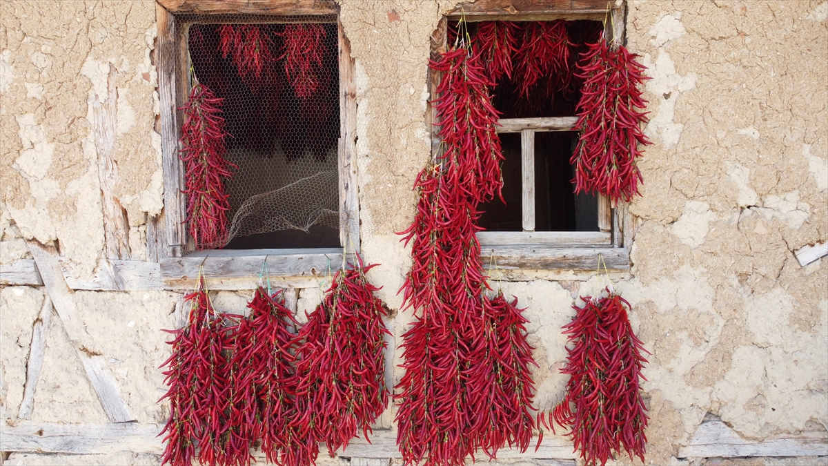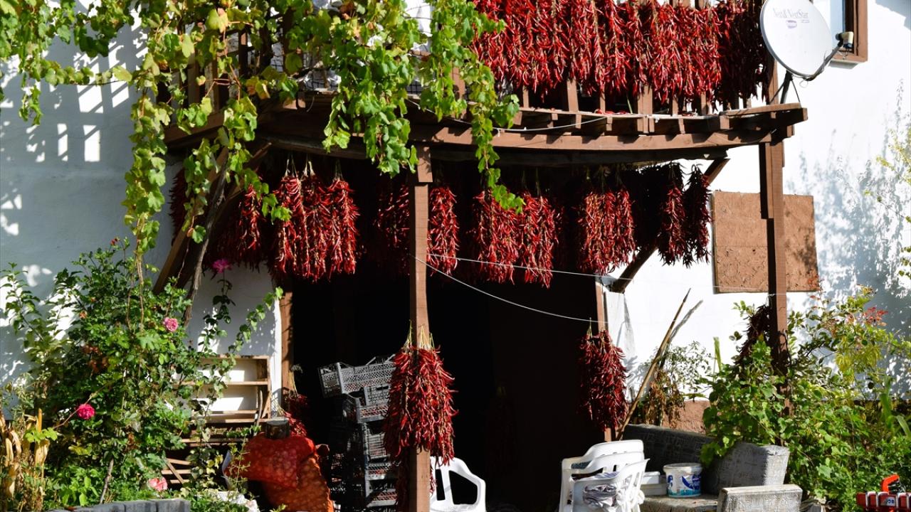 Hemen hemen her evin balkonuna, duvarına, çatısına asılarak kurutulan ve adeta köyü kırmızıya boyayan biberin oluşturduğu görüntü dikkati çekiyor.