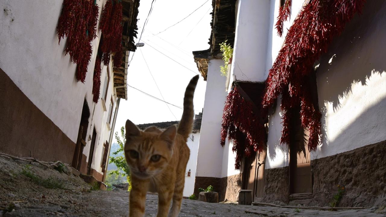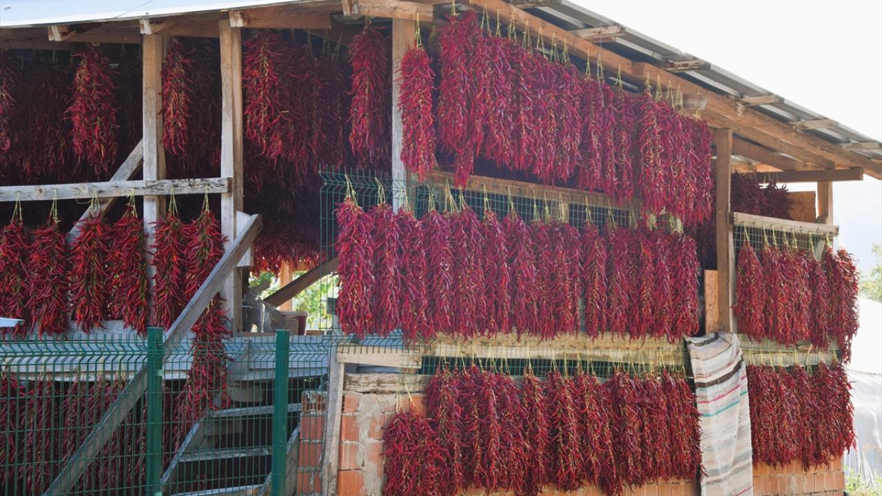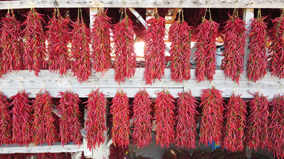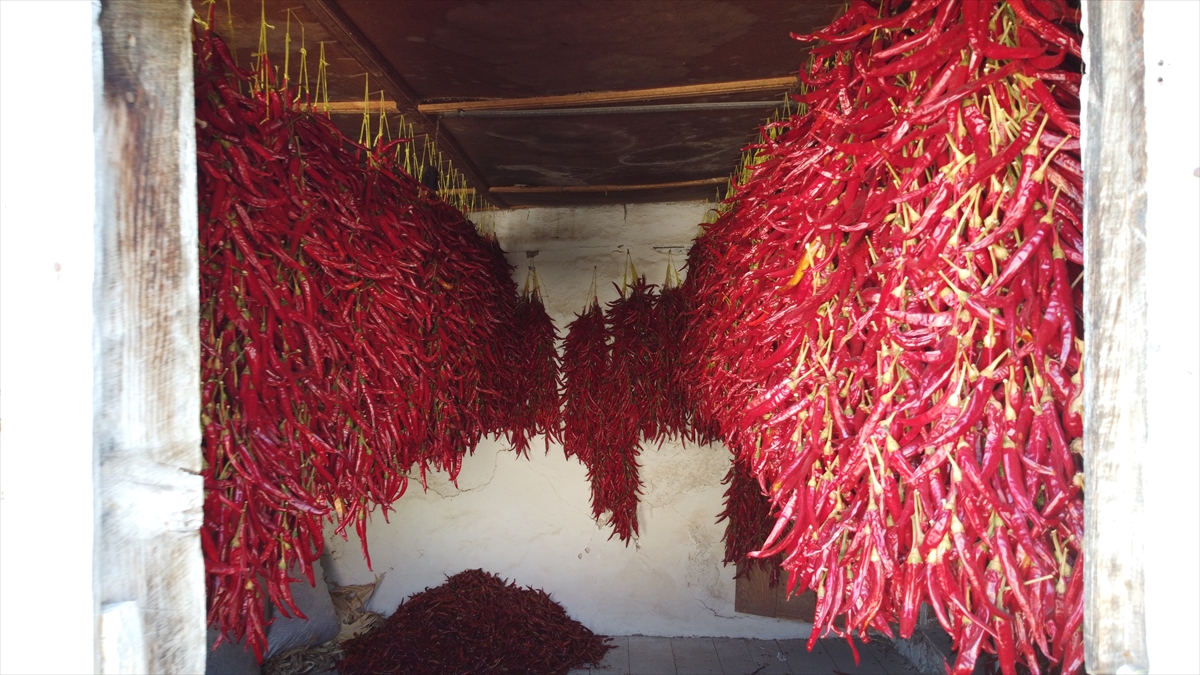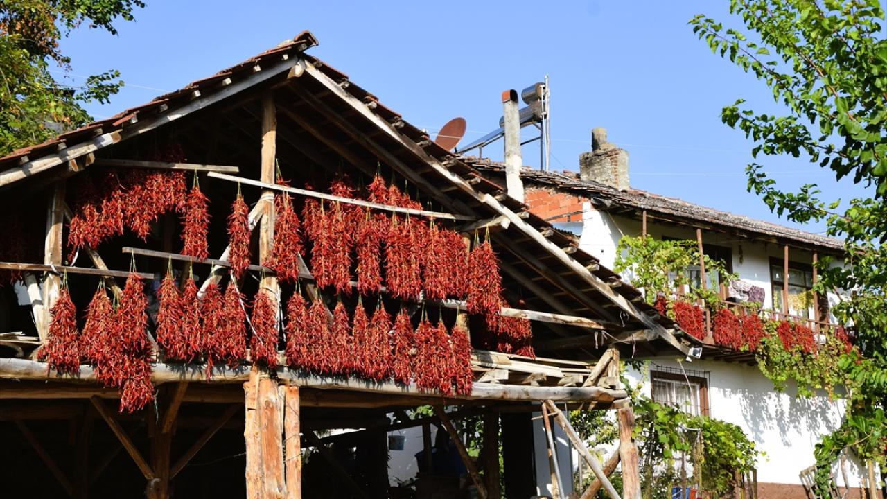 Hemen hemen her evin balkonuna, duvarına, çatısına asılarak kurutulan ve adeta köyü kırmızıya boyayan biberin oluşturduğu görüntü dikkati çekiyor.