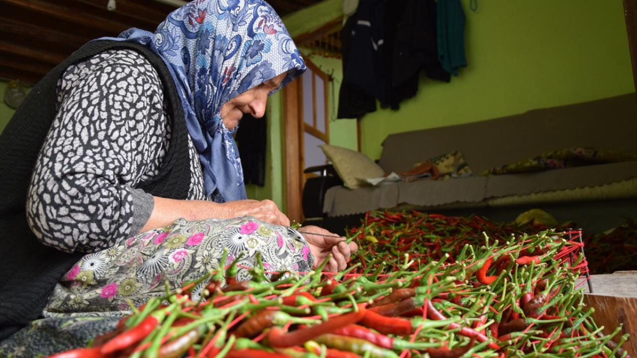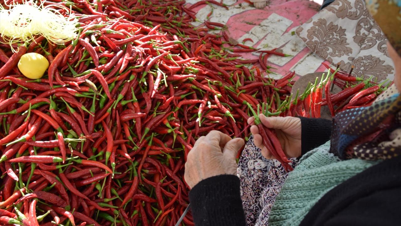 İl Tarım ve Orman Müdürlüğünün iyi tarım uygulamaları kapsamında yetiştirilen "Çukurören biberi", hasadın ardından kurutma işlemi için kadınlar tarafından özenle iplere diziliyor.