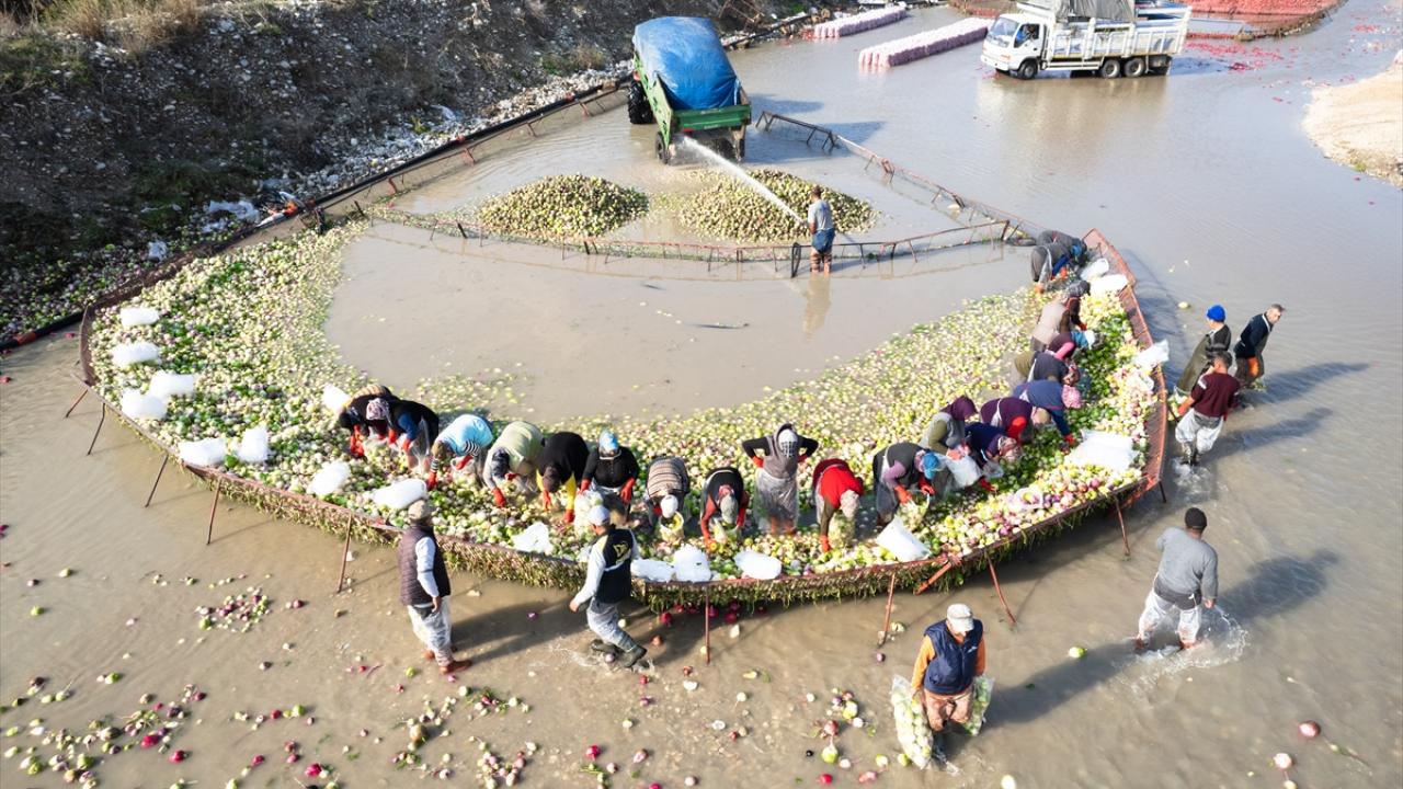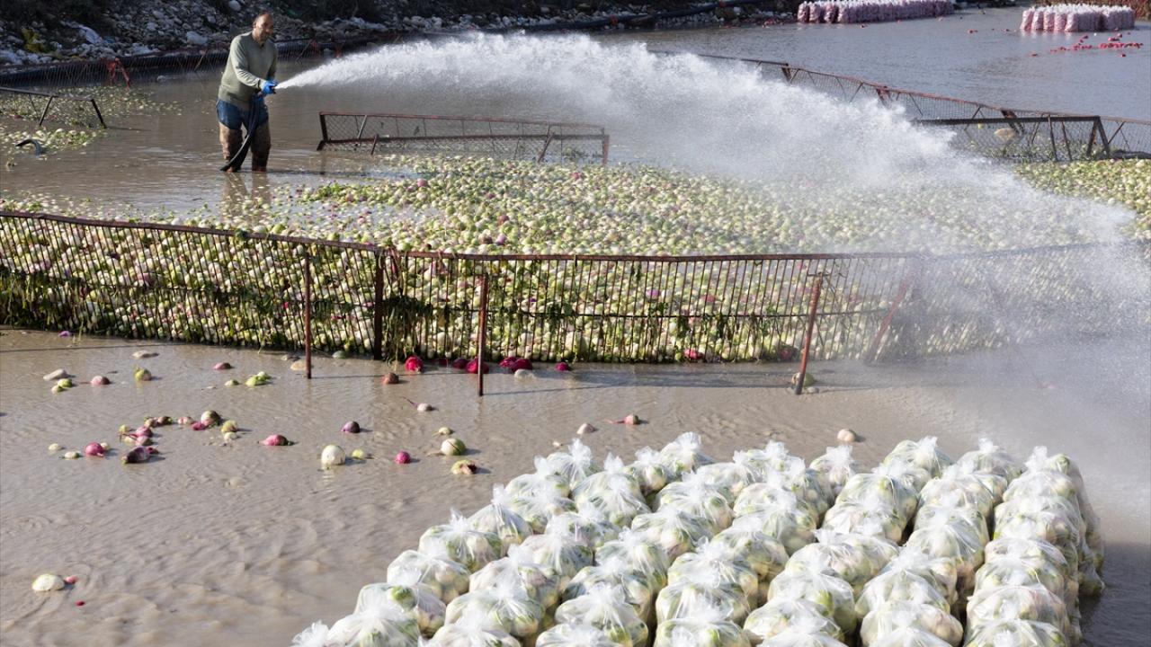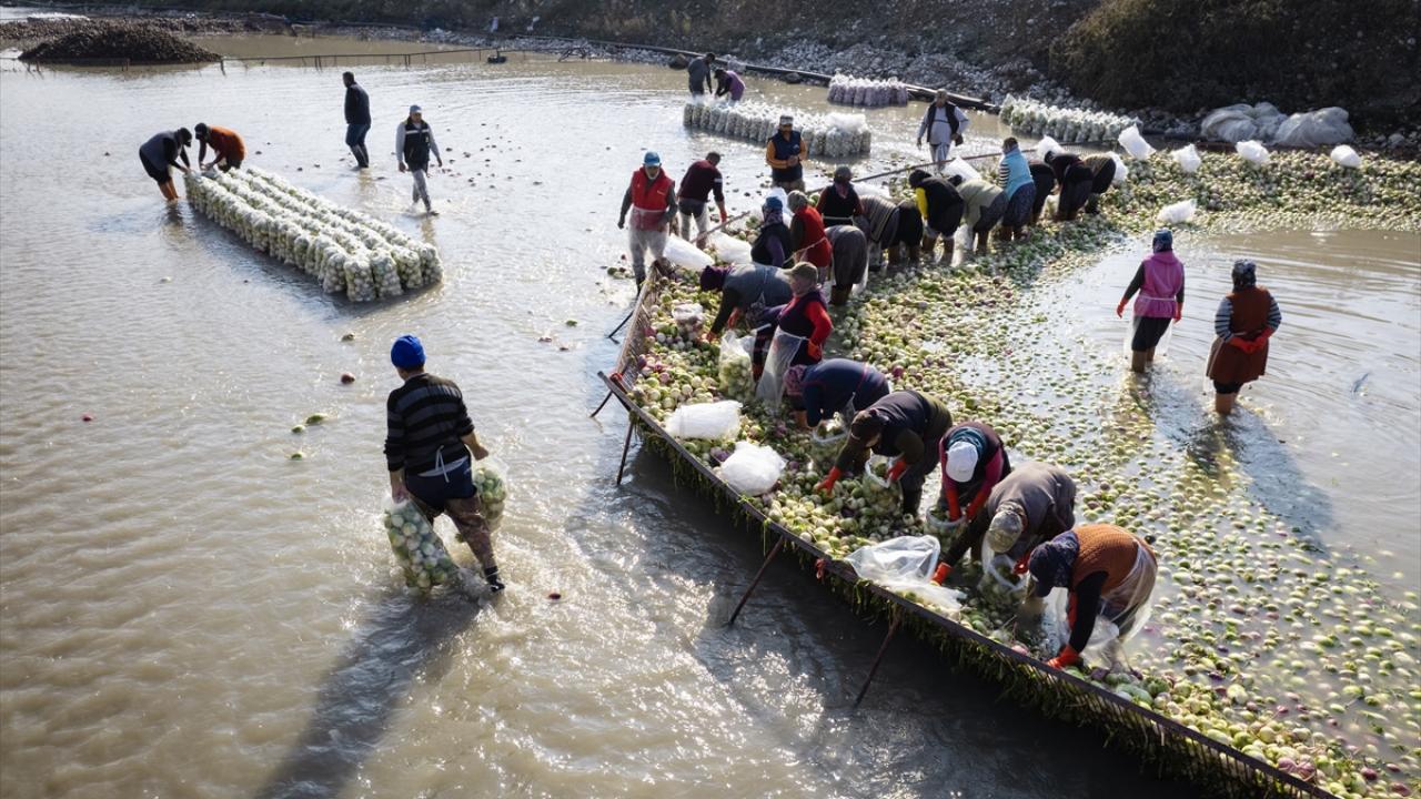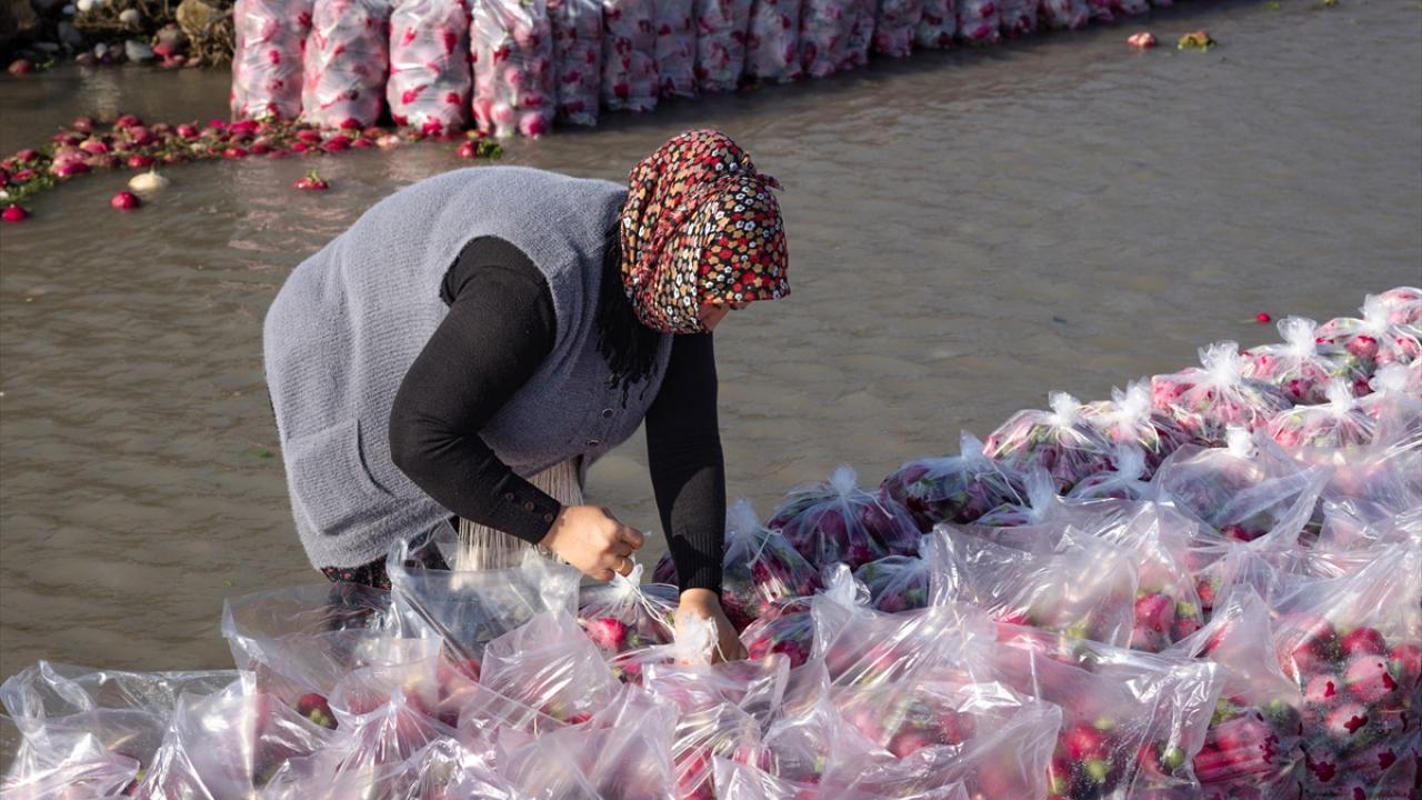 Kış aylarına girilmesiyle başlayan hasat döneminde işçiler, sabahın erken saatlerinde Savrun Çayı`na gelerek turpları yıkayıp paketliyor.