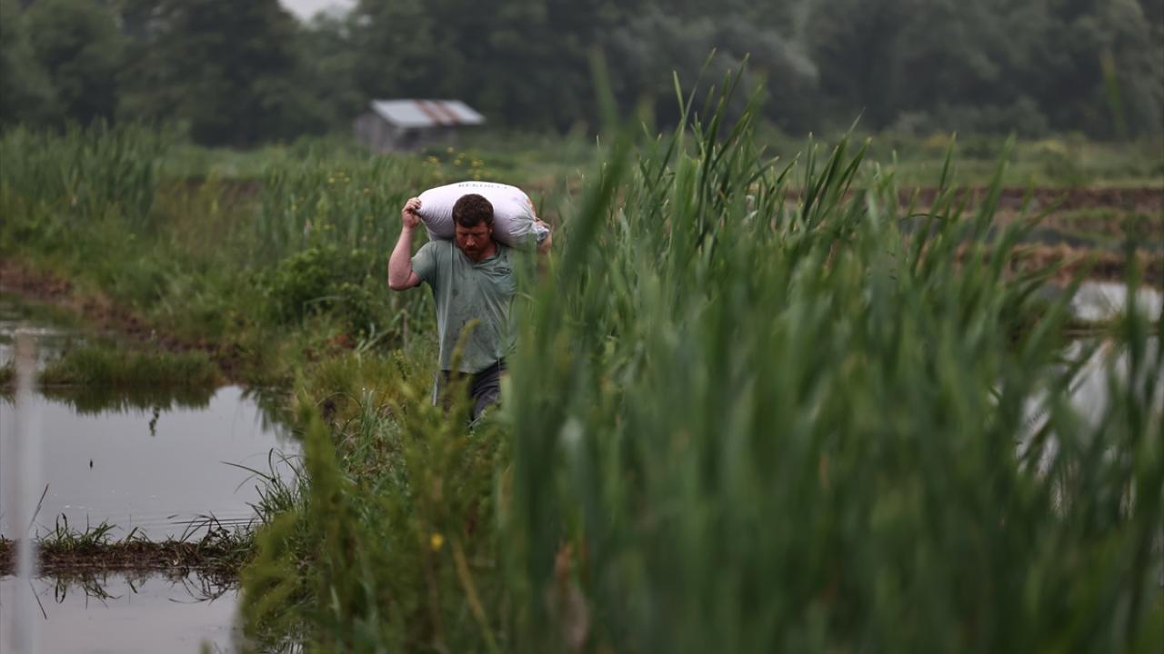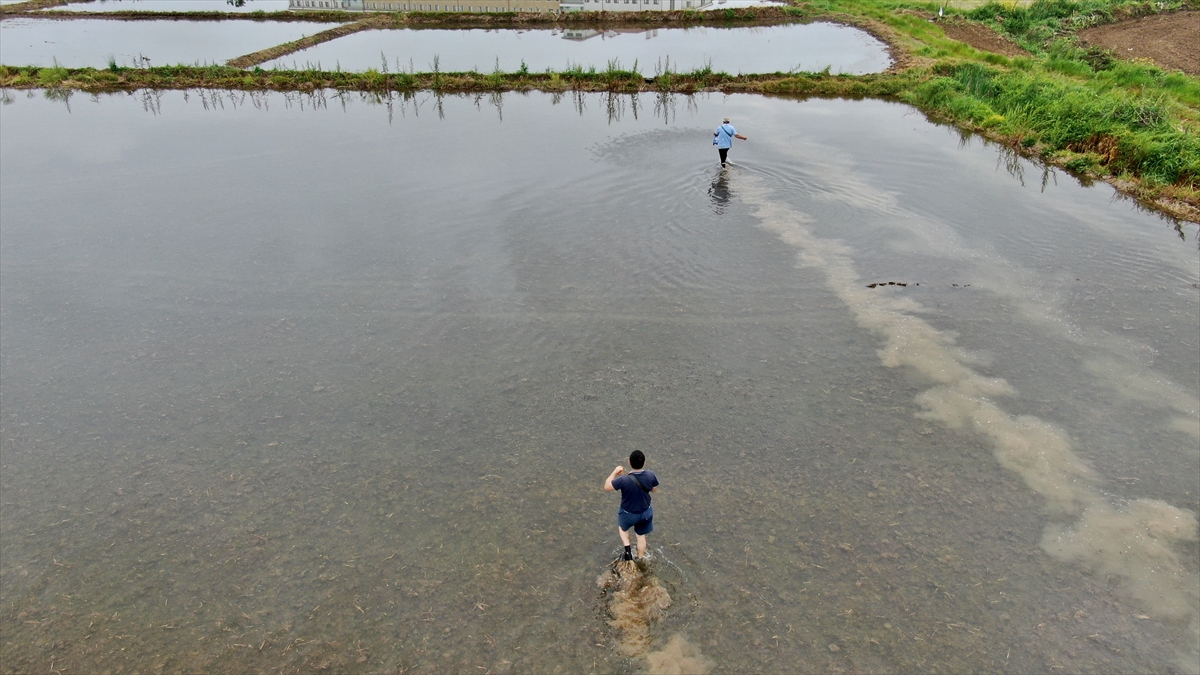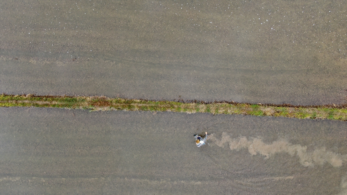 Bölgede bugünlerde çeltik ekimi yapan çiftçiler, sulak arazilerinde sabahın erken saatlerinde yorucu mesailerine başlıyor.
