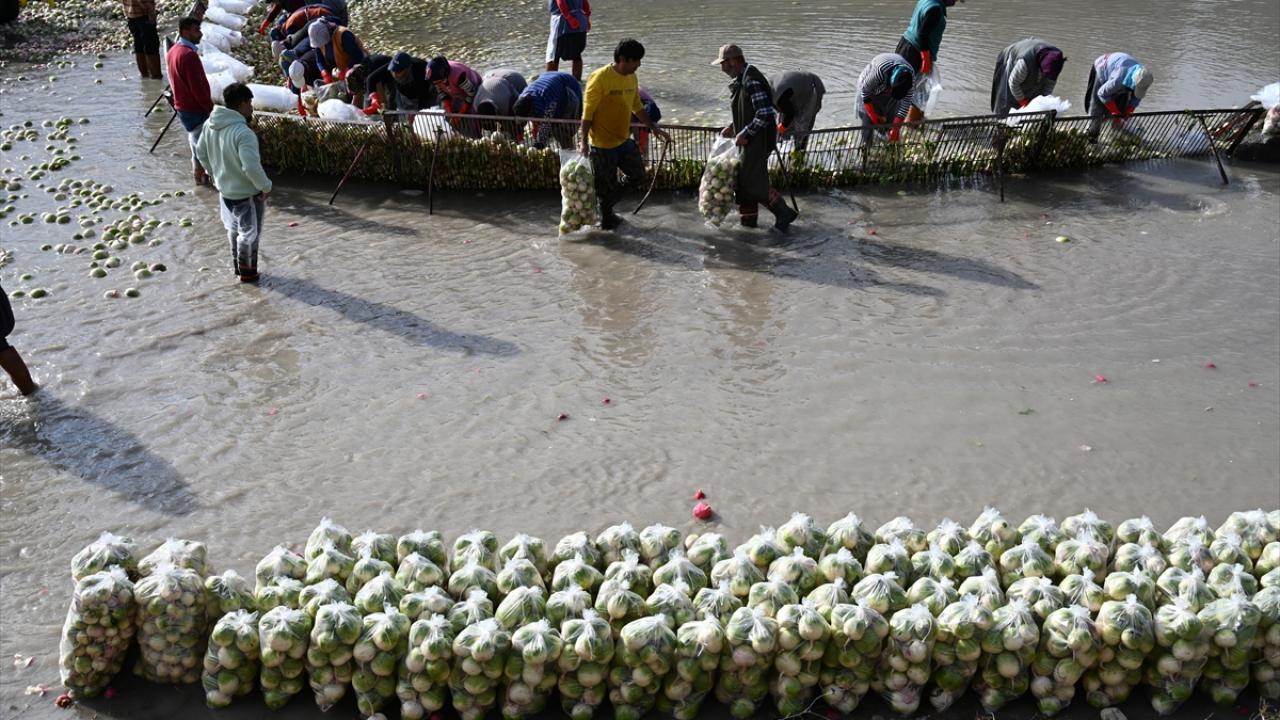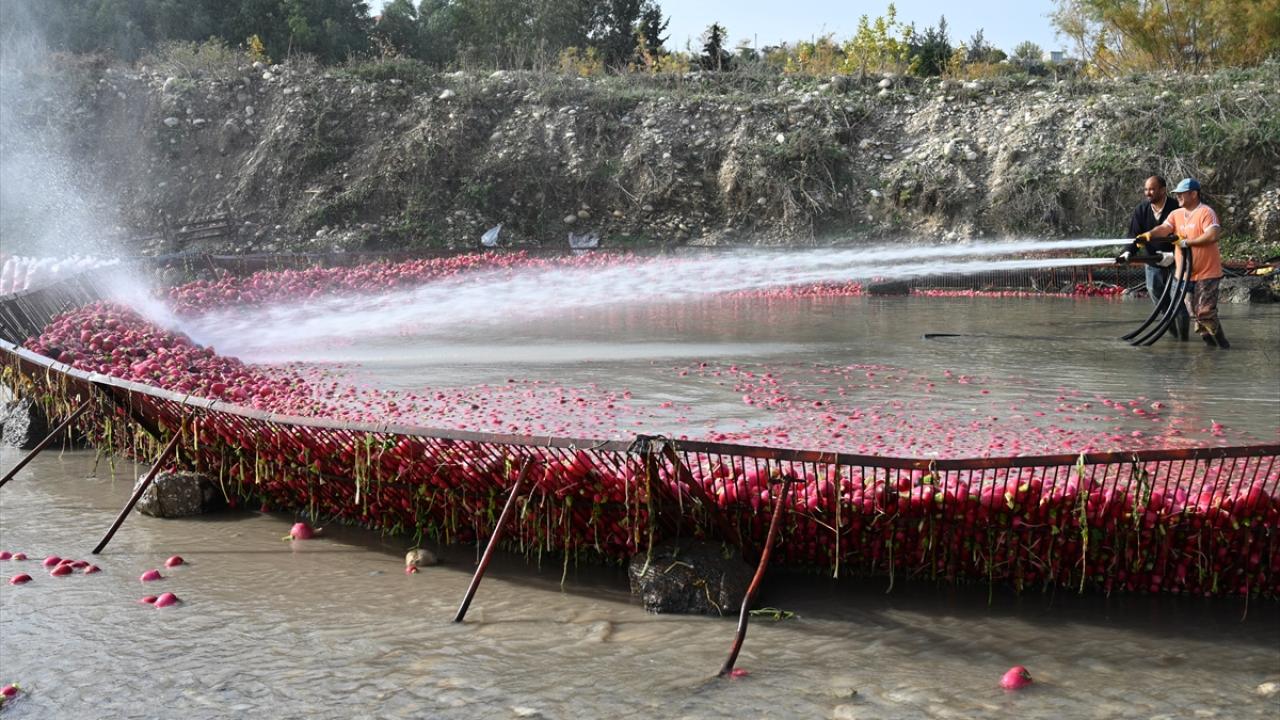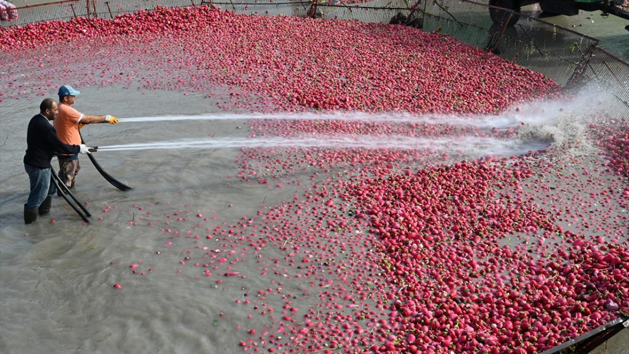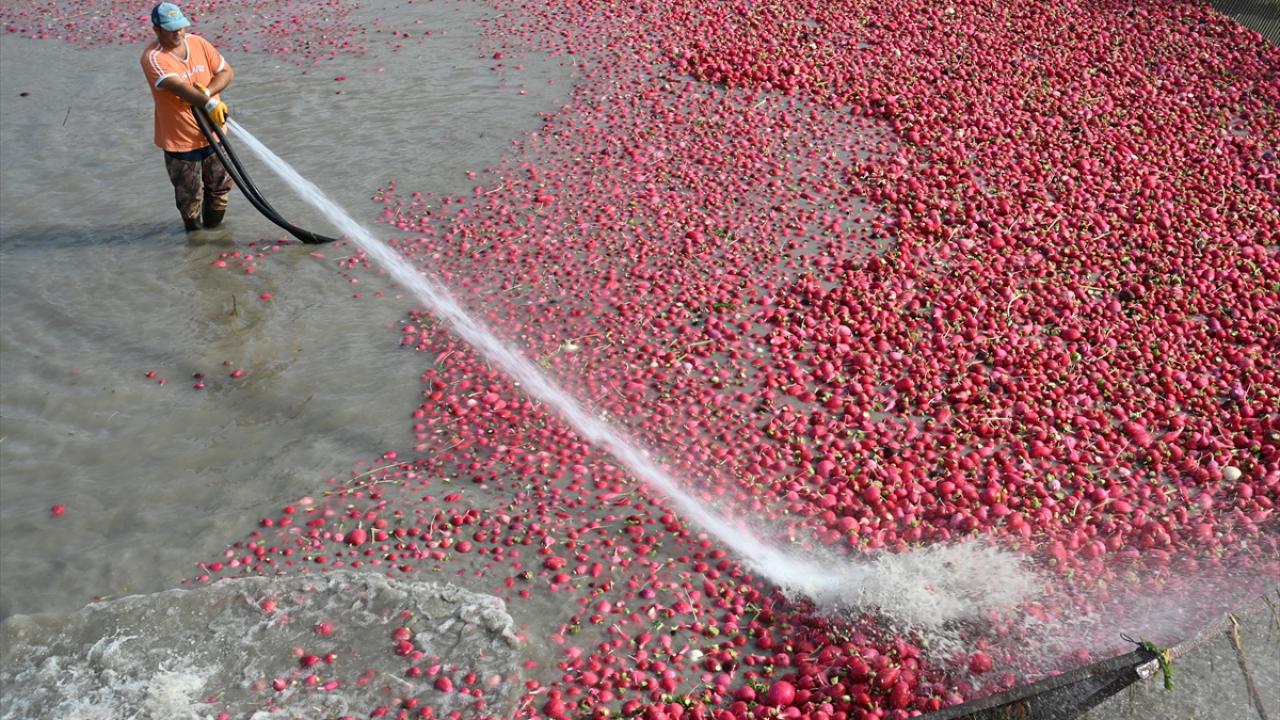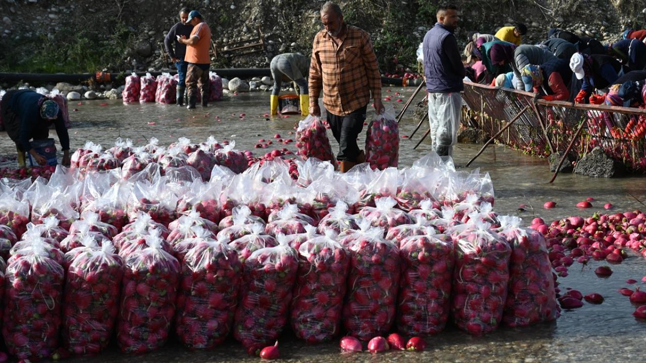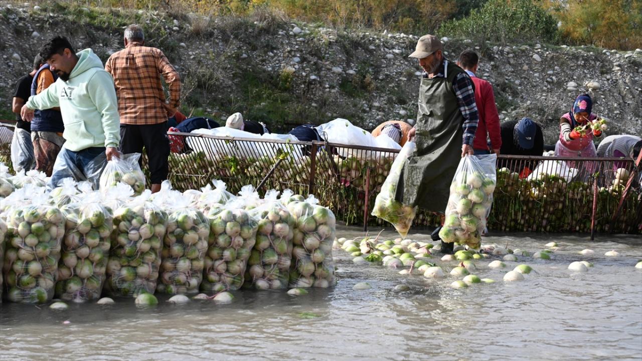 Osmaniye'de coğrafi işaret tescilli Kadirli turpunda hasada başlayan çiftçiler, tüketicilere ulaştıracakları ürünleri çamurdan arındırmak için Savrun Çayı'nın soğuk suyunda el birliğiyle çalışıyor.