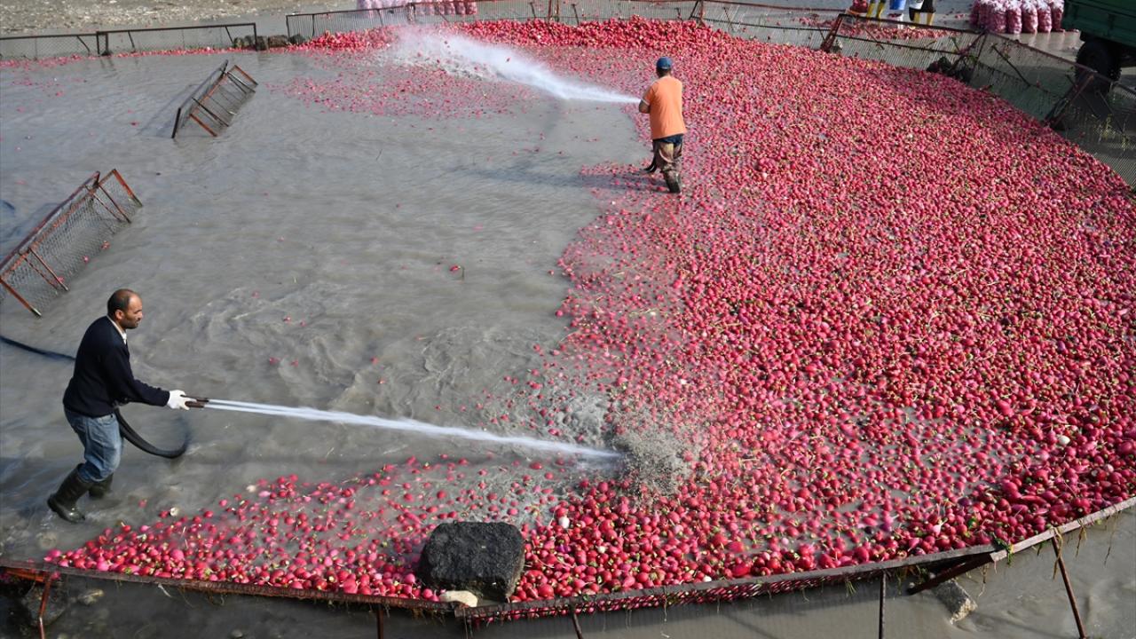 Yetiştirildiği ilçenin adıyla tescillenen kırmızı turplar, hasat edildikten sonra çamurdan arındırılması için Savrun Çayı`na taşınıyor.