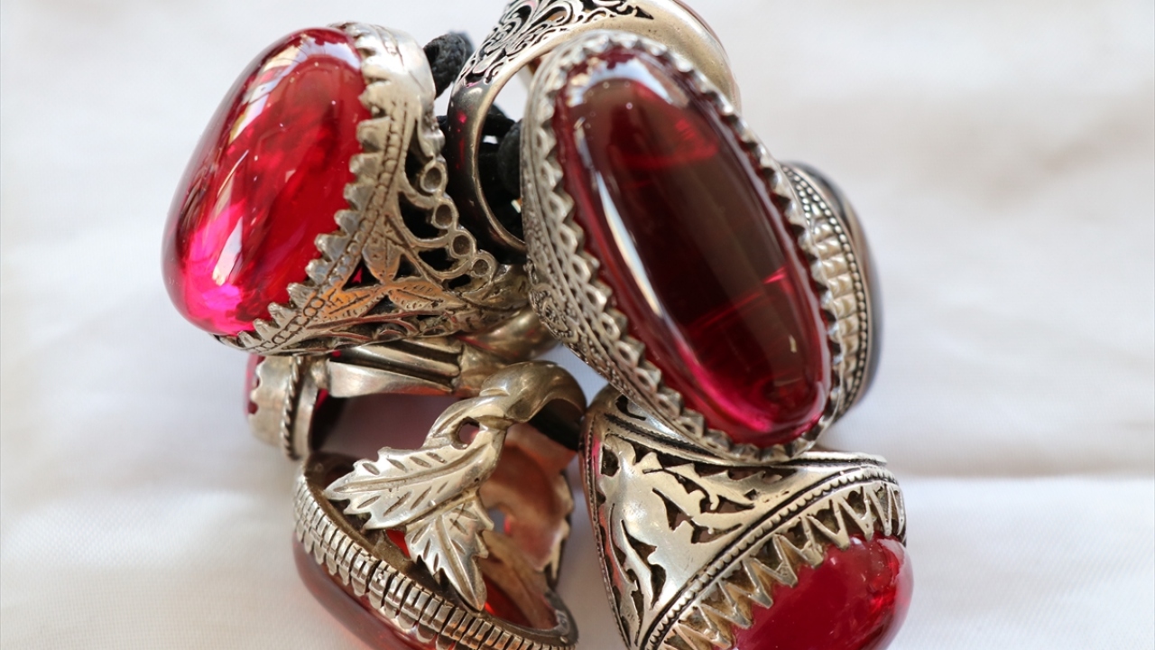 Tezgahlarda sergilenen gümüş tespih başlıkları da ilgi görüyor.