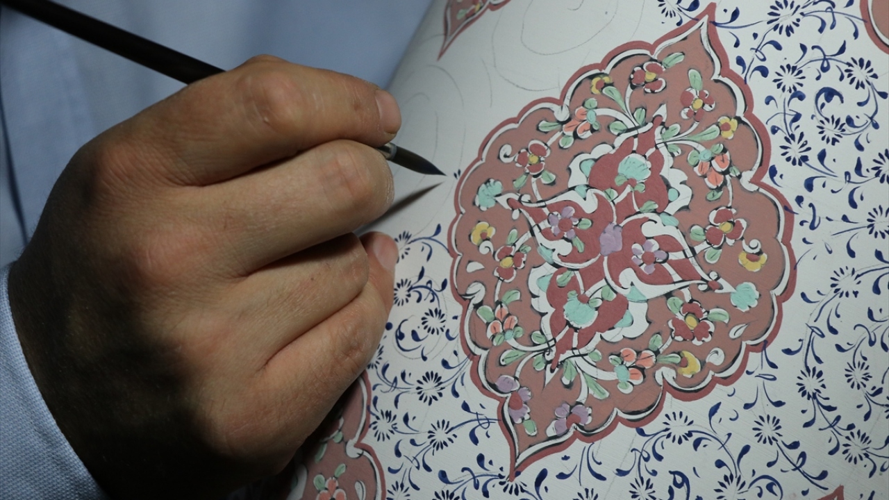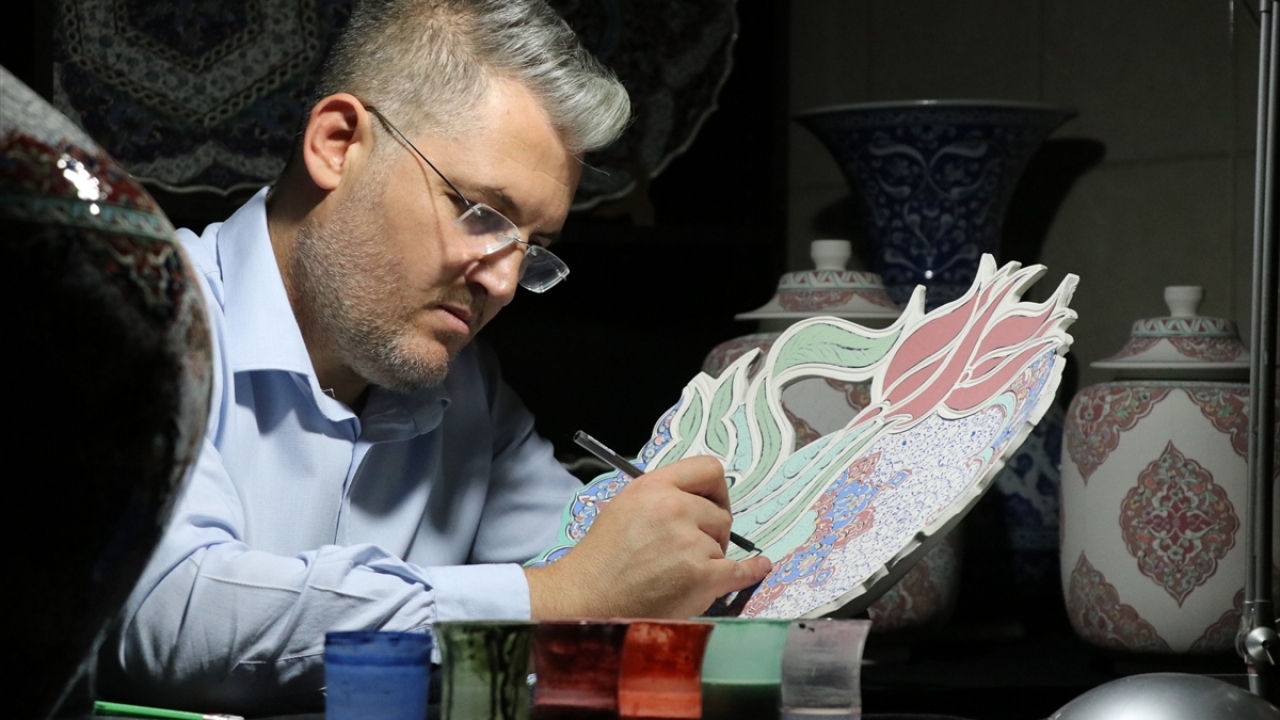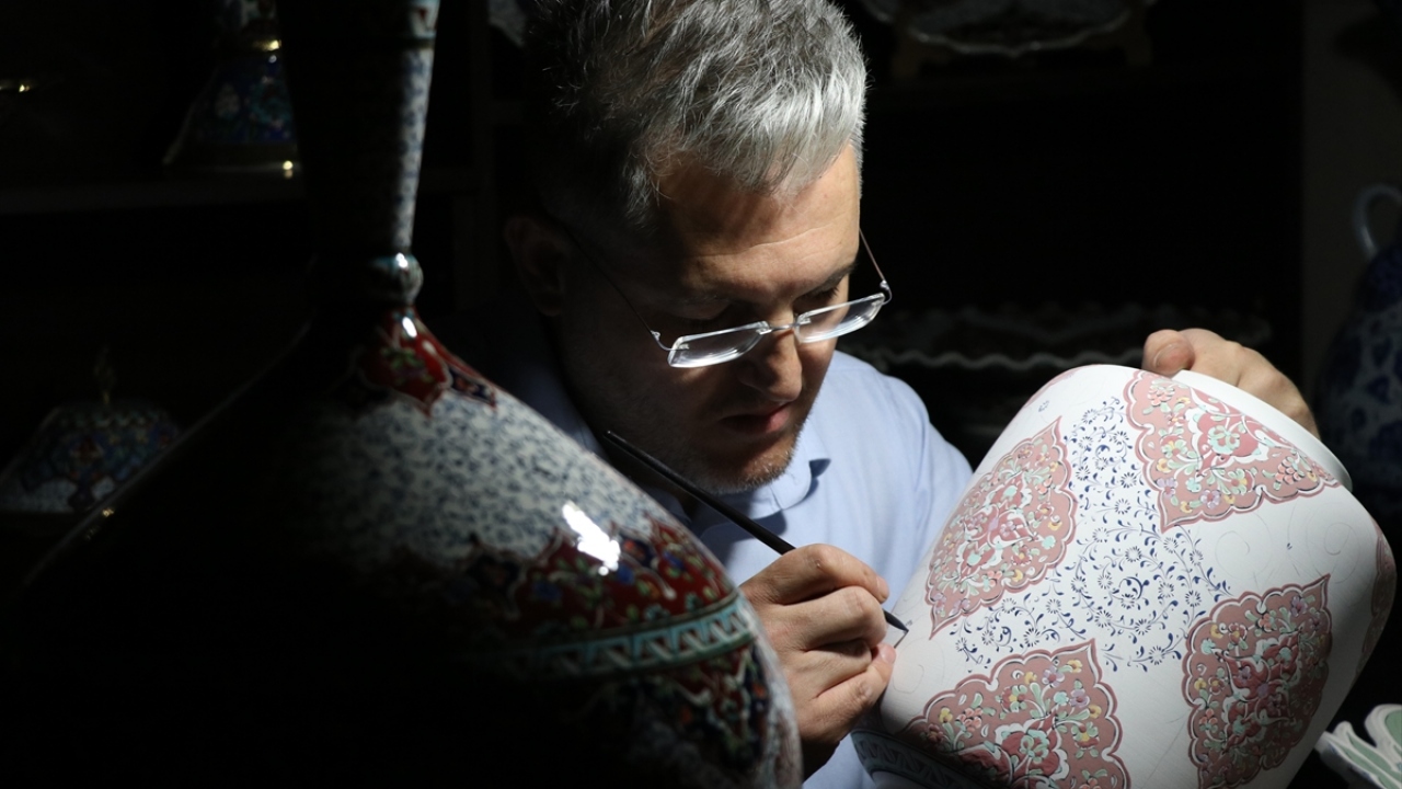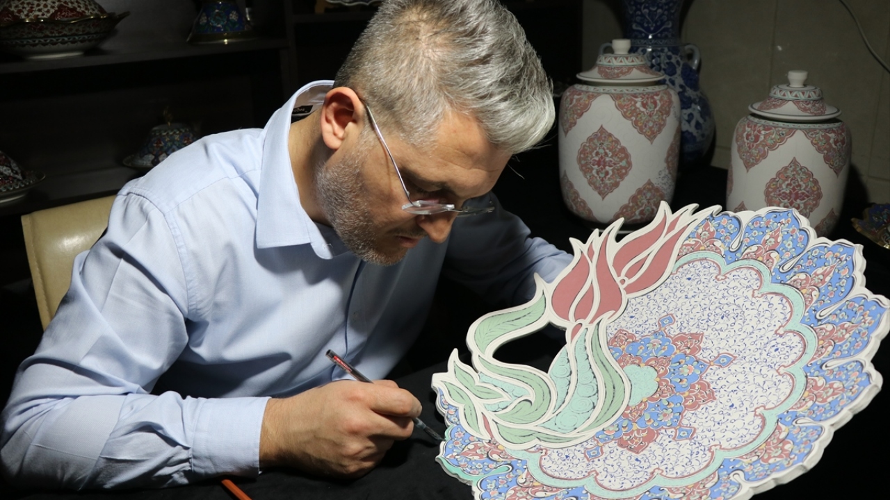 Kütahya'da, el sanatları ustası Mustafa Dumanlar, geleneksel Türk İslam sanatlarından tezhip, kilim motifleri ve Osmanlı dönemi kumaş desenlerini çiniye aktarıyor.