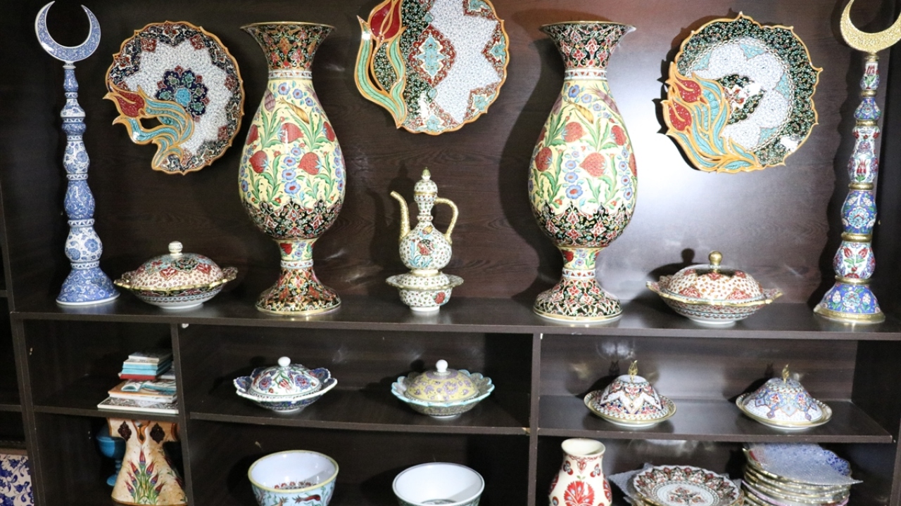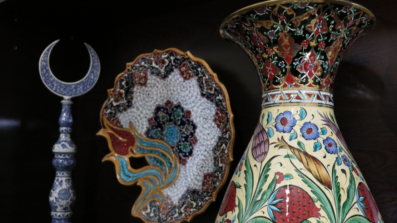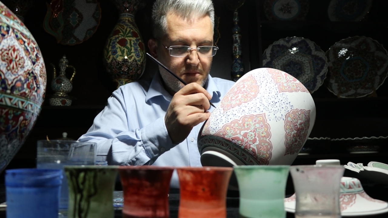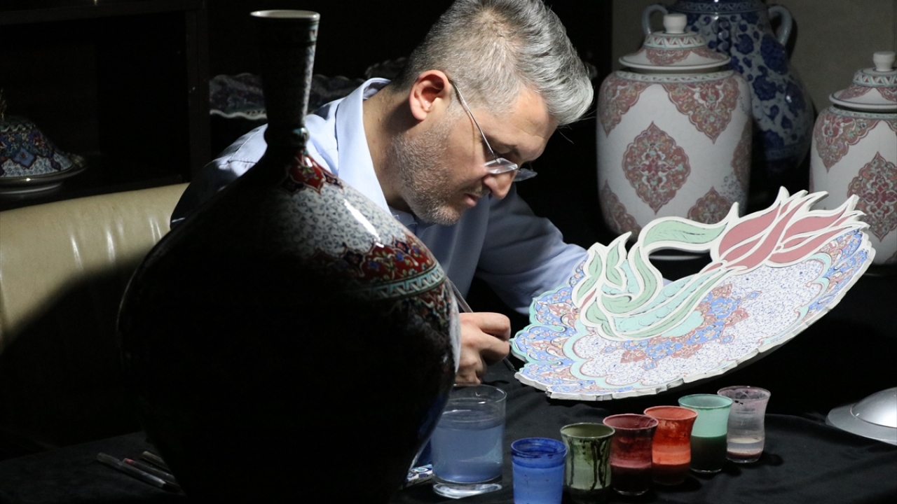 Kütahya'da, el sanatları ustası Mustafa Dumanlar, geleneksel Türk İslam sanatlarından tezhip, kilim motifleri ve Osmanlı dönemi kumaş desenlerini çiniye aktarıyor.
