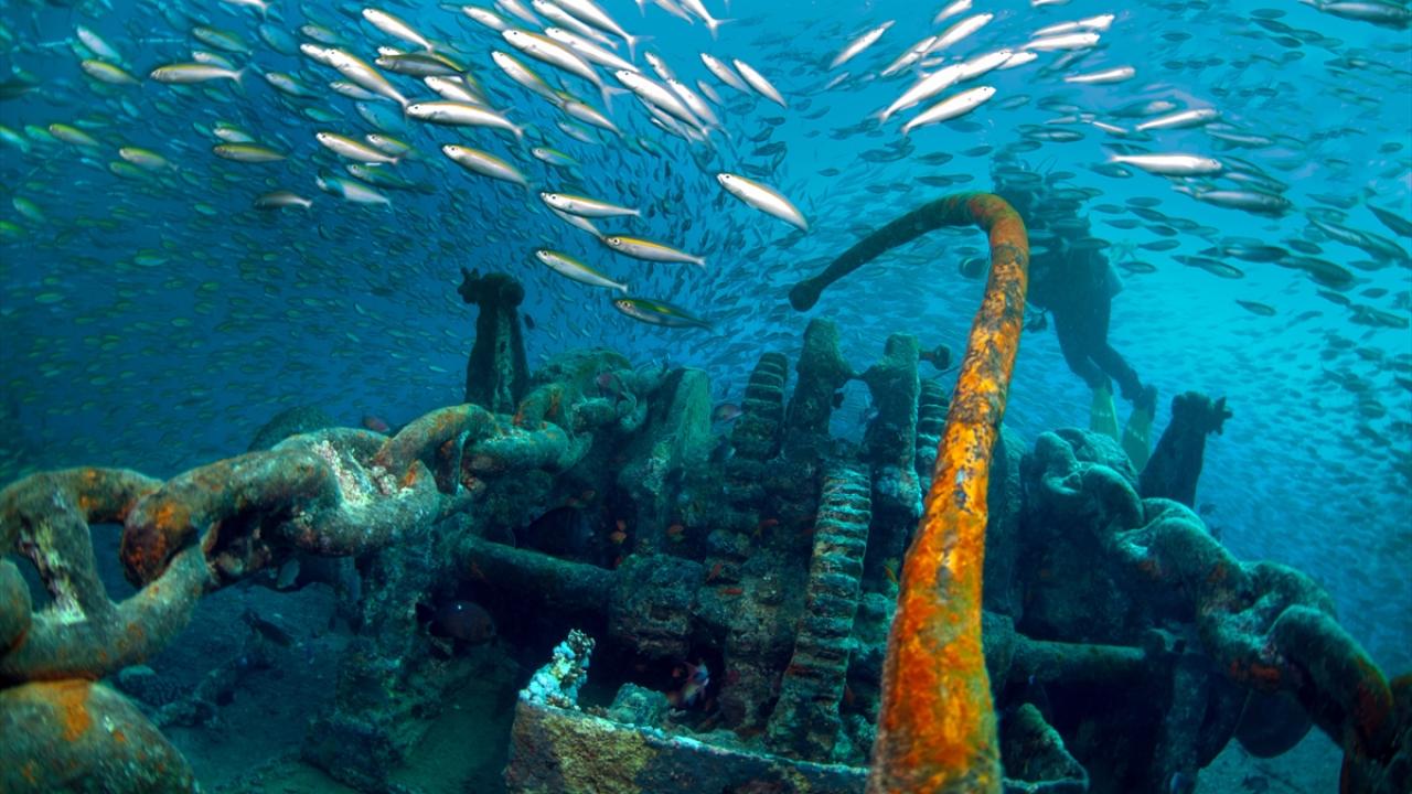 Uçaksavarlardan motosikletlere kadar batığın her köşesine yuva yapmış rengarenk canlılar, gri enkaza adeta hayat katıyor.
