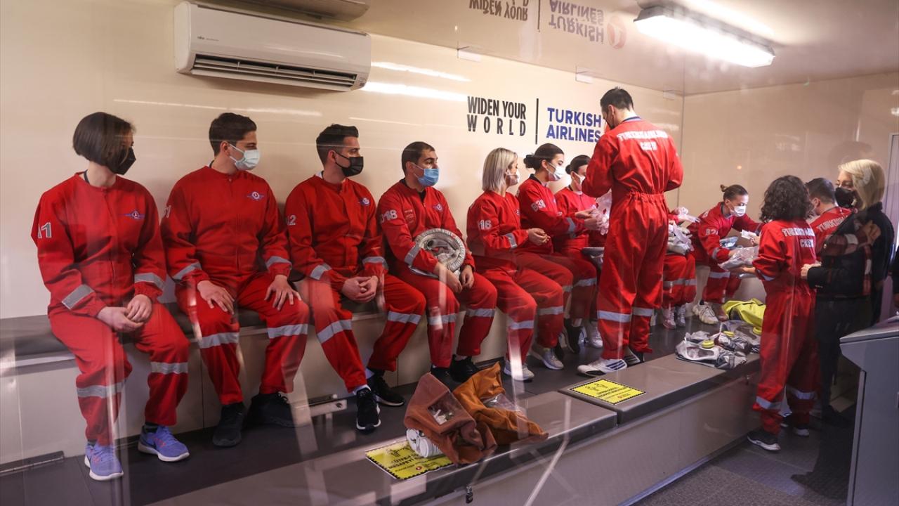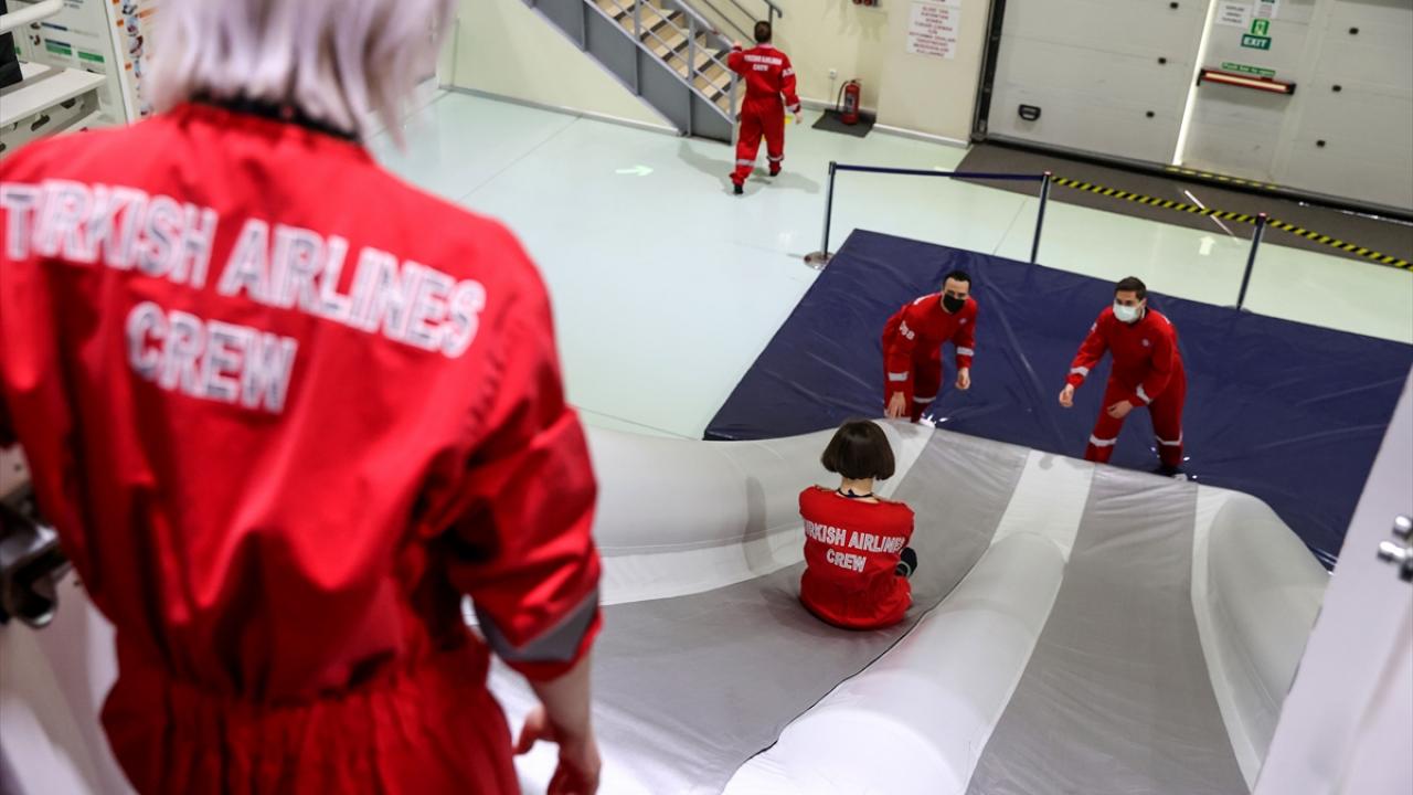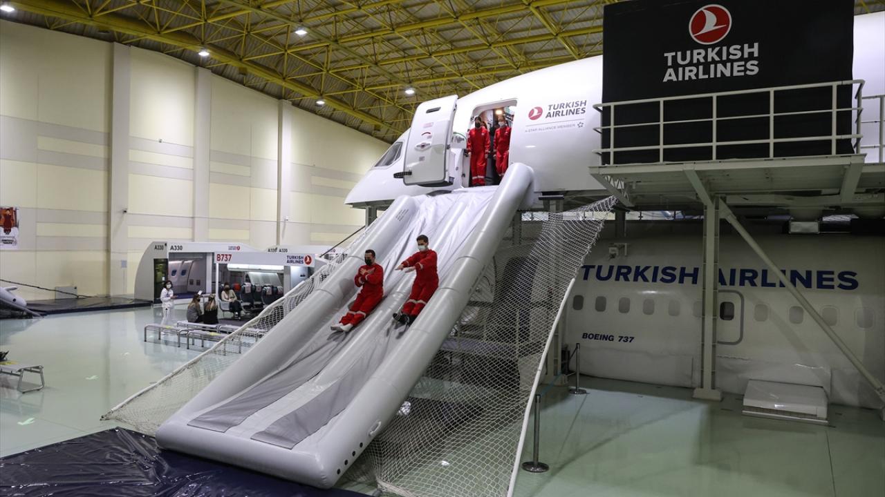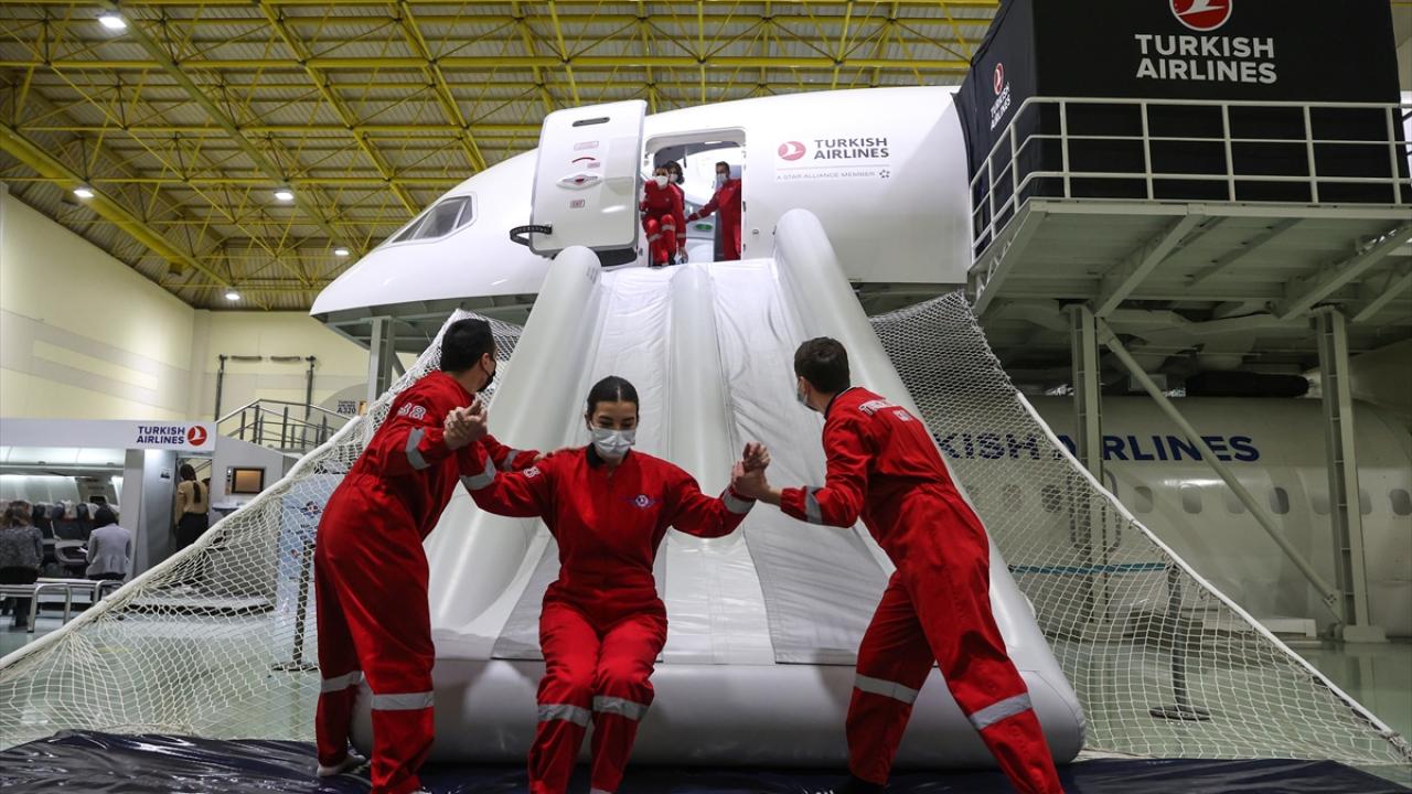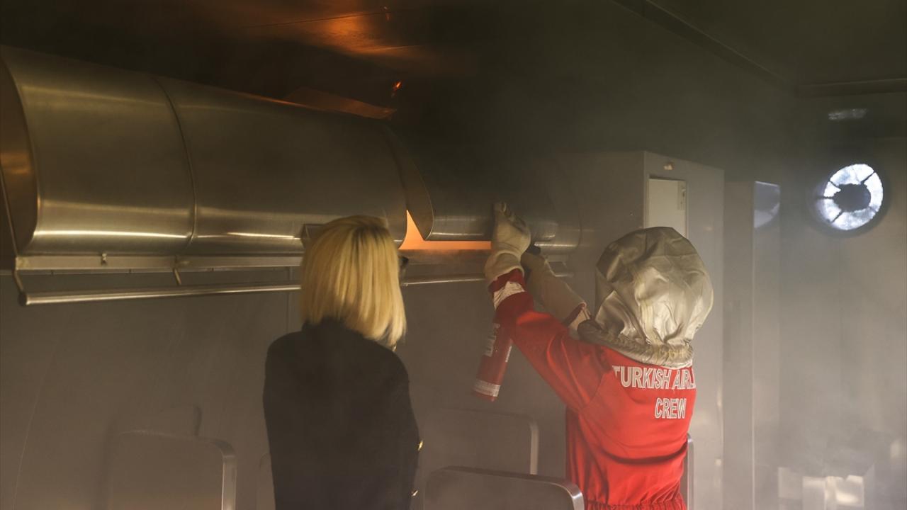 Açıklama sonrasında, THY`de iş başı yapacak kabin ekibinin acil durumda yolcu tahliyesi ve yangınla mücadele senaryosu uygulamalı eğitim olarak gerçekleştirildi.