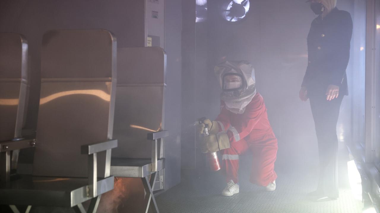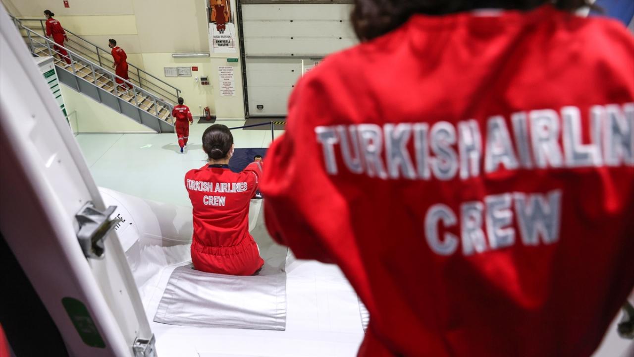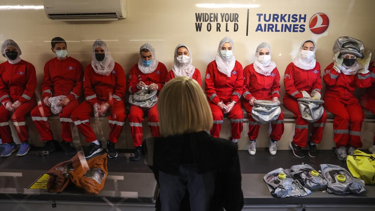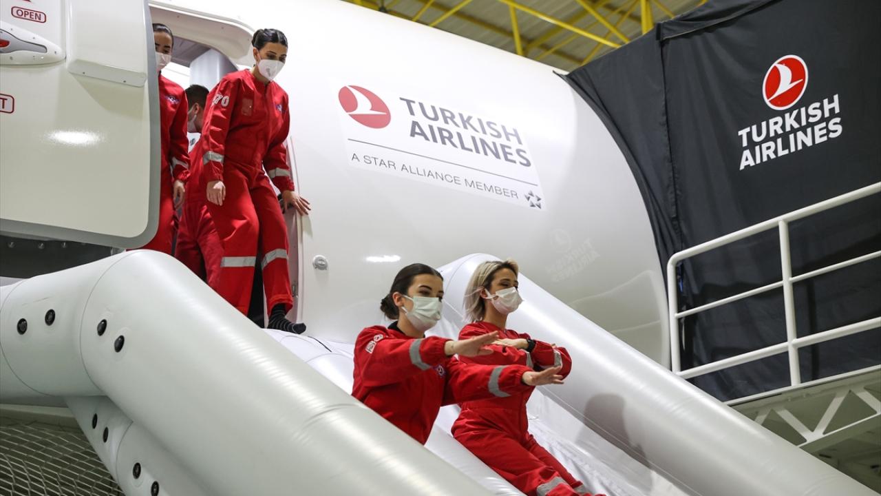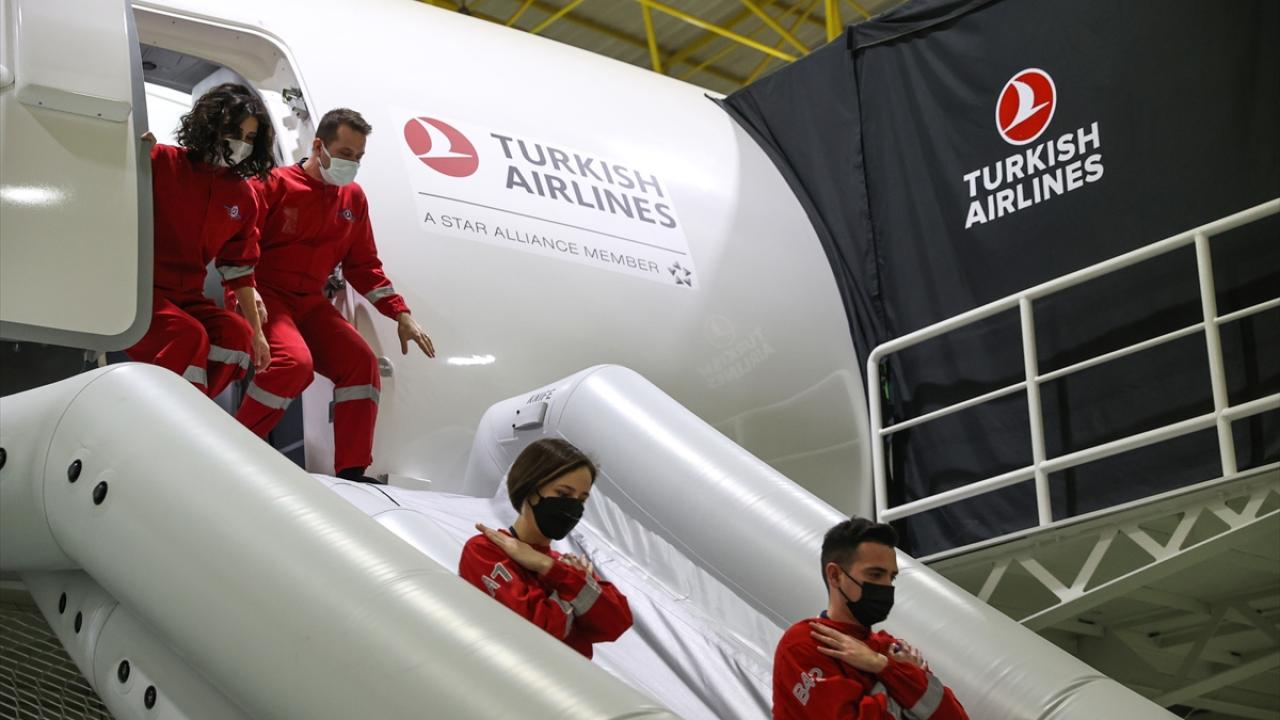 Açıklama sonrasında, THY`de iş başı yapacak kabin ekibinin acil durumda yolcu tahliyesi ve yangınla mücadele senaryosu uygulamalı eğitim olarak gerçekleştirildi.