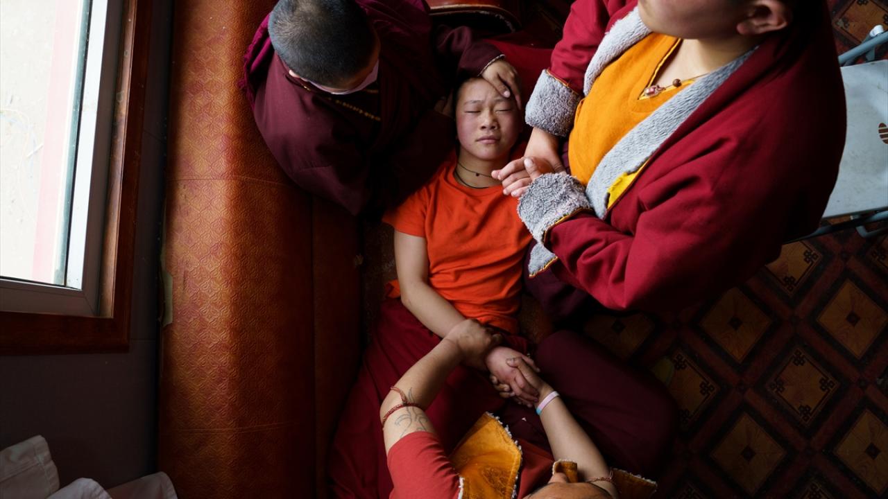 Tibetli genç kız geçirdiği epilepsi krizi sırasında tedavi görüyor.