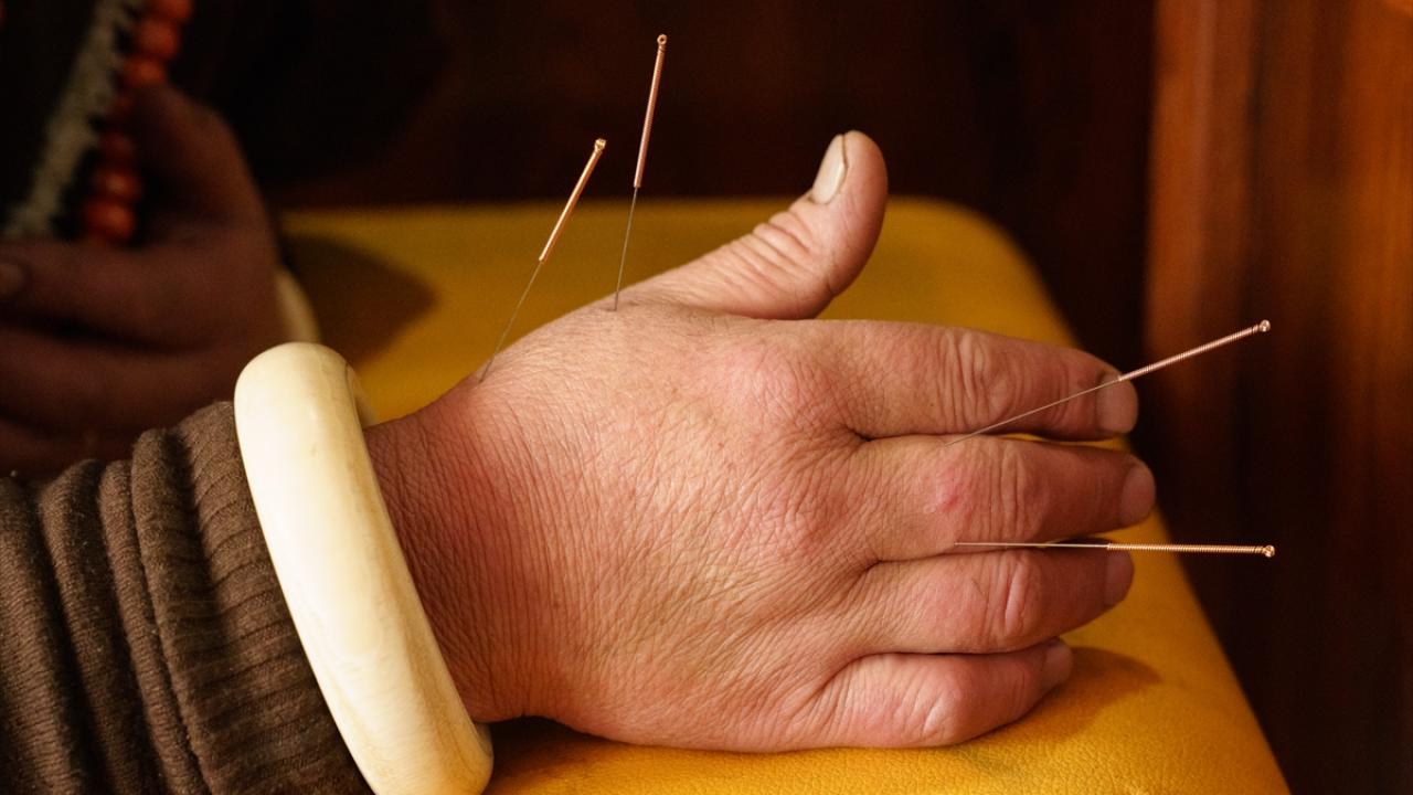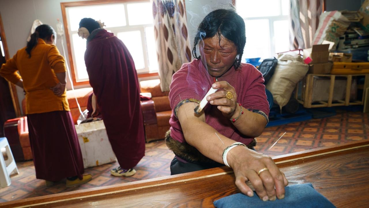 Tibetli bir kadına sağ elindeki ağrı ve kan dolaşımı şikayeti üzerine akupunktur tedavisi uygulanıyor.