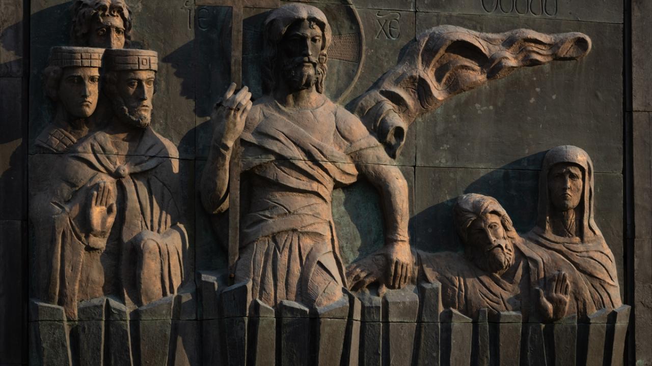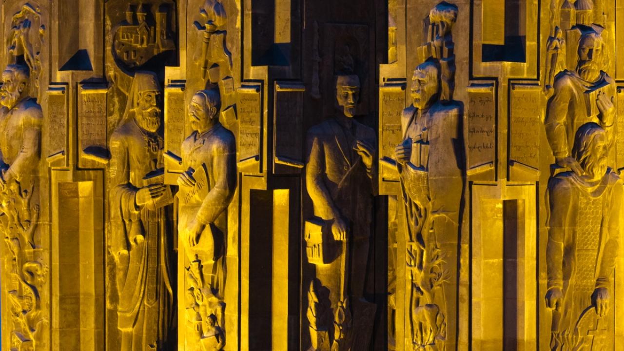 16 sütundan oluşan anıtın üst bölümünde Gürcü tarihinden krallar, kraliçeler ve kahramanlar yer alıyor.