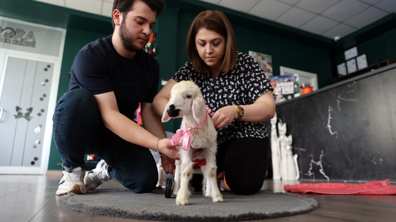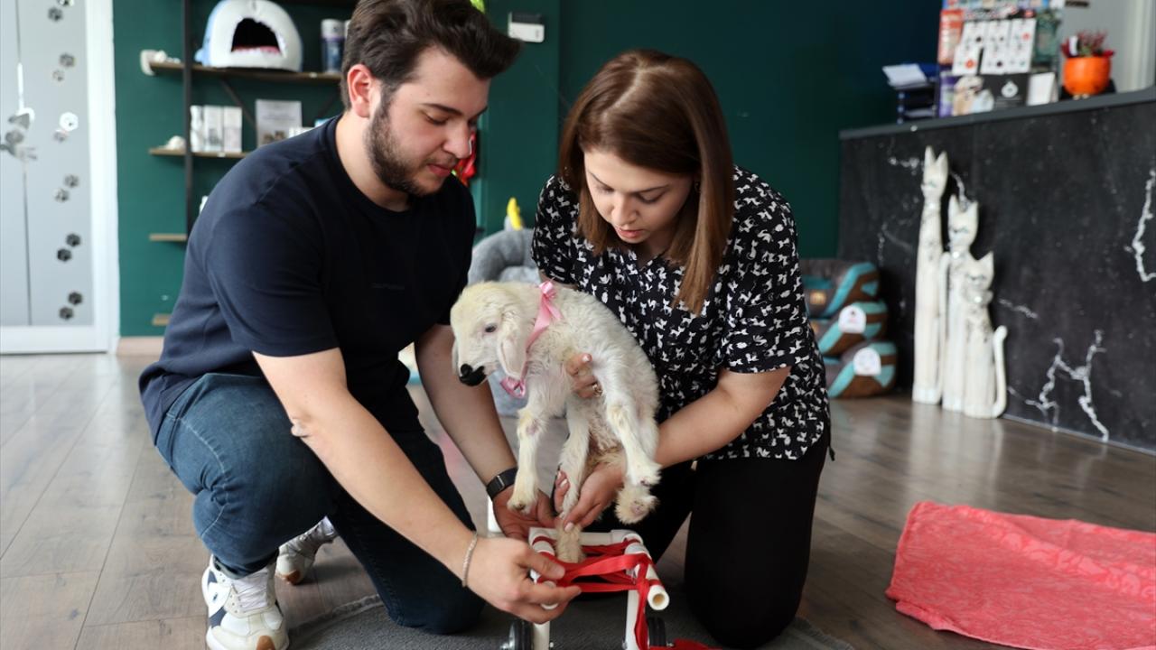 Sivas'ta bir veteriner, ayaklarında tırnak oluşmadığı için yürüyemeyen ve sahibinin "Pamuk" adını verdiği 15 günlük kuzuyu plastik su borularından tasarlanan yürüteç yardımıyla yürüttü.