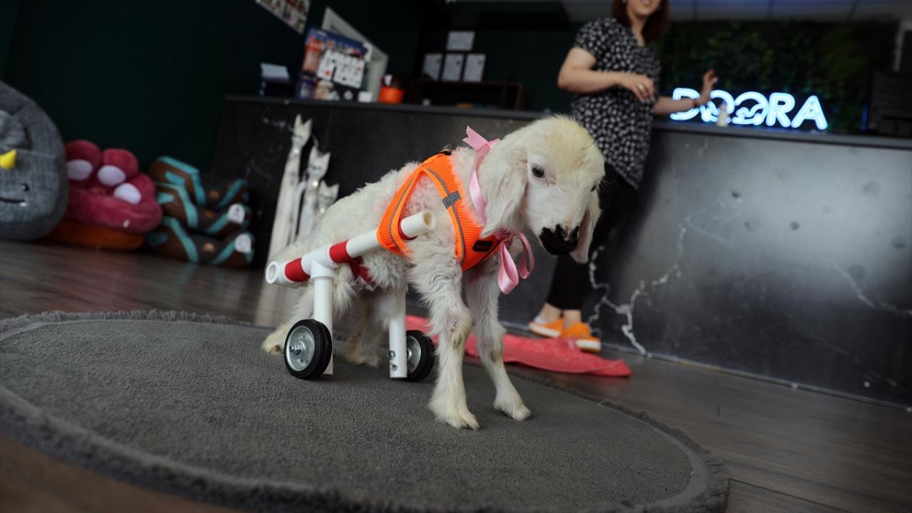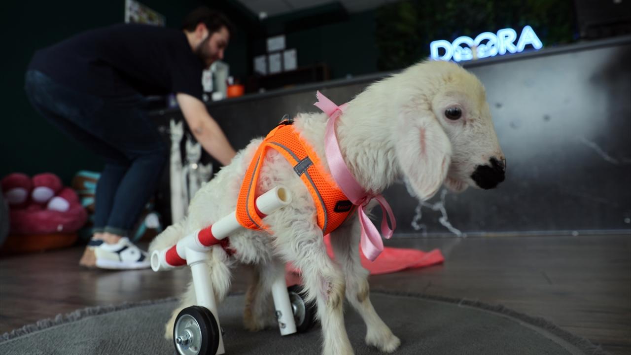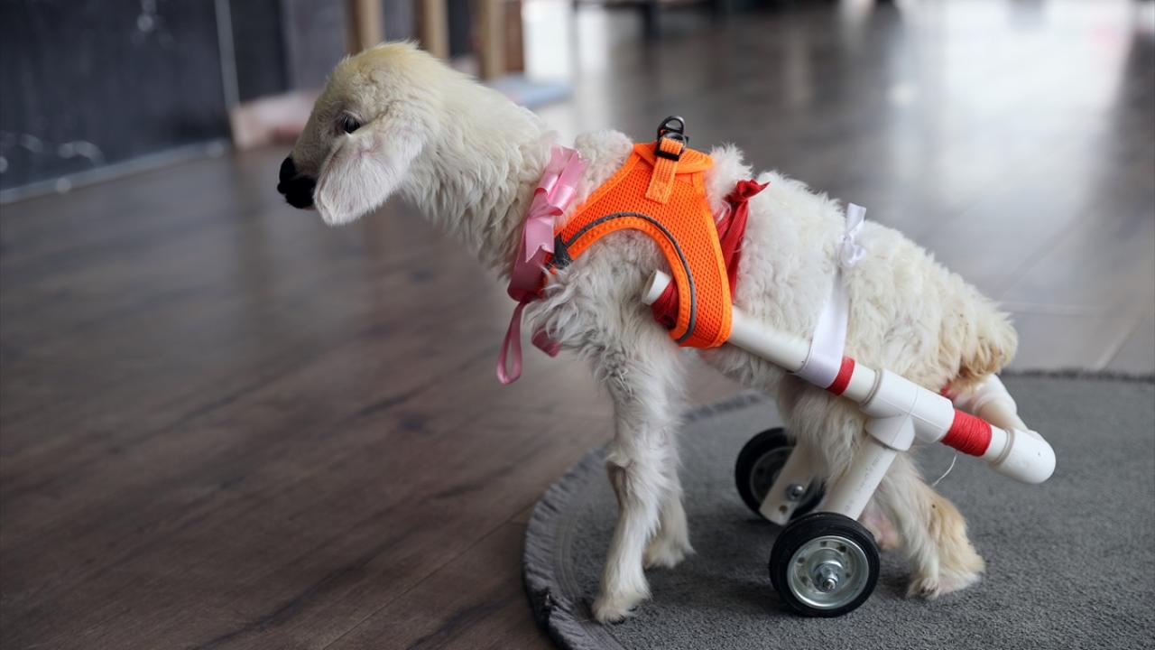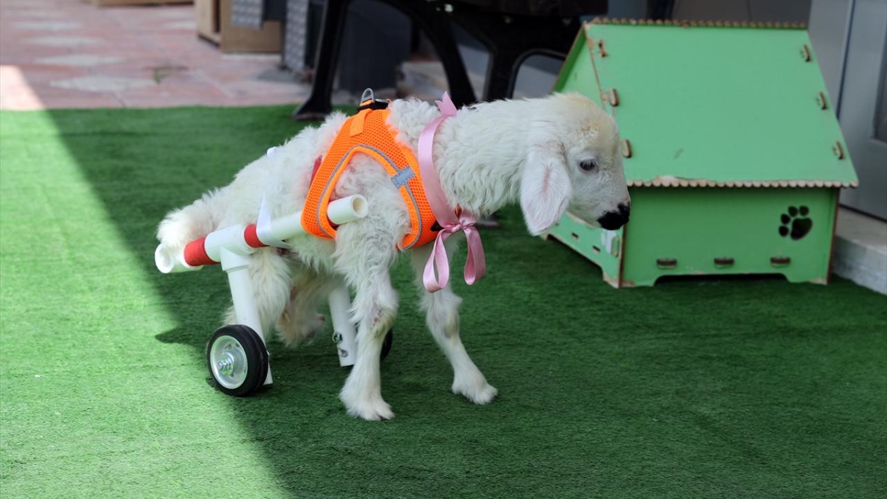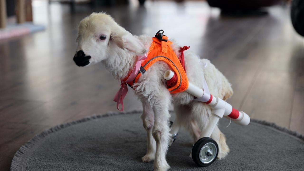 Pamuk`un durumundan etkilenen Yıldırım, daha önce felçli bir kedi için tasarlattığı su boruları ve tekerlekten oluşan yürüteci kullanarak kuzunun yürümesini sağladı.