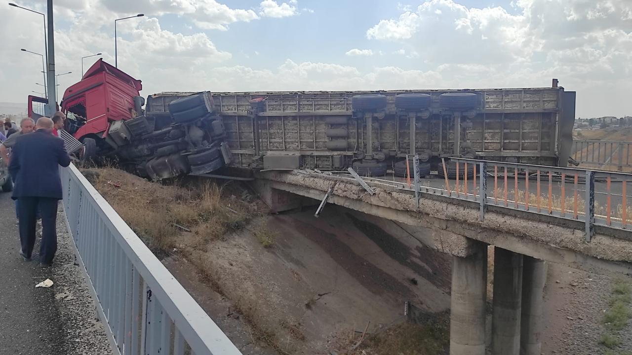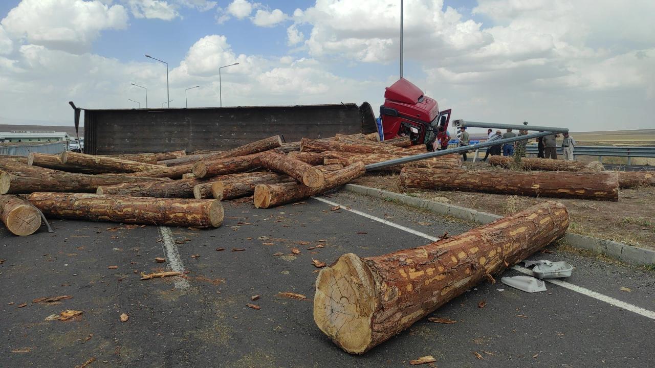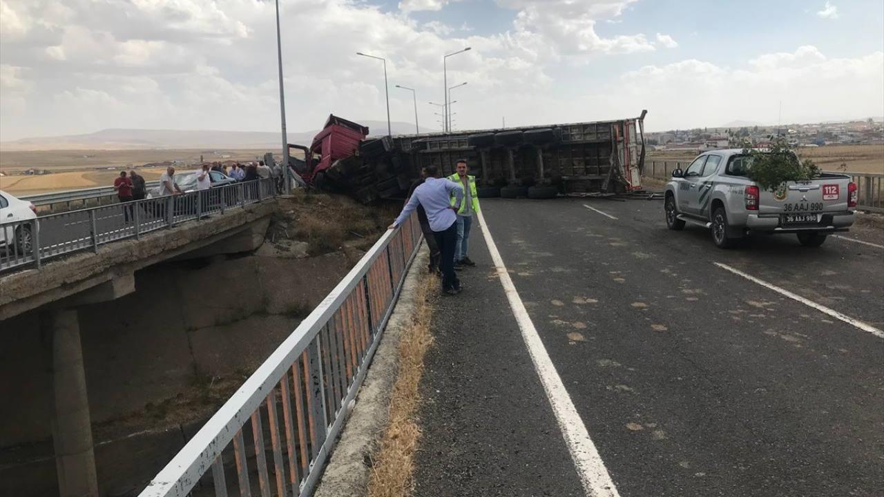 Ardahan`ın Göle ilçesinden Kars`ın Digor ilçesine giden İbrahim A. idaresindeki 25 ABG 077 plakalı tomruk yüklü tır, Kars-Erzurum kara yolunun Bakü-Tiflis-Kars Demiryolu Hattı`nın geçtiği köprüde devrildi.
