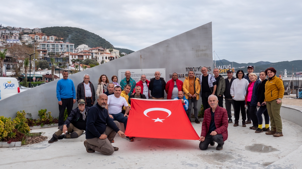 Limanağzı sırtlarında yer alan Topçu Mevzii`de son bulan yürüyüş sonrası grup Kaş İlçe merkezinde yer alan Topçu Yüzbaşı Mustafa Aker anıtını ziyaret etti.