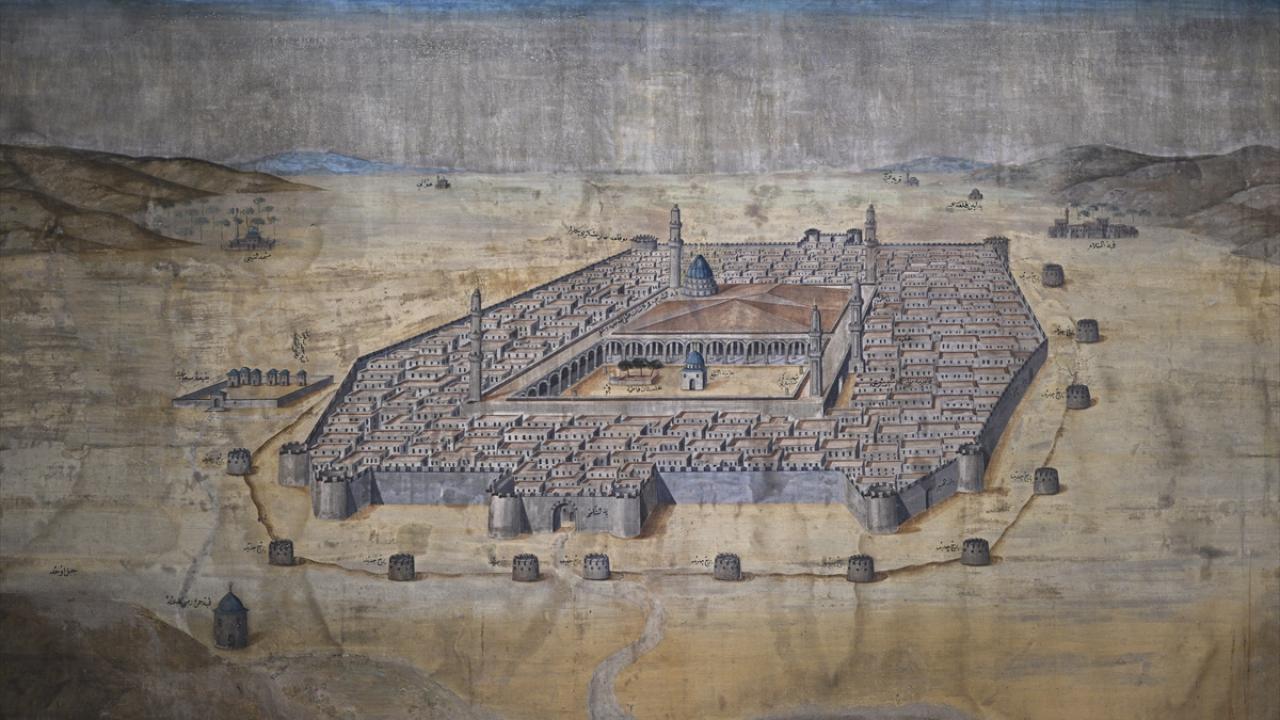 Medine temalı eserin ise ressamı ve yapım tarihi net olarak bilinmiyor. 19. yüzyıla ait olduğu tahmin edilen tablonun üzerinde minyatür ve hat yazı sanatından örnekler yer alıyor.