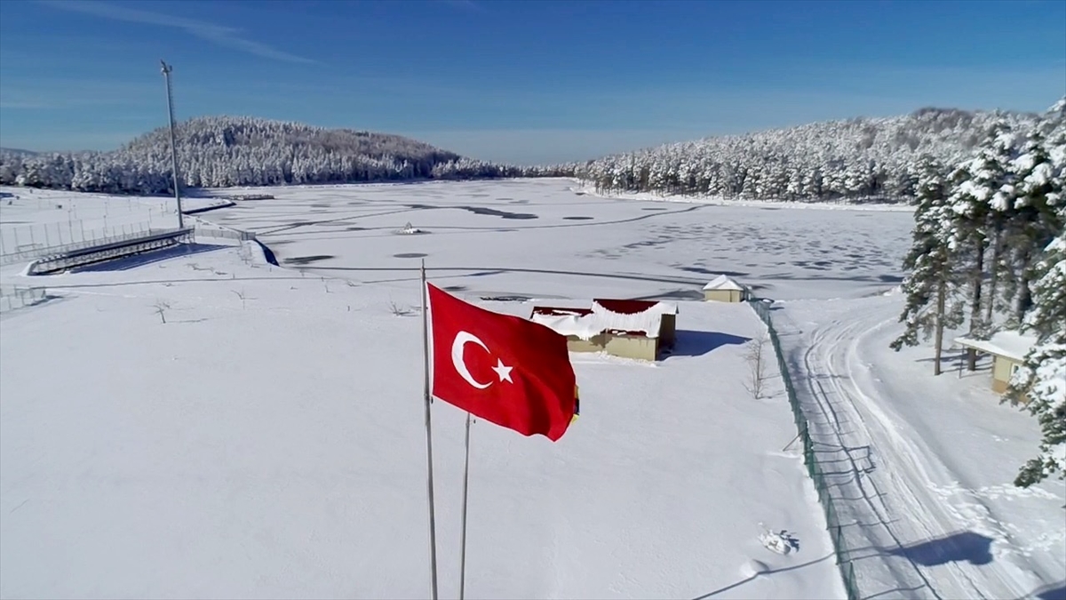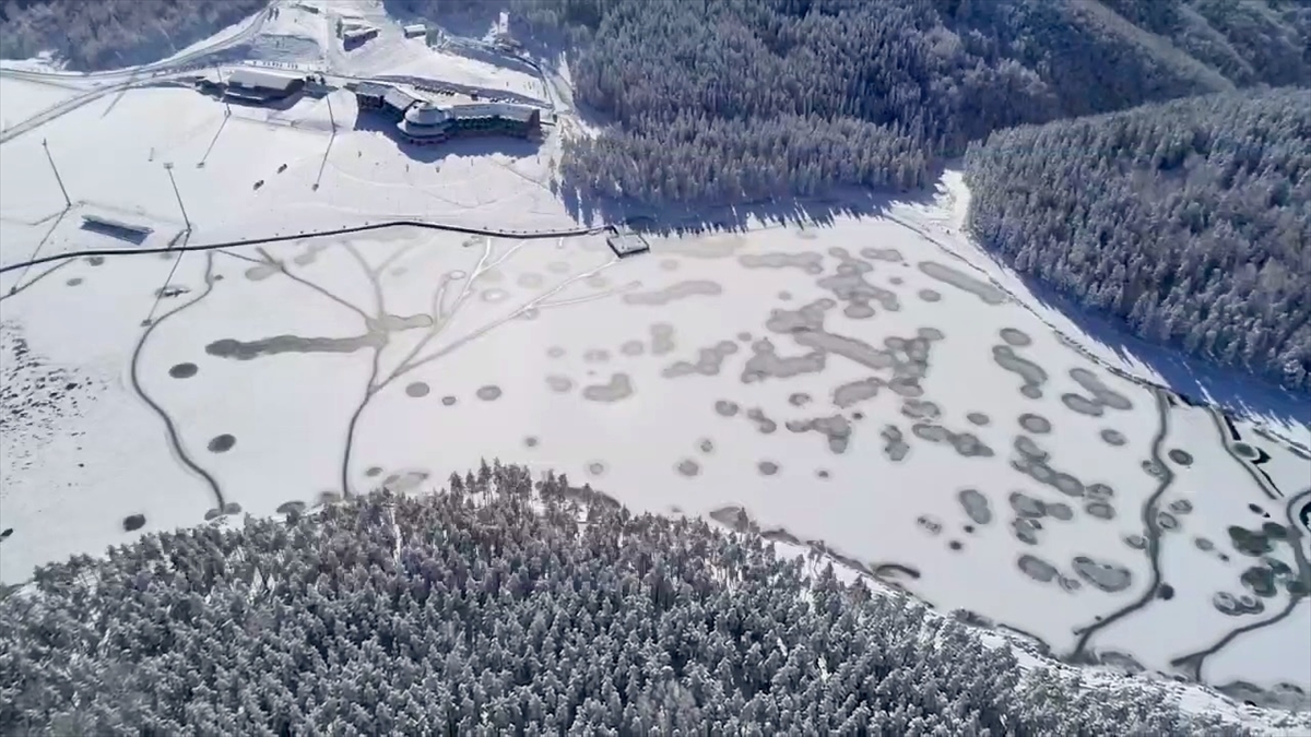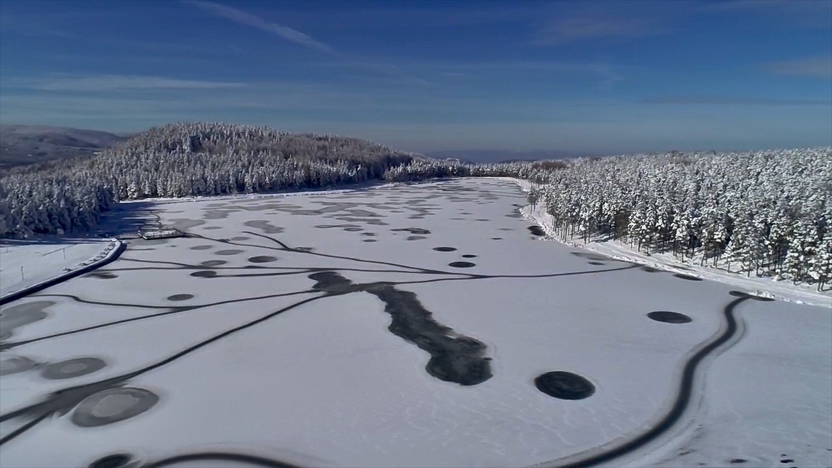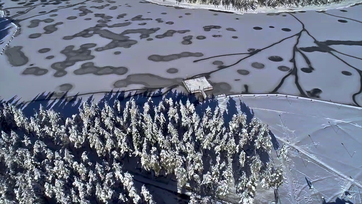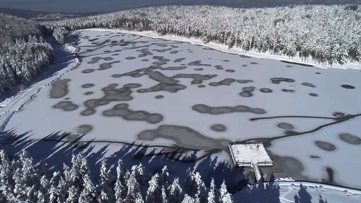 Düzce'nin Kaynaşlı ilçesinde doğal güzellikleriyle ünlü Topuk Yaylası'ndaki göletin yüzeyi buz tuttu. Olta balıkçılığının yapıldığı gölette, aynalı sazan, kadıncık ve Hollanda Sarısı gibi balık türleri yaşıyor.