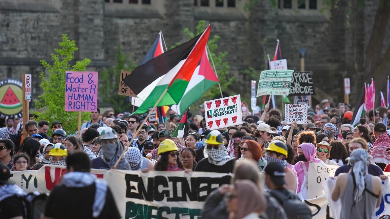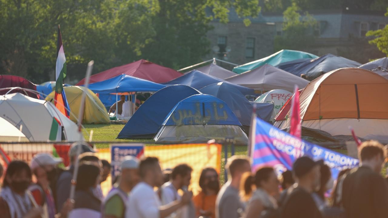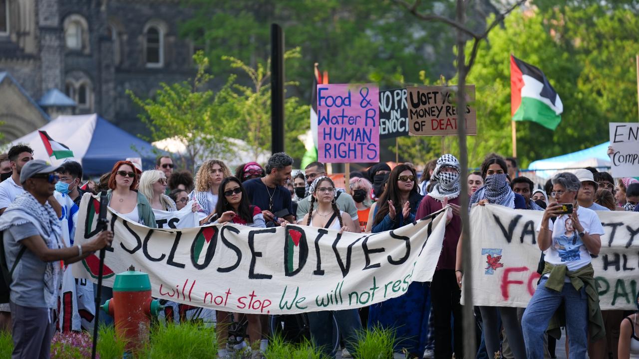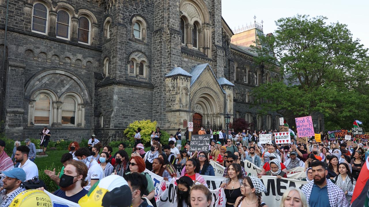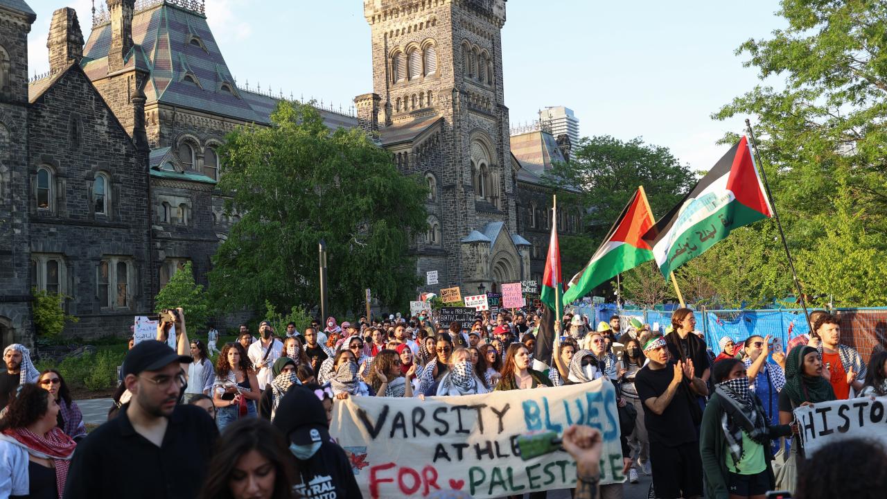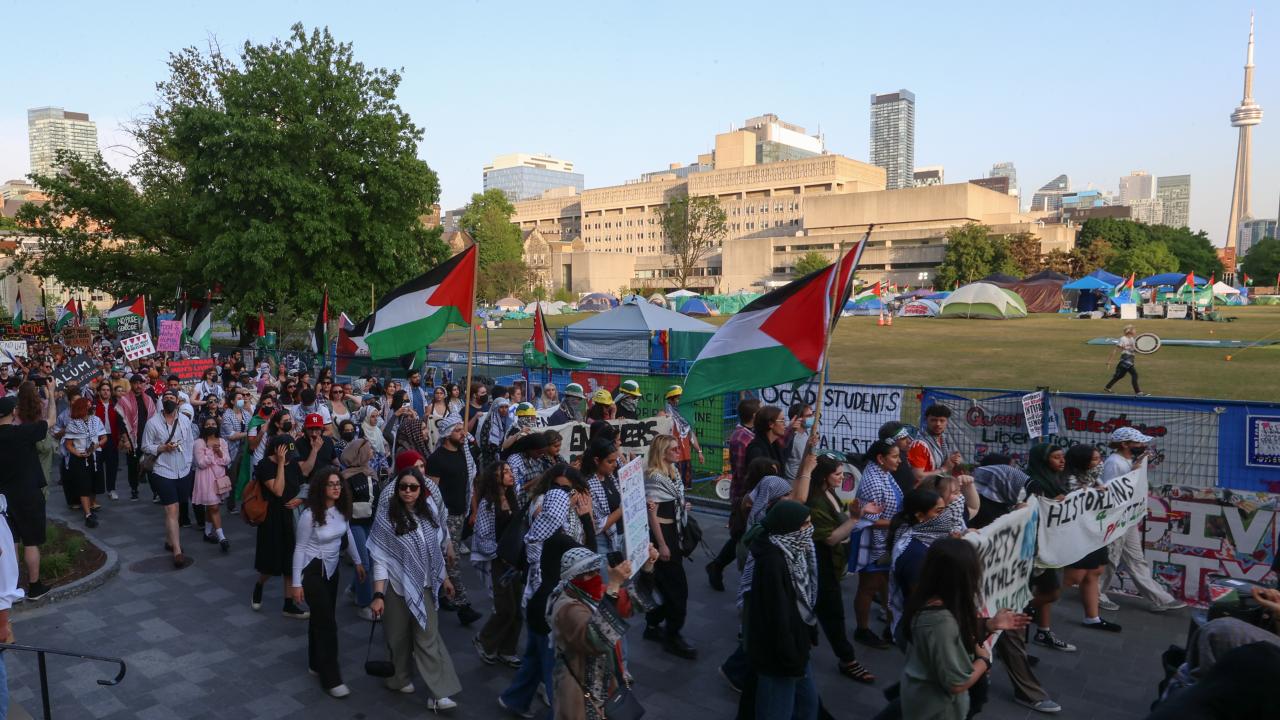 Kanada'nın Toronto kentinde Filistin'e destek ve üniversitenin İsrailli şirketlerle ilişkilerini kesmesini talep eden Toronto Üniversitesi öğrencileri King’s College Circle'da kurulan kamp etrafında yürüyüş düzenledi.