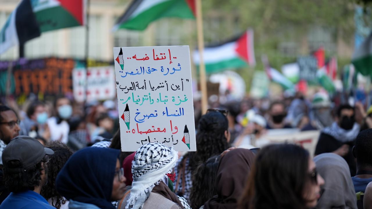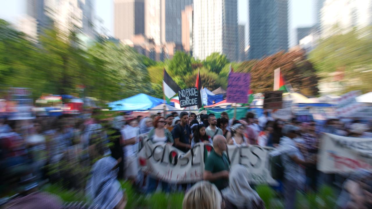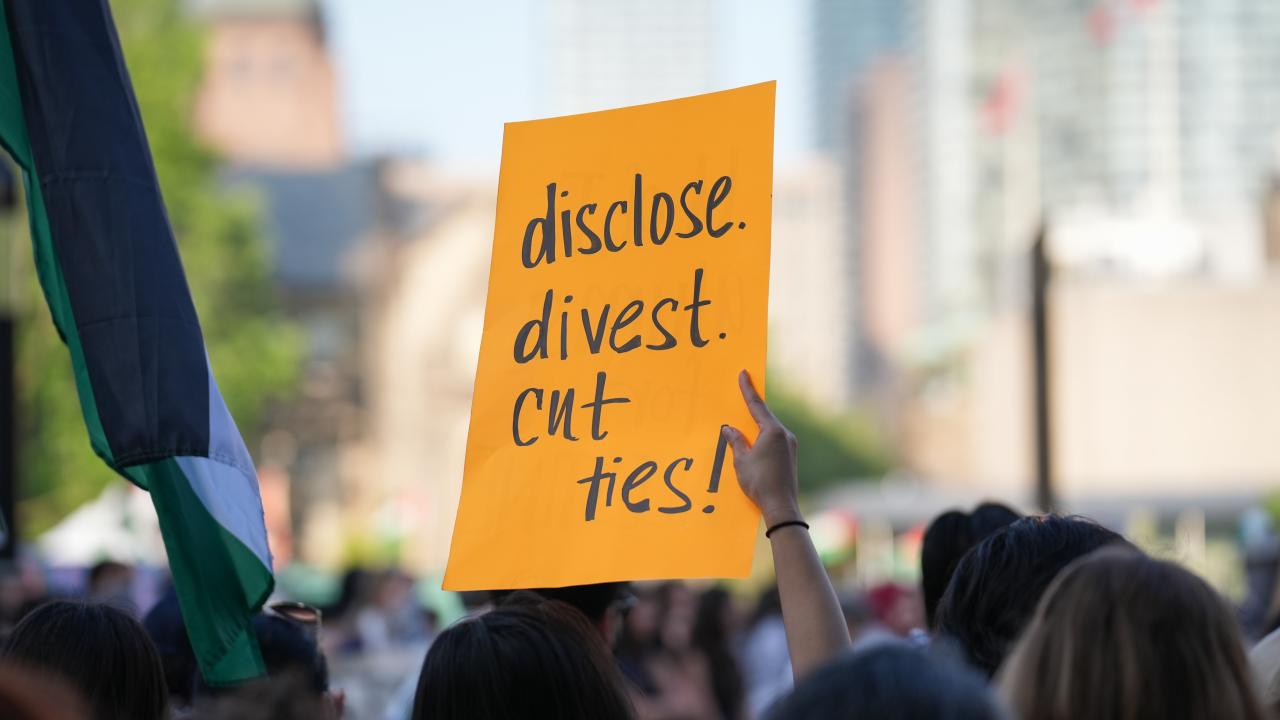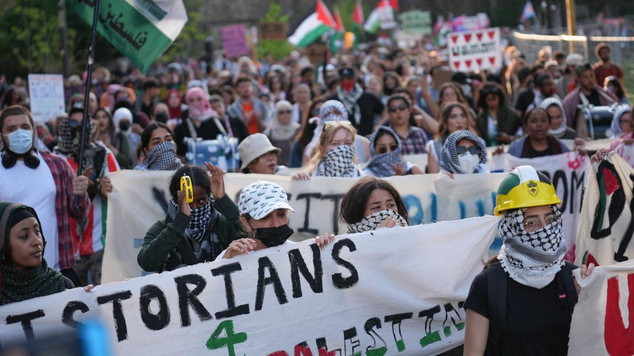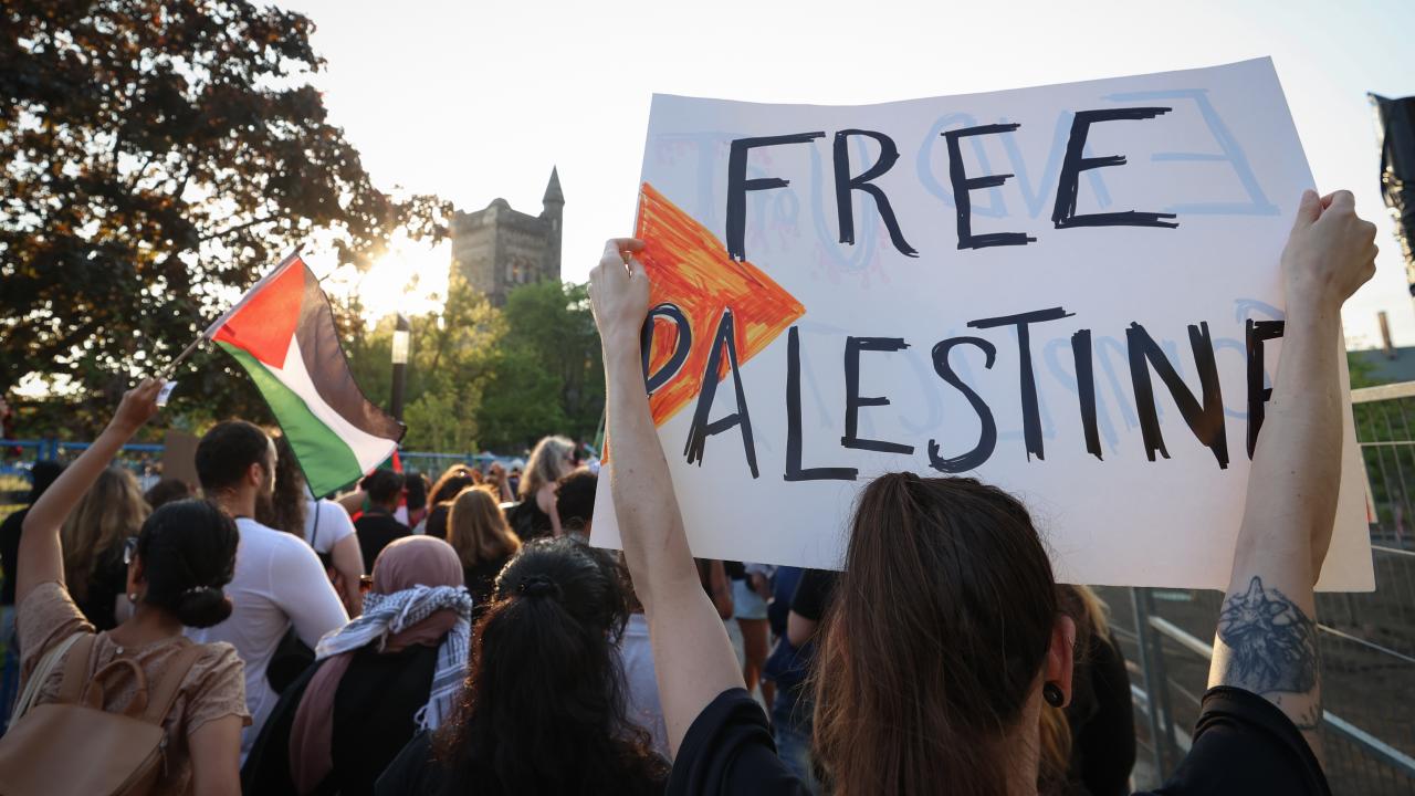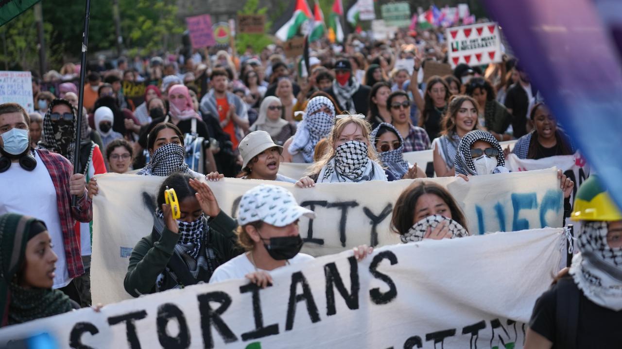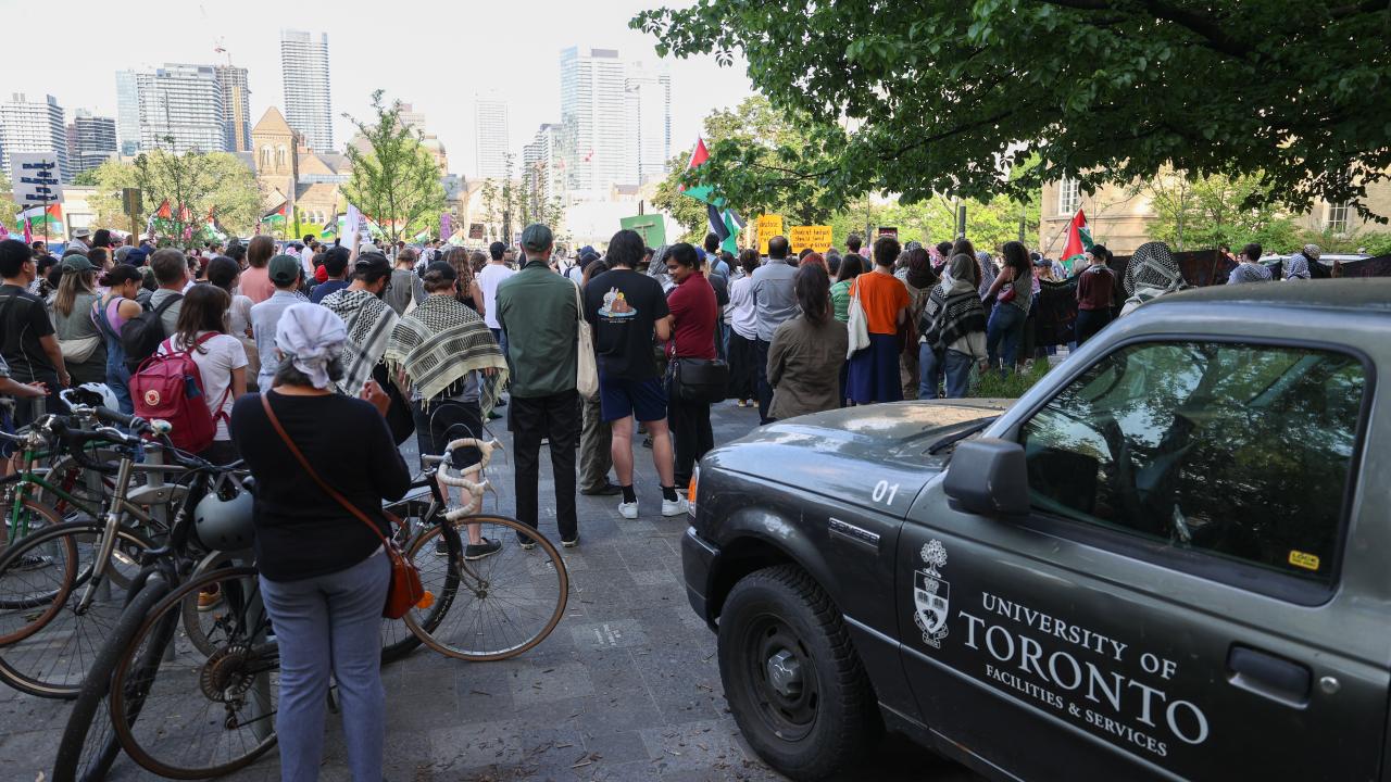 Kanada'nın Toronto kentinde Filistin'e destek ve üniversitenin İsrailli şirketlerle ilişkilerini kesmesini talep eden Toronto Üniversitesi öğrencileri King’s College Circle'da kurulan kamp etrafında yürüyüş düzenledi.
