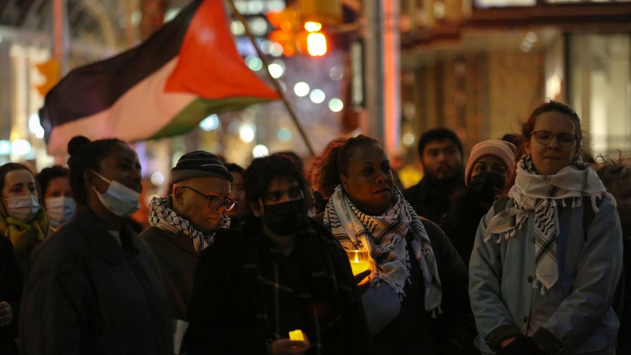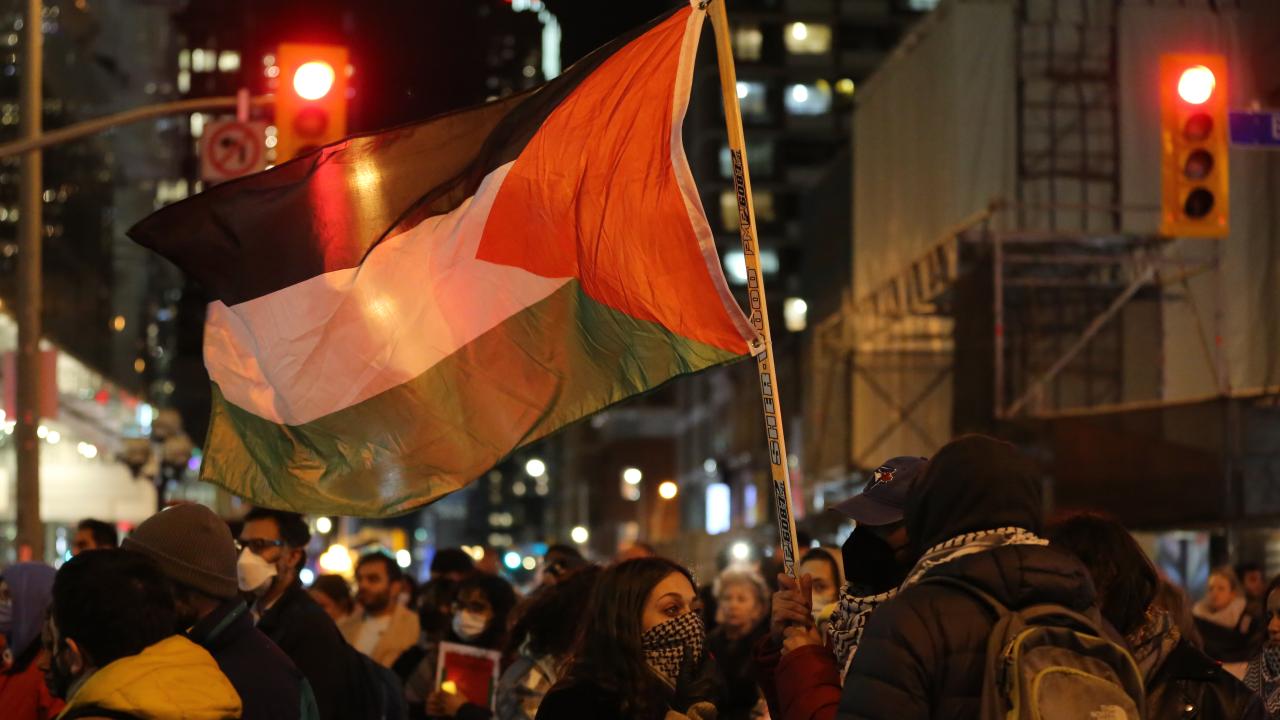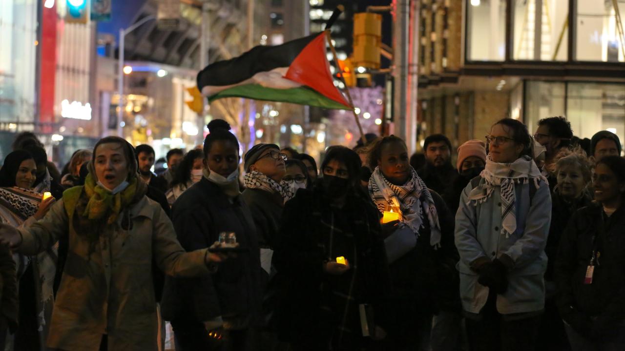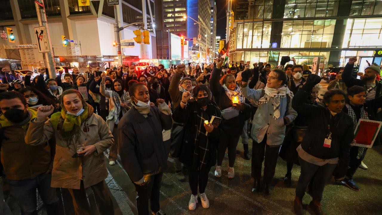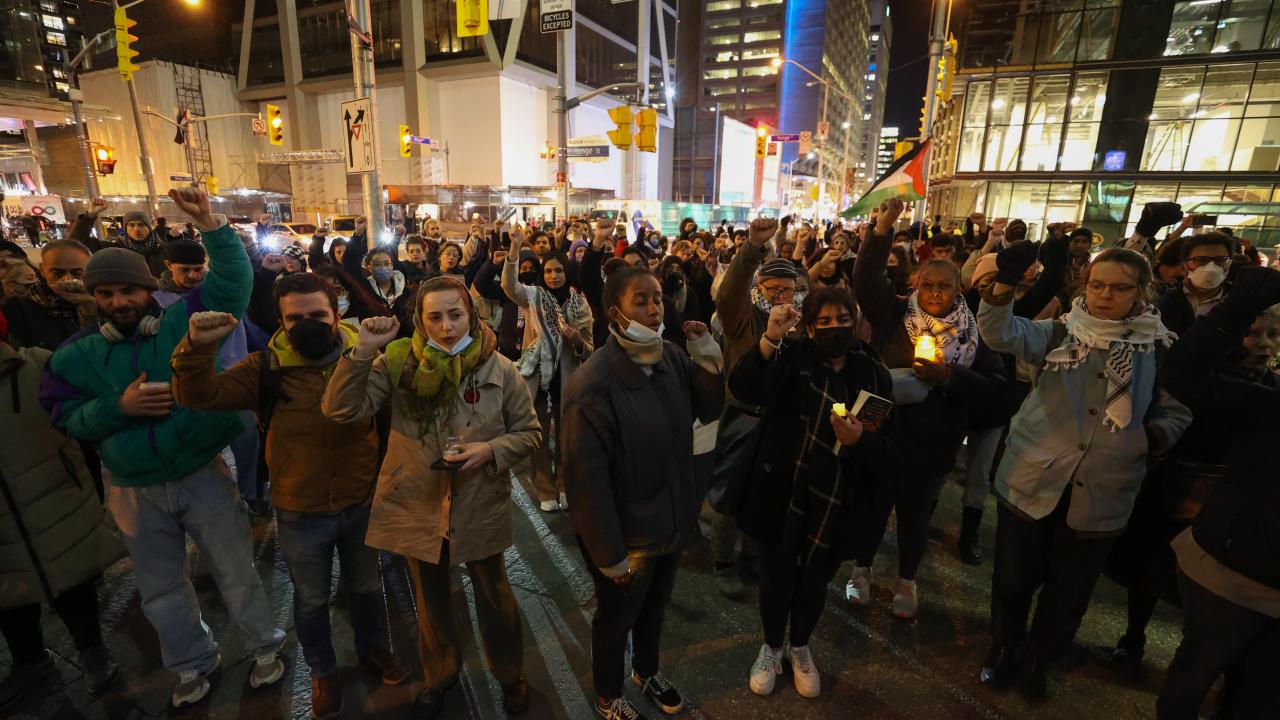 Kanada'nın Ontario eyaletinde yer alan Toronto kentinde sağlık çalışanları ittifakı tarafından Filistin'e destek gösterisi düzenlendi. İsrail Başkonsolosluğu önünde toplanan göstericiler, mumlar yakarak Filistin'e desteklerini gösterdi.