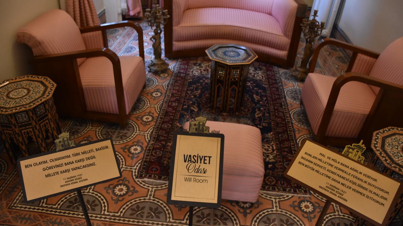 Köşkteki "Vasiyet Odası" isimli bölümde Atatürk`ün mal varlığını Türk milletine armağan etmesine ilişkin, "Mal ve mülk bana ağırlık veriyor. Bunları milletime vermekle ferahlık duyuyorum. İnsanın serveti, kendi manevi kişiliğinde. Ben büyük milletime, daha neler vermek istiyorum." sözünün yer aldığı tabela bulunuyor.