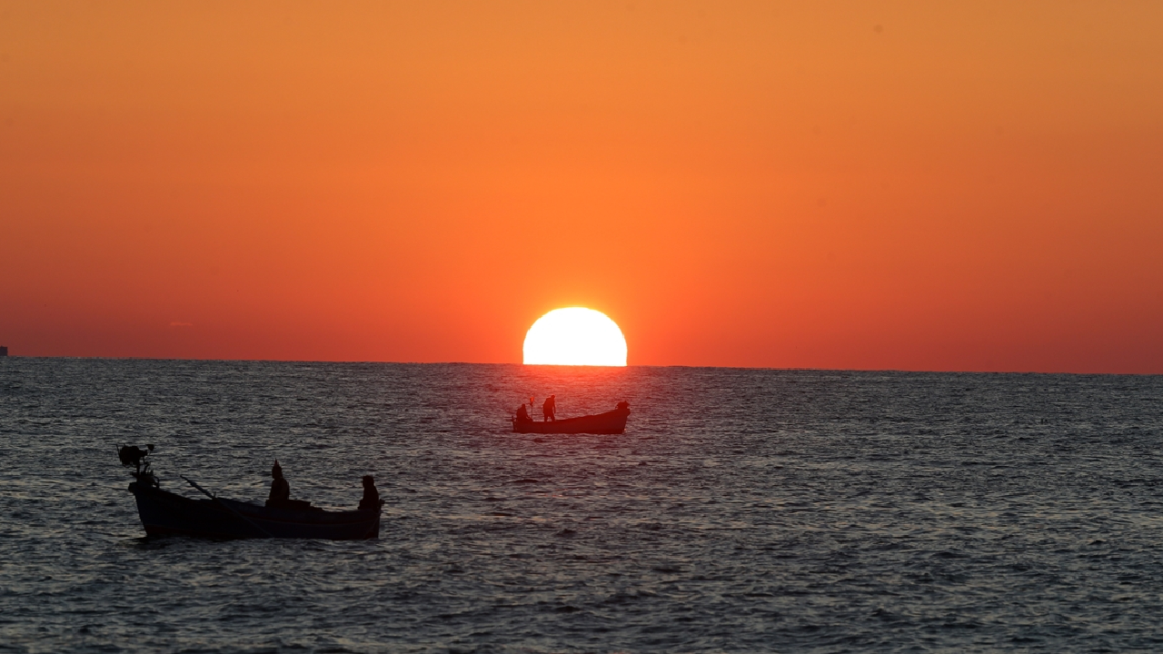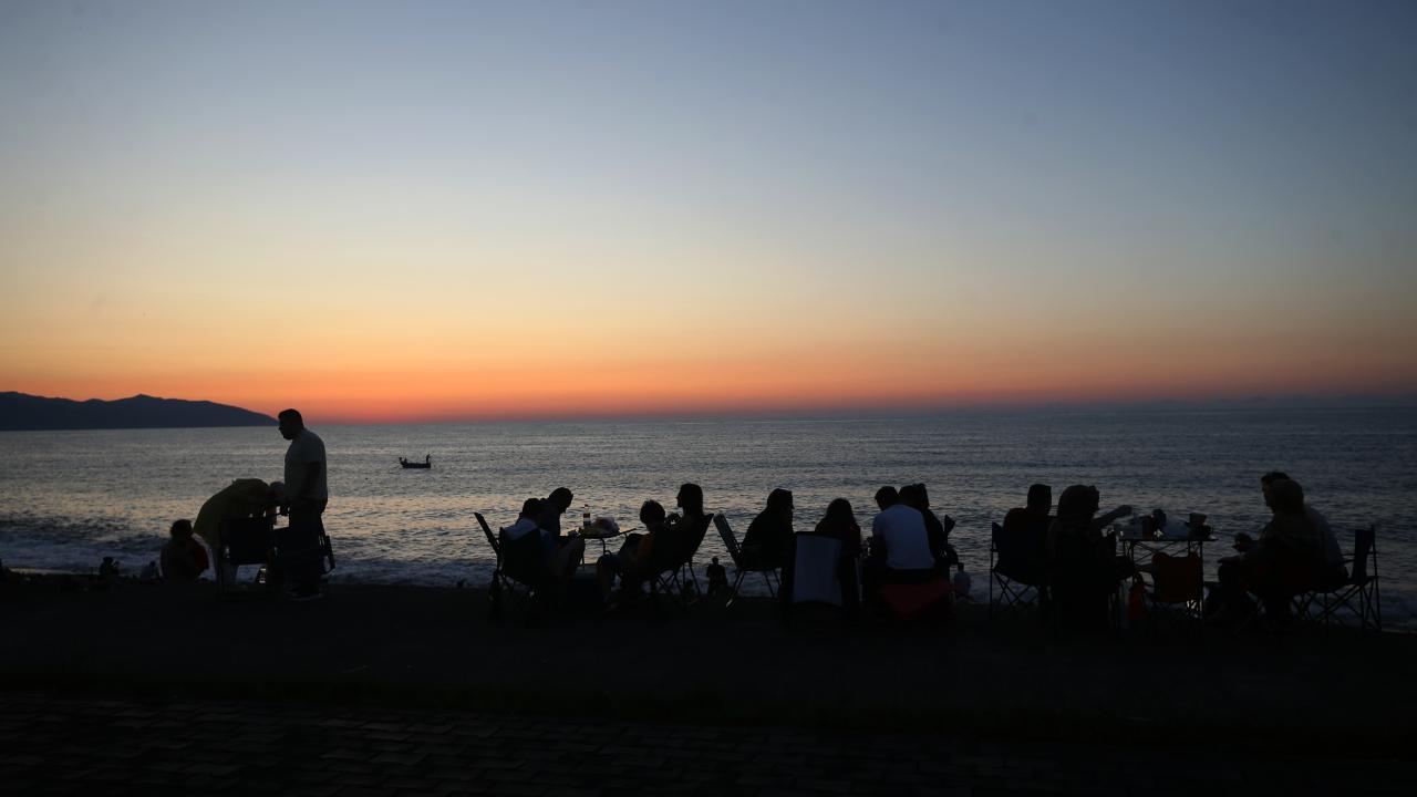 Trabzon’da, Karadeniz sahiline akşam saatlerinde gelen insanlar gün batımında ortaya çıkan renkler eşliğinde vakit geçirdi.