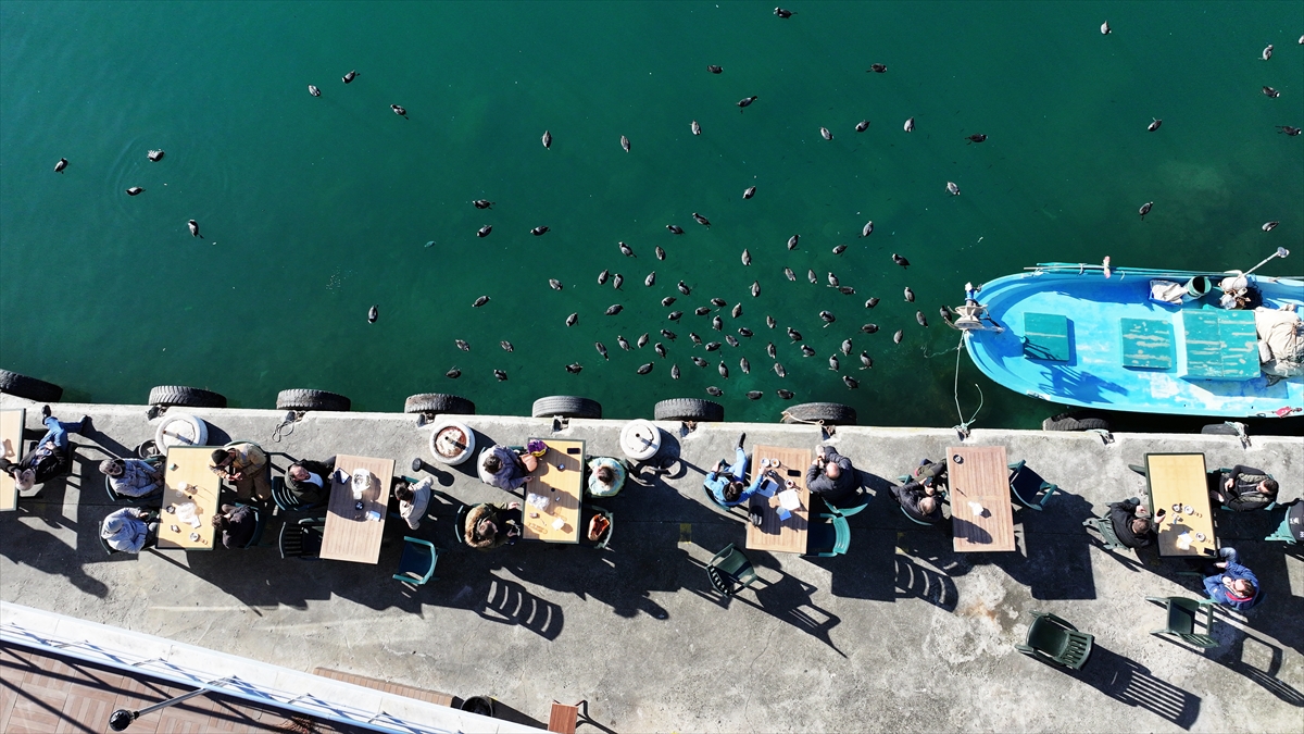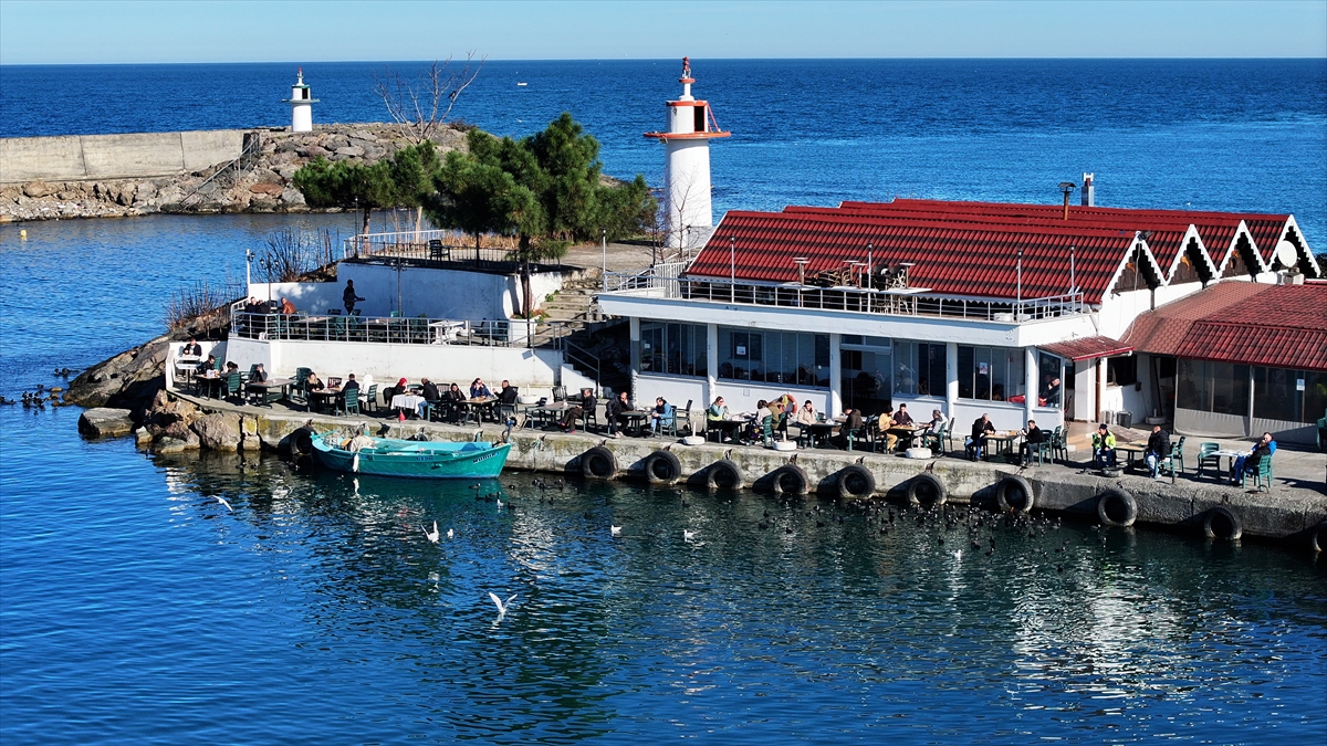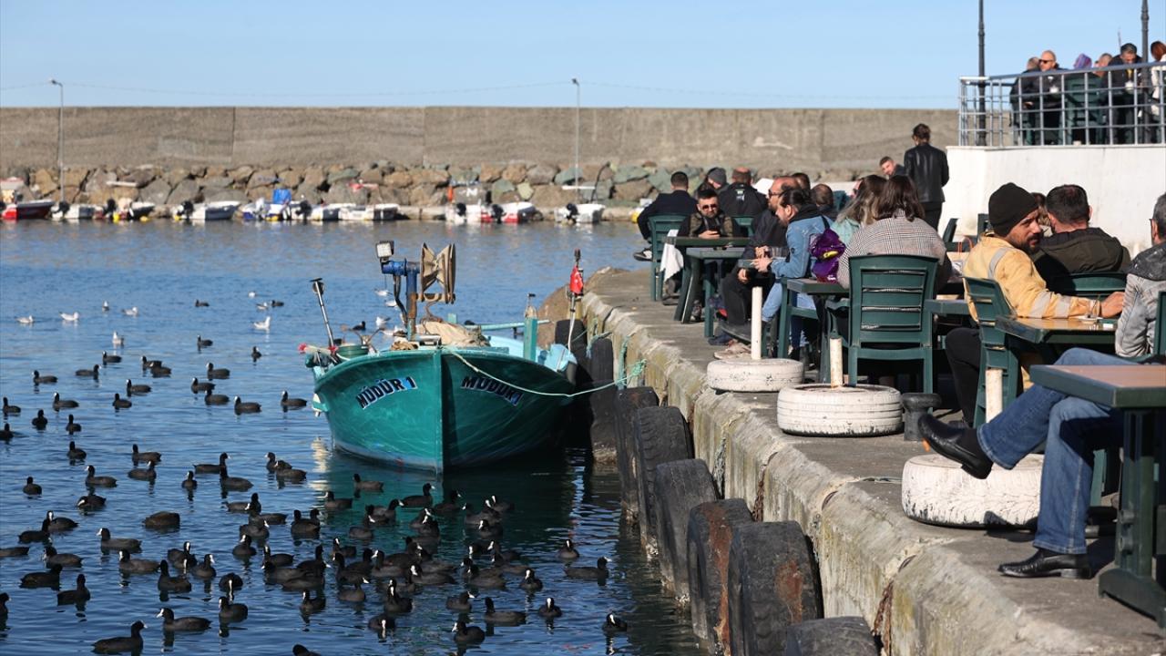 Trabzon'da son günlerde etkili olan soğuk havanın ardından kendini gösteren güneşle birlikte insanlar Faroz Balıkçı Barınağı'nda zaman geçirdi.
