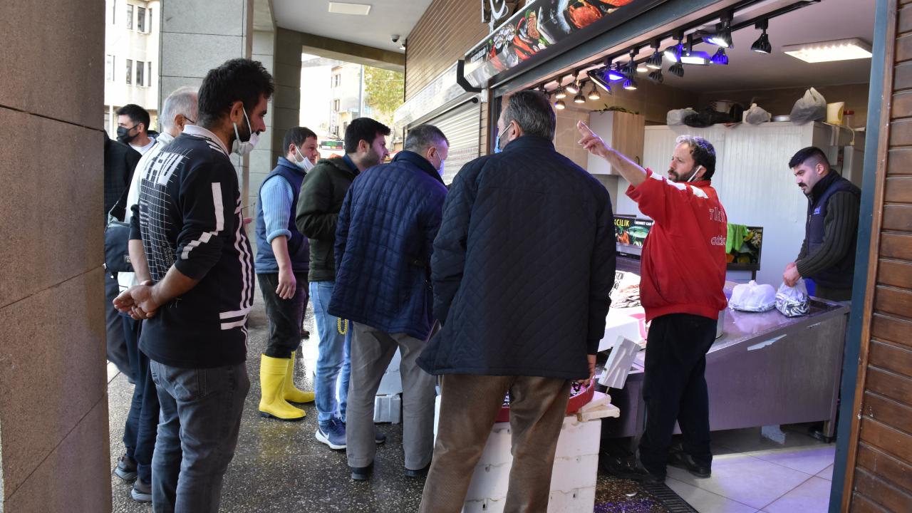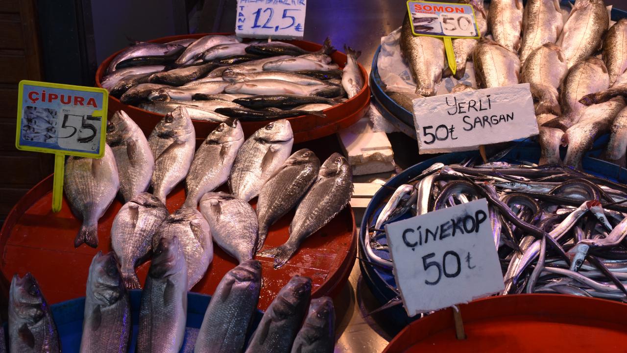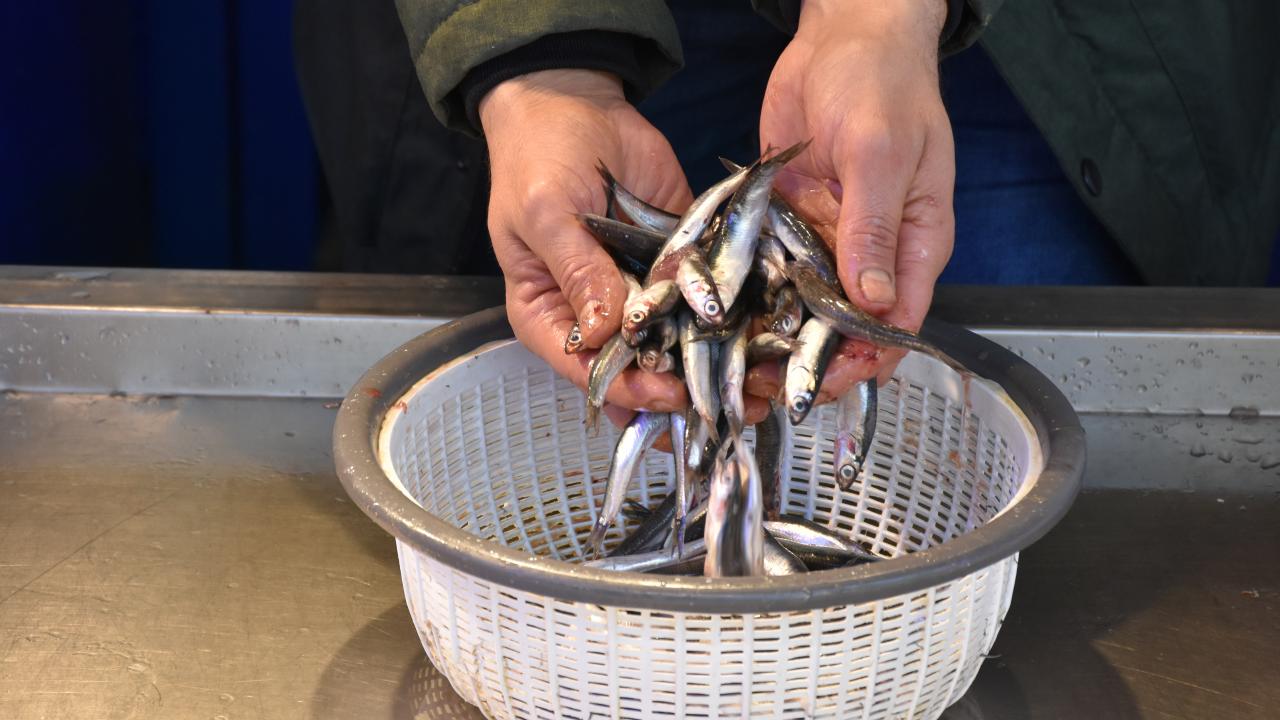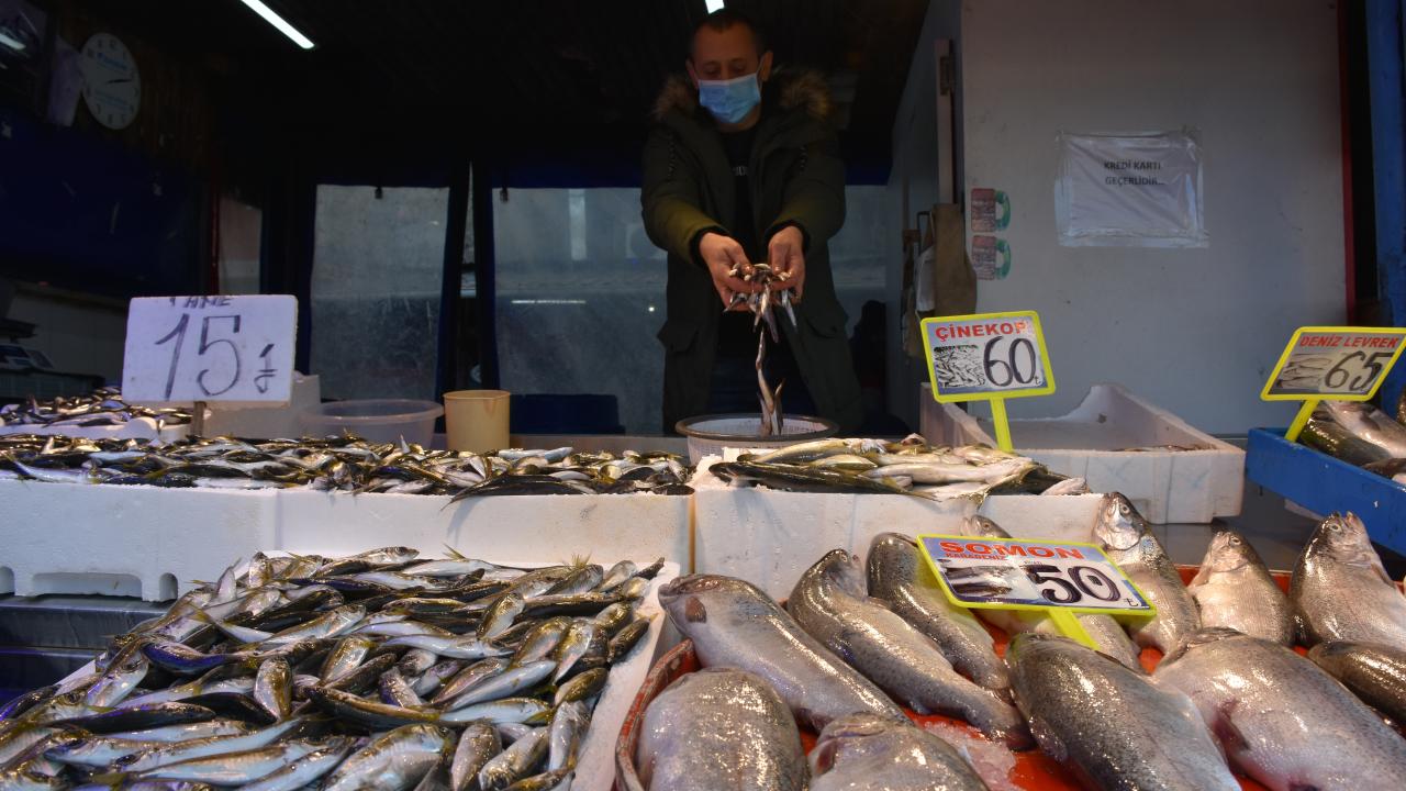 Trabzon'un Ortahisar ilçesindeki Balık Pazarı'nda hafta sonu tezgahları süsleyen hamsi 10 ila 15 liradan satılıyor.