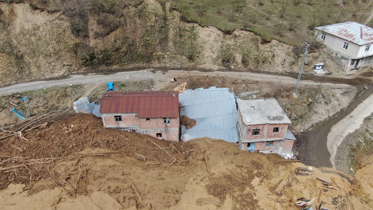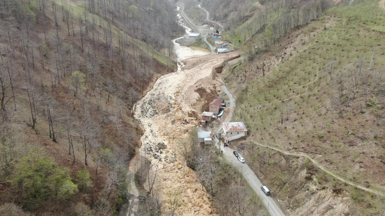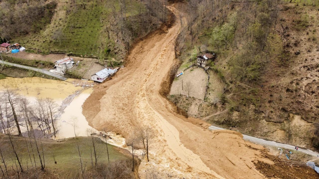 Dik yamaçtan gelen heyelan, evler ve yolu da aşarak Küçük Dere’ye ulaştı.