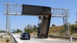 Aniden açılan damperli tır dorsesi trafik bilgilendirme panosuna takıldı