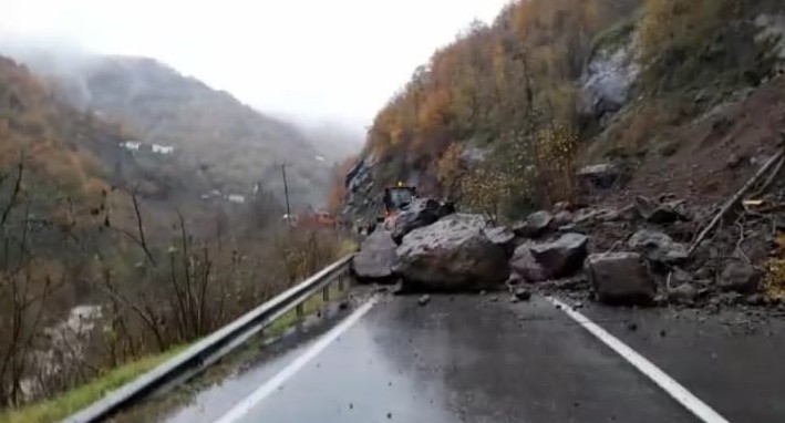 Şiddetli yağış nedeniyle saat 14.30 sıralarında Şalpazarı-Beşikdüzü karayolu 9. kilometresinde yamaçtan kopan kaya parçaları ve toprak birikintisi yola düştü.