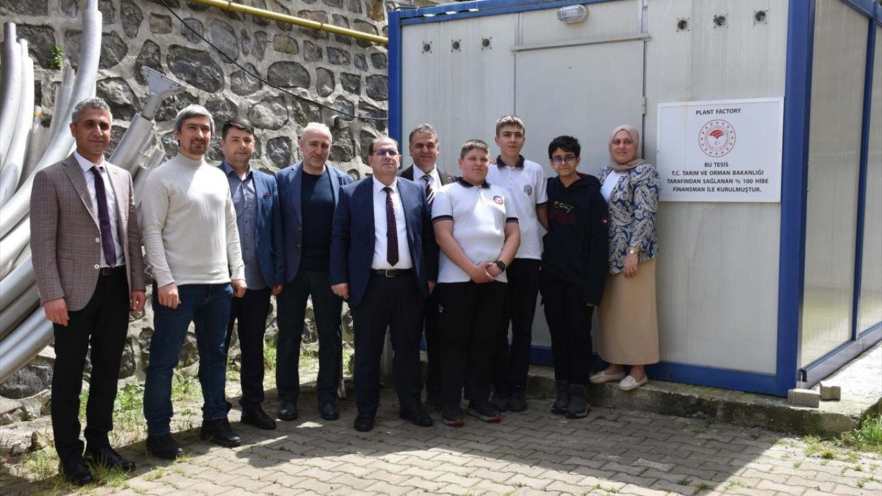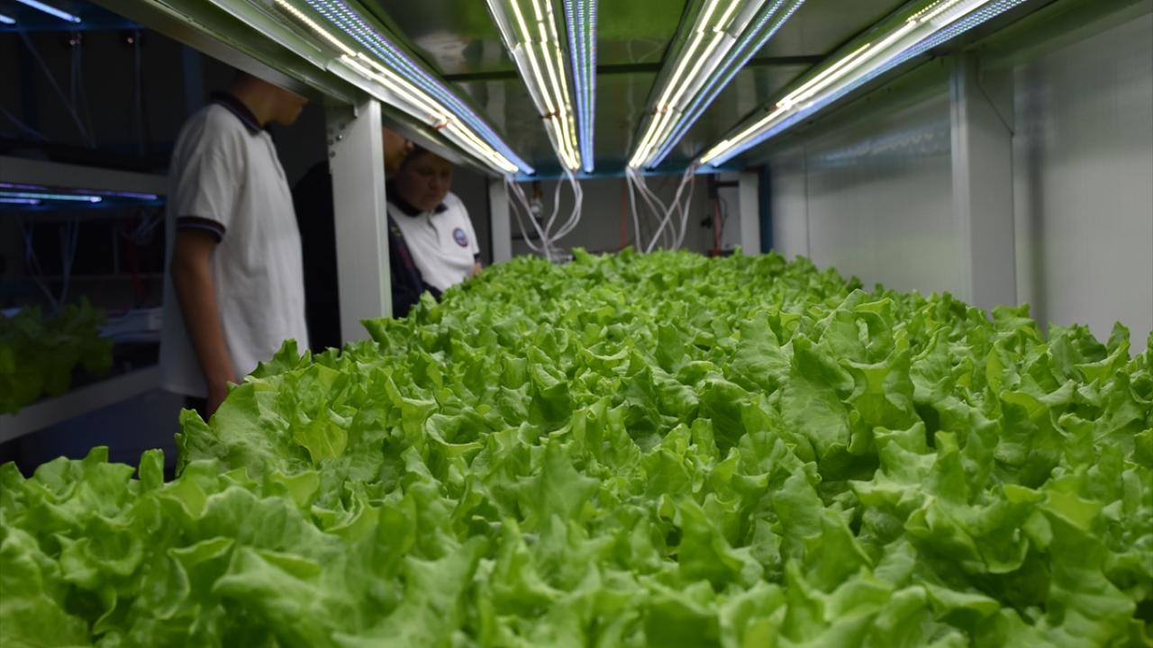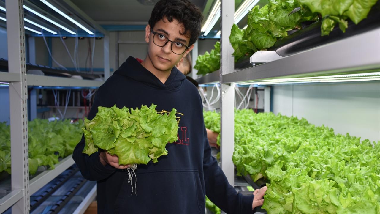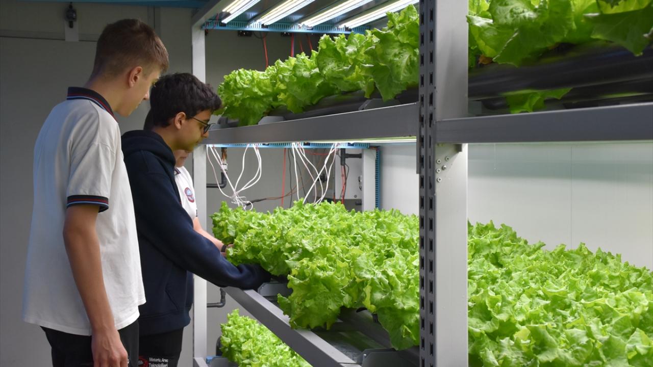 Öğrenciler, Trabzon Teknokent`teki özel bir şirket tarafından hazırlanan ve 8 farklı bitki türüne ihtiyacı olan su, aydınlatma, sıcaklık, uygun besin oranları ve asidik koşulları sağlayan kabinde ilk etapta 736 kök marul yetiştirdi.