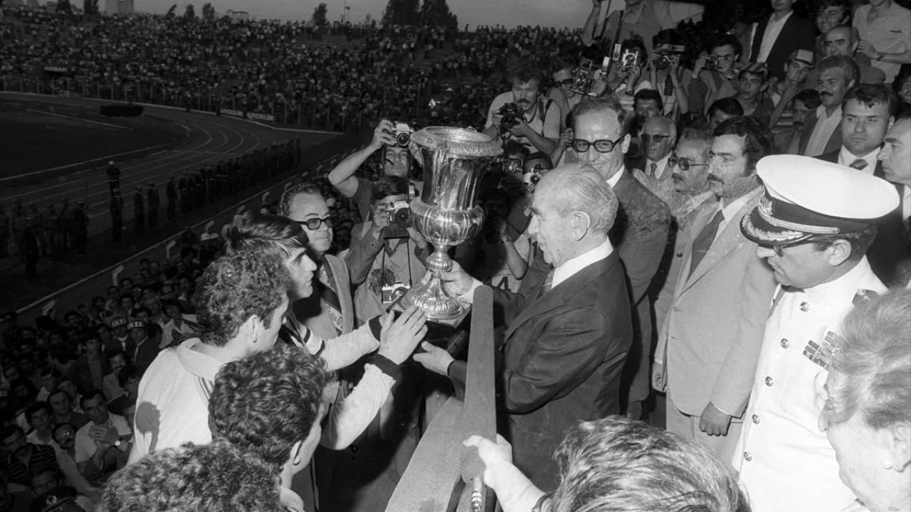17 Haziran 1979`da Cumhurbaşkanlığı Kupasını Fenerbahçe`yi 2-1 yenen Trabzonspor kazandı. Kupayı Cumhurbaşkanı Fahri Korutürk`ün elinden Trabzonspor kaptanı Şenol Güneş aldı. (Arşiv)