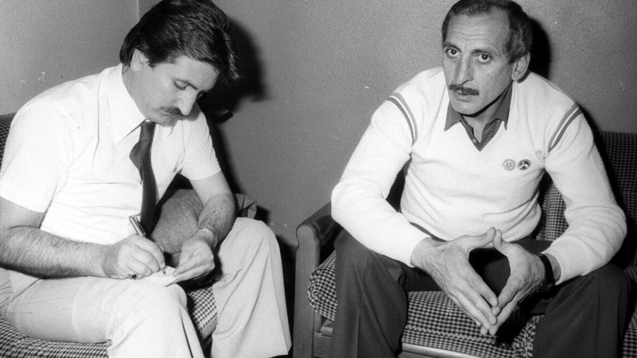 1 Haziran 1981`de Trabzonspor Teknik direktörü Özkan Sümer (sağda) AA Muhabiri Hayri Özel`in (solda)sorularını yanıtladı. (Arşiv)