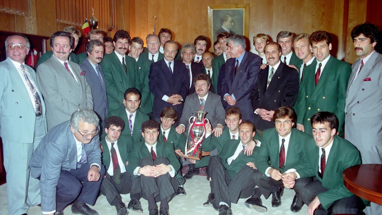 8 Mayıs 1992`de Devlet Bakanı M. Ali Yılmaz Federasyon Kupası`nı kazanan Trabzonspor`u makamında kabul etti. (Arşiv)
