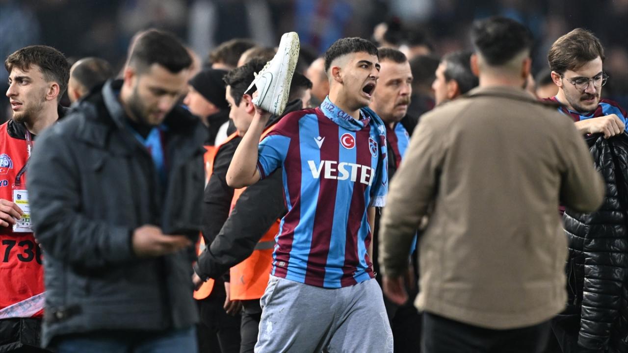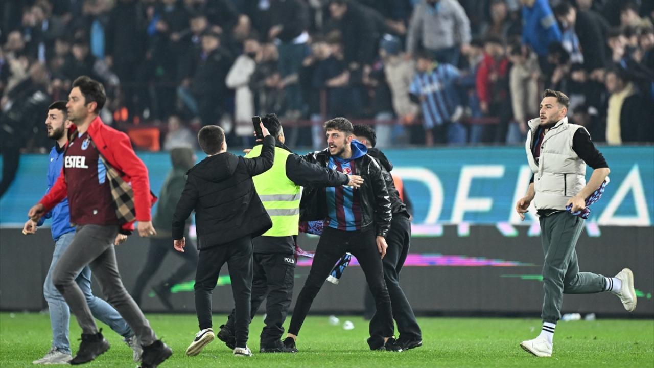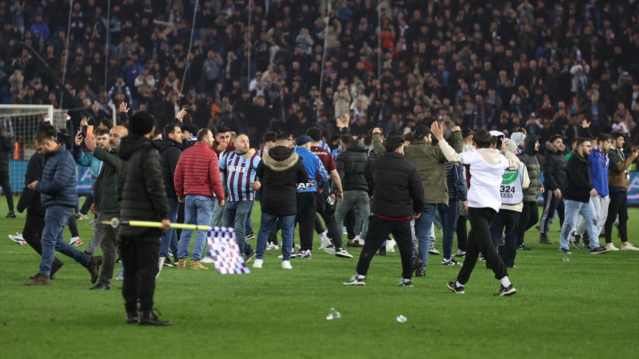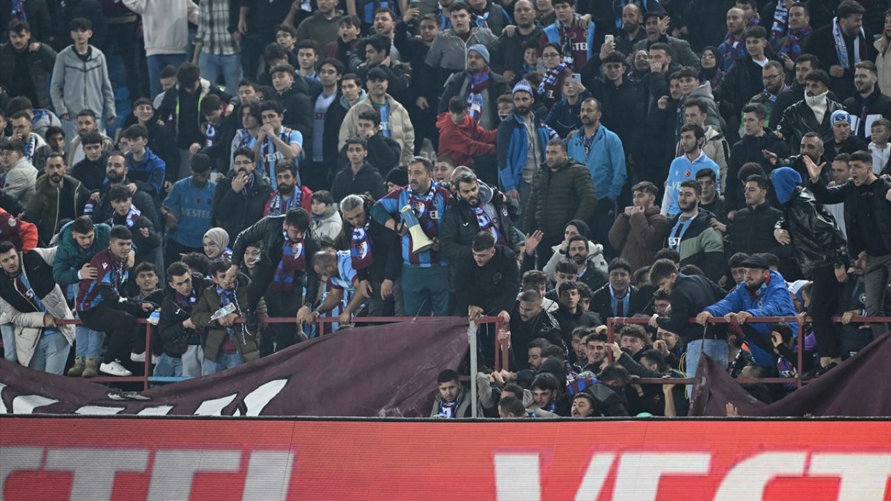 Trabzonsporlu taraftarların sahaya attığı patlayıcı madde ve su bardakları nedeniyle zaman zaman maç durdu.