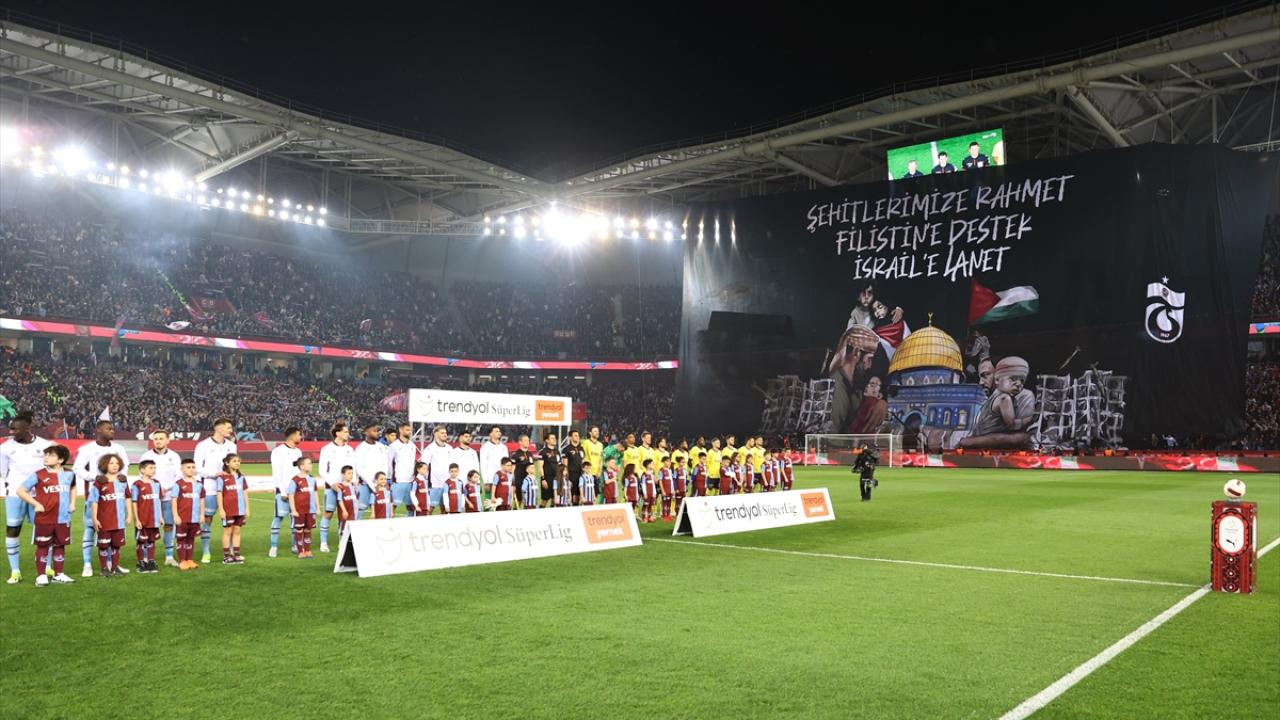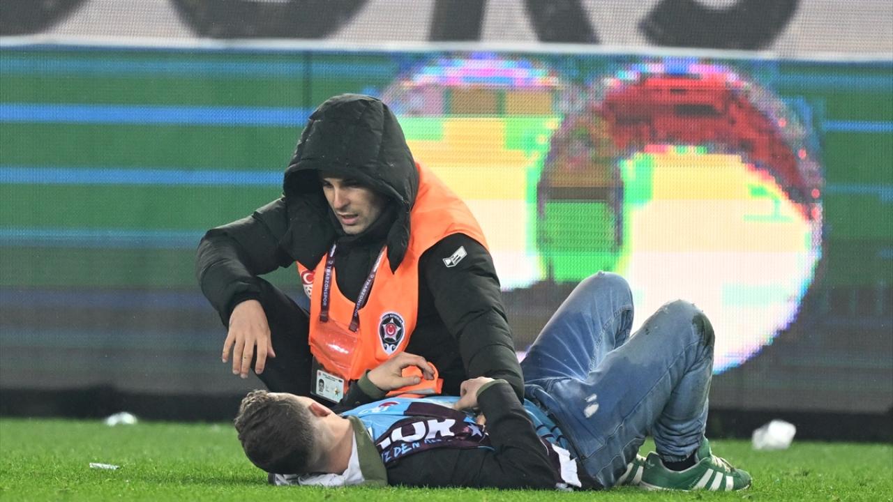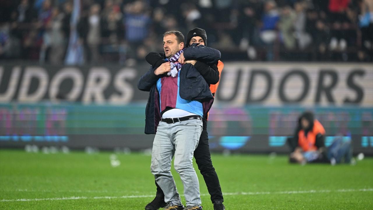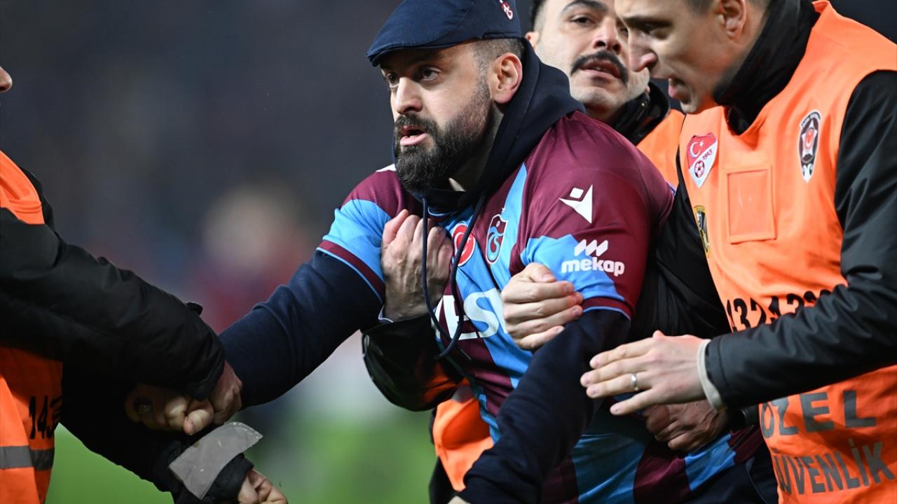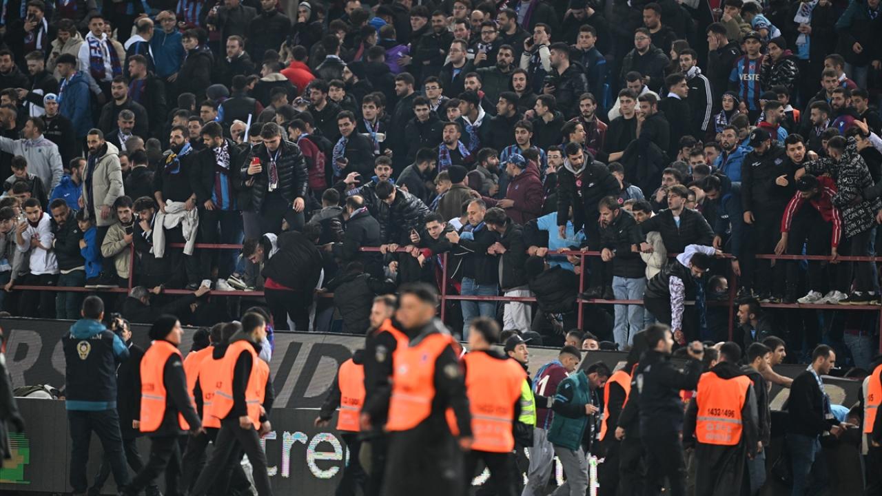 Trabzonsporlu taraftarların sahaya attığı patlayıcı madde ve su bardakları nedeniyle zaman zaman maç durdu.
