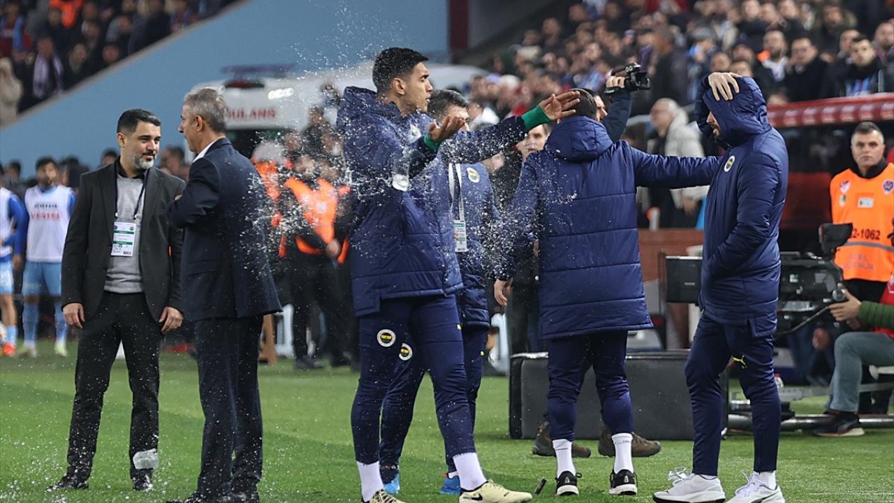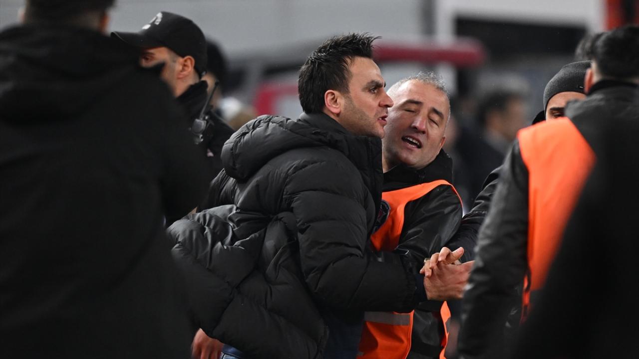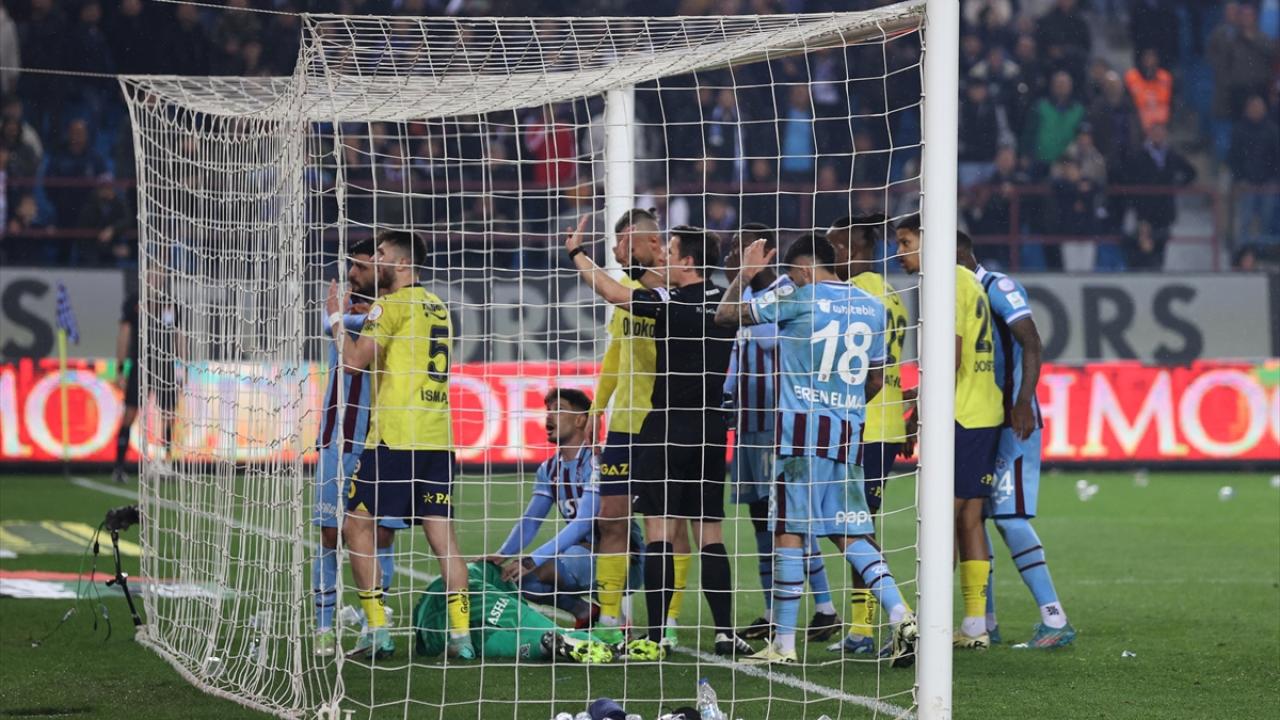 Karşılaşmanın orta hakemi Halil Umut Meler, sahaya atılan maddeler nedeniyle yardımcı hakemleri de orta sahaya çağırarak taraftarların sakinleşmesini bekledi.