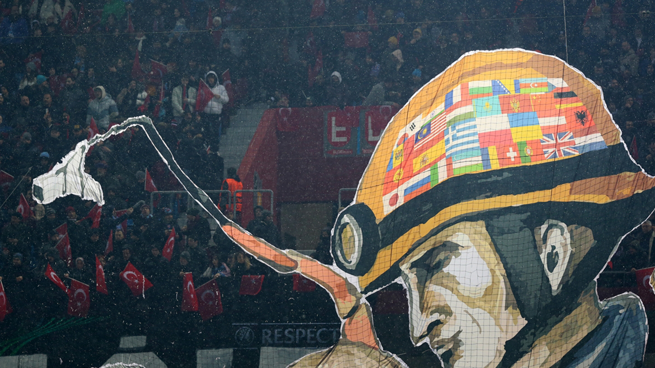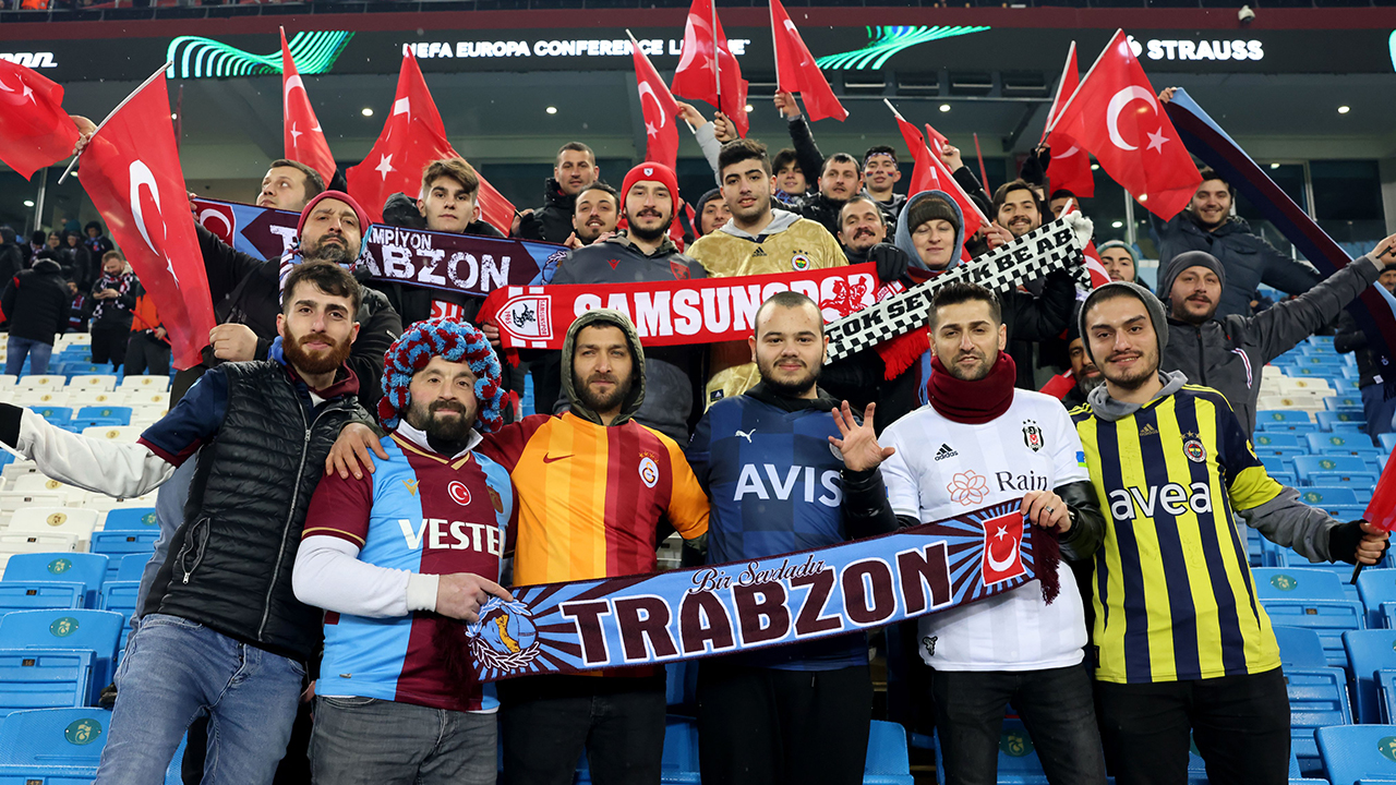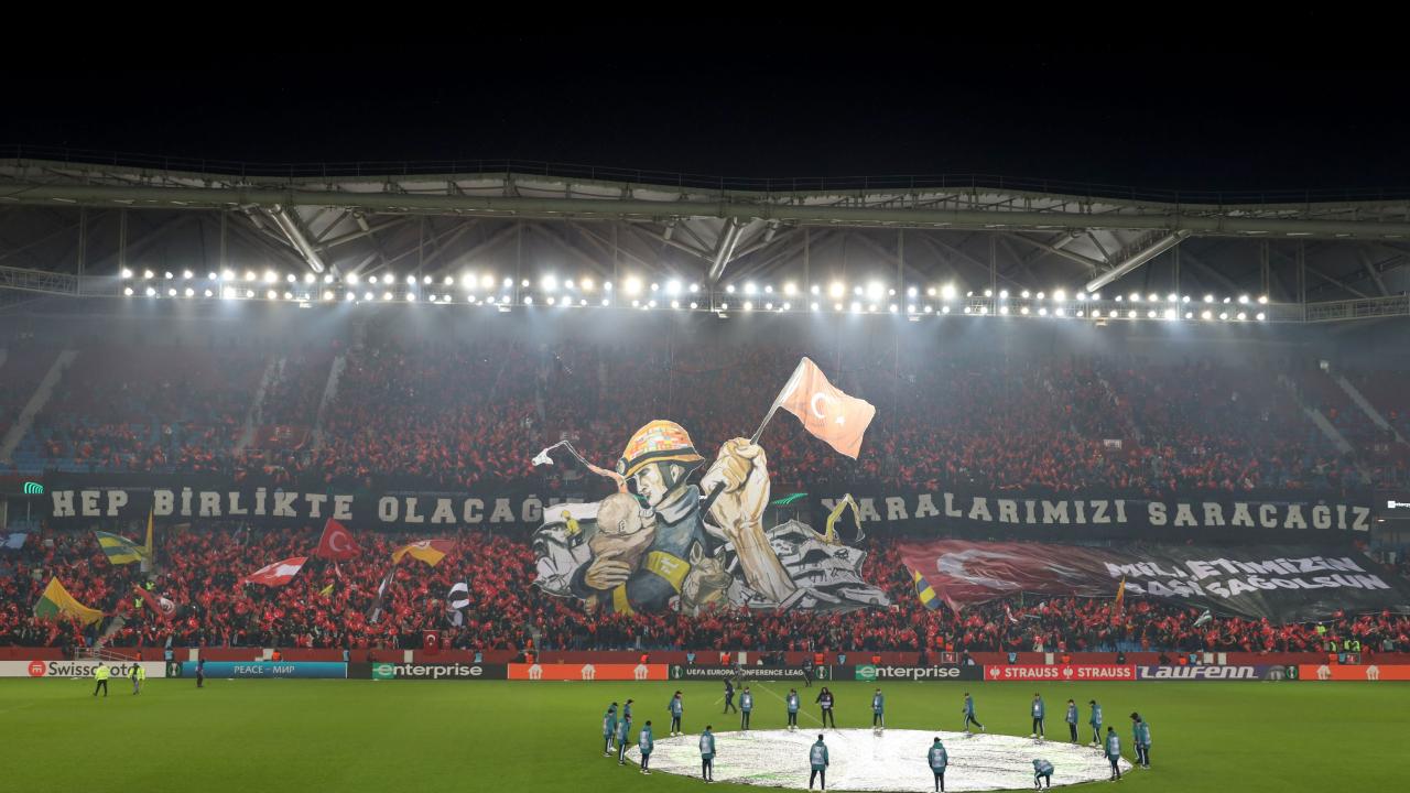 Trabzonspor'un UEFA Konferans Ligi play-off turunda İsviçre'nin Basel takımı ile oynadığı karşılaşmada futbol dünyası tek yürek oldu. Karşılaşma öncesi, tribünleri dolduran farklı takımlara gönül vermiş taraftarlardan duygulandıran koreografi sergilendi.