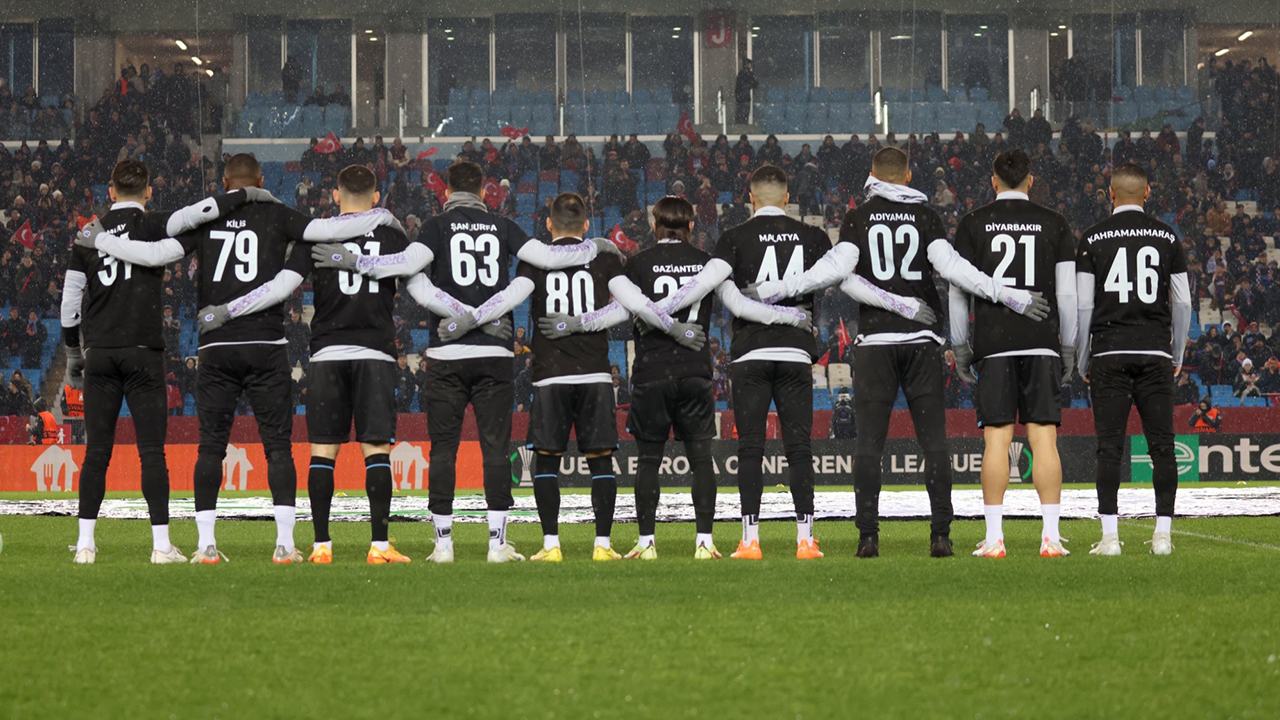 Trabzonsporlu oyuncular, karşılaşma öncesi ısınmaya üzerinde depremde etkilenen şehirler ve plaka kodunun olduğu siyah tişört, maça da siyah formayla çıktı.