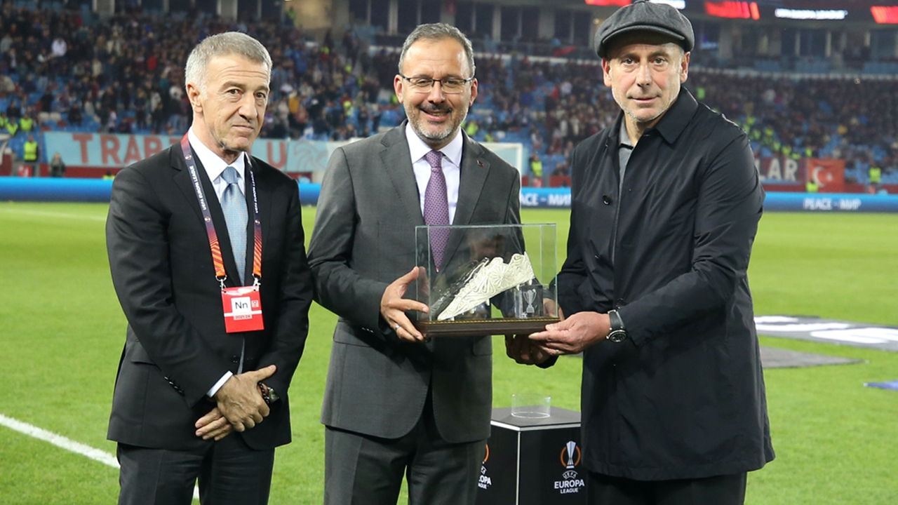Gençlik ve Spor Bakanı Mehmet Muharrem Kasapoğlu, maçı öncesi teknik direktör Abdullah Avcı`ya, bordo-mavili takım kariyerinde geride kalan 100. maçı nedeniyle plaket verdi.