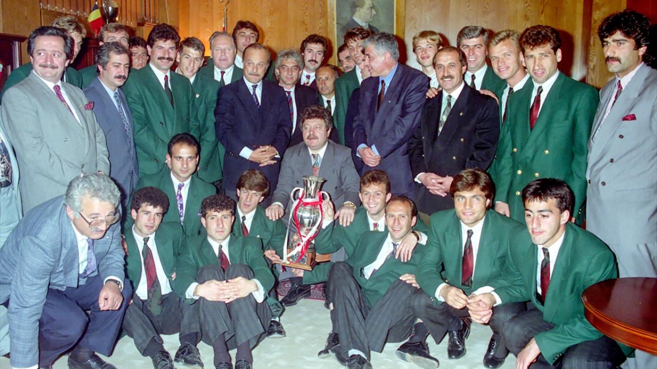 Devlet Bakanı Mehmet Ali Yılmaz Federasyon Kupası`nı kazanan Trabzonspor`u makamında kabul etti. (Arşiv-07.05.1992)