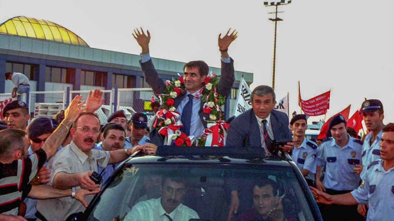 Milli Takım Teknik Direktörü Şenol Güneş, Trabzon`a gelişinde havalimanında taraftarlar tarafından karşılandı. (Arşiv-06.07.2002)
