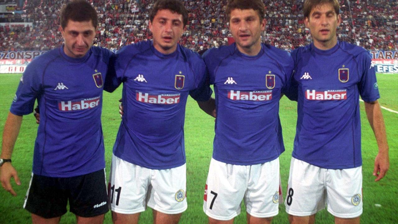 Avrupa Futbol Şampiyonası Eleme Grubu maçlarına hazırlanan A Milli Futbol Takımı, Gürcistan Milli Futbol Takımı ile Trabzon`da karşılaştı. Trabzonspor`da forma giyen Gürcü futbolcular Arçil, Şota, Nesadze ve Jamarauli birlikte fotoğraf çektirdi. (Arşiv-21.08.2002)