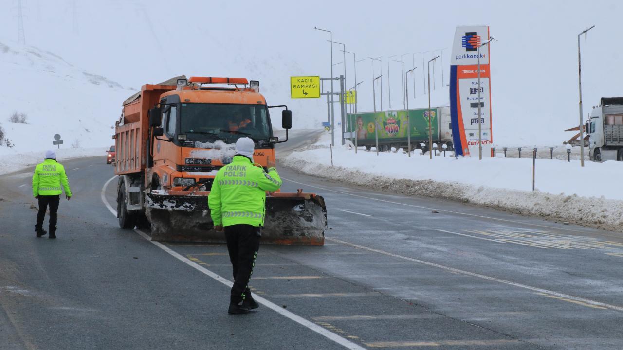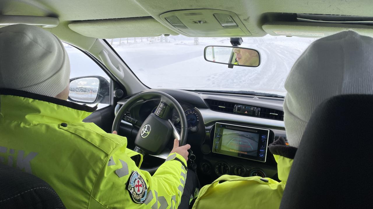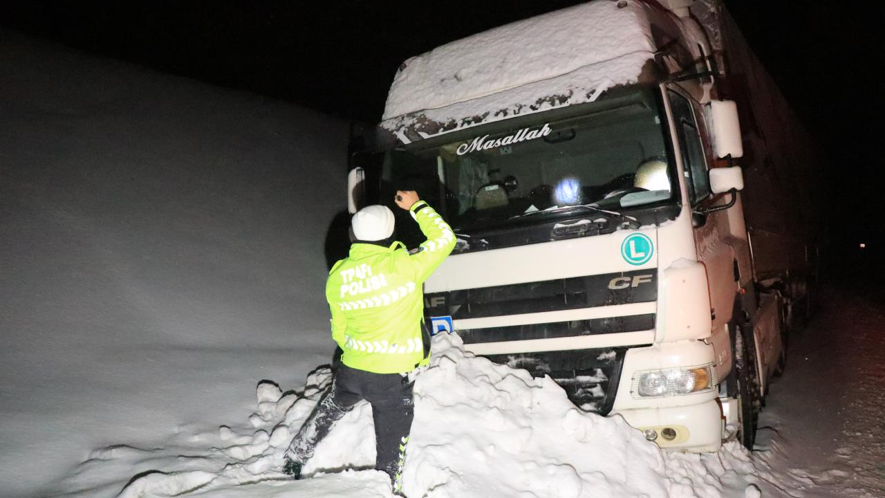 Kar kalınlığının 100 santimetreyi bulduğu ve buzlanma, sis ile tipinin ulaşımı etkilediği kara yolunda görev yapan polisler, tüm olumsuz hava koşullarına rağmen gece, gündüz demeden çalışıyor.