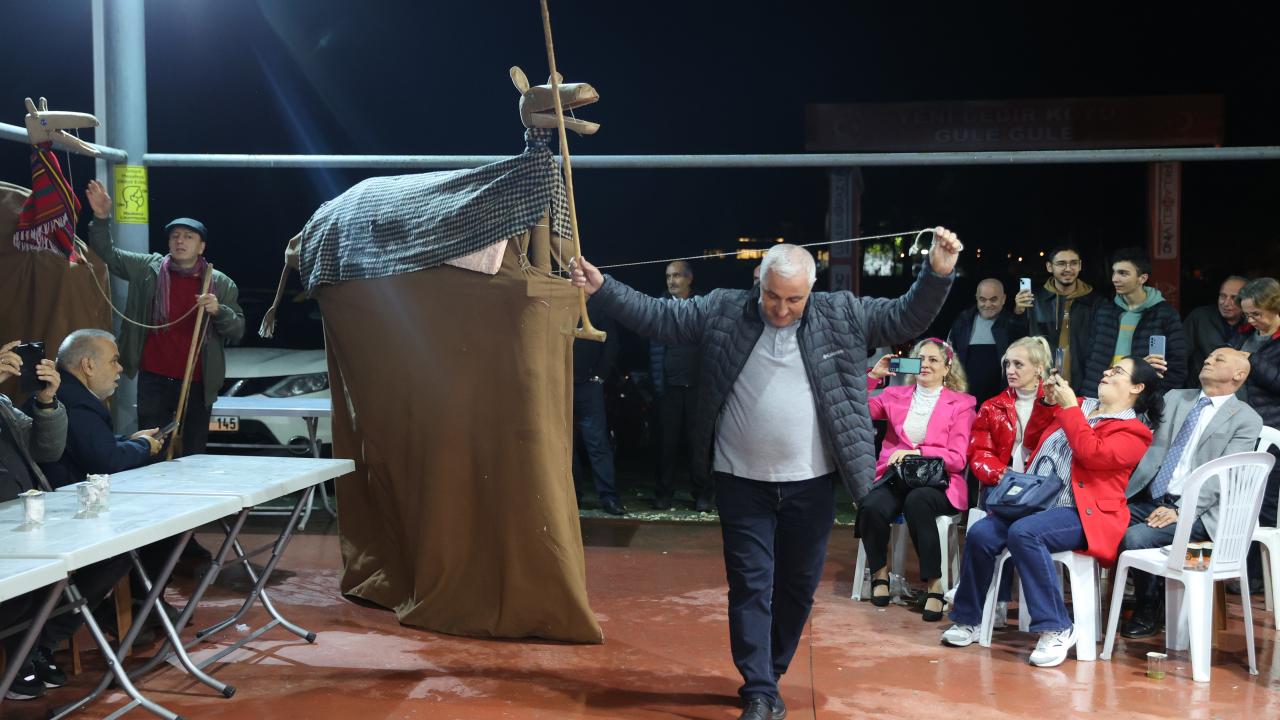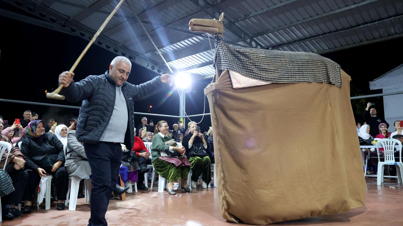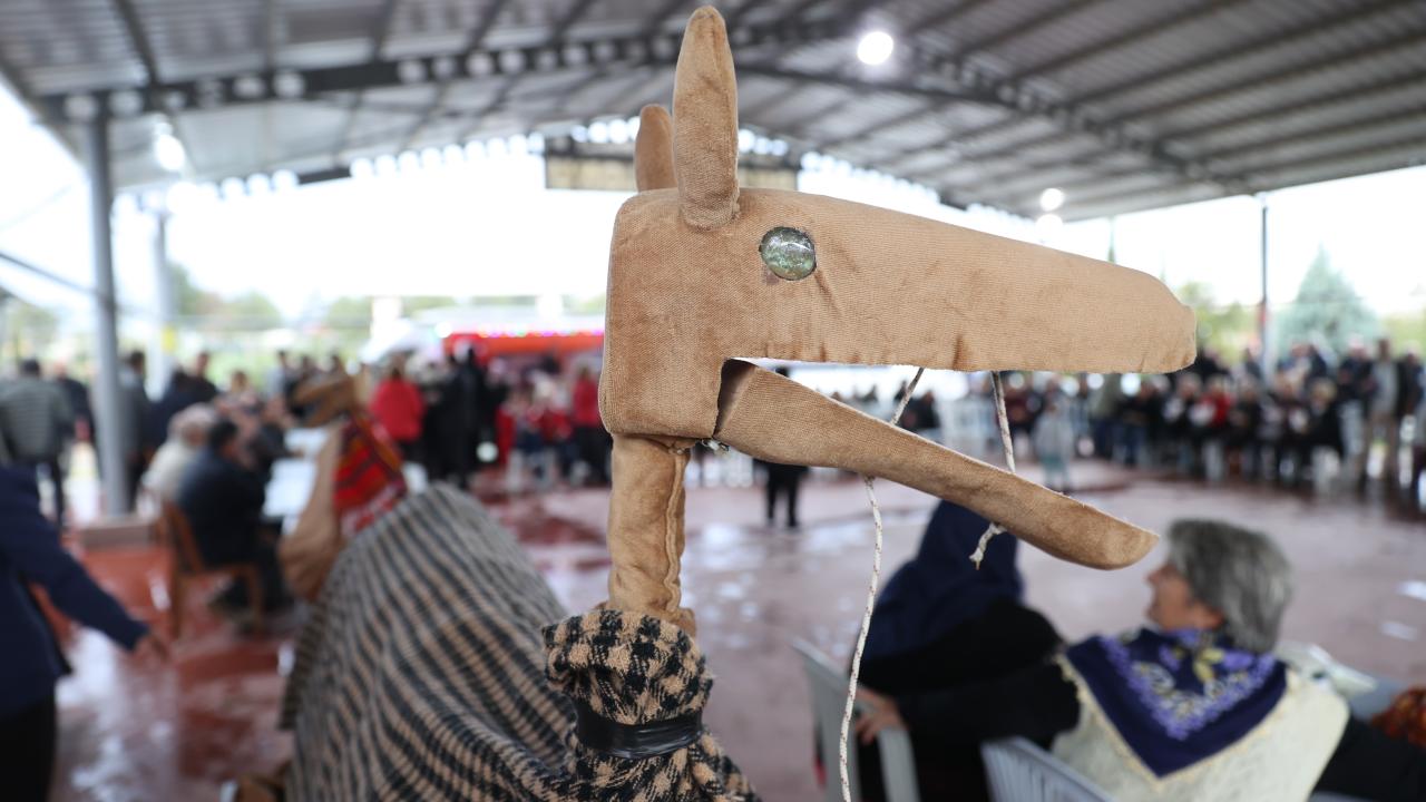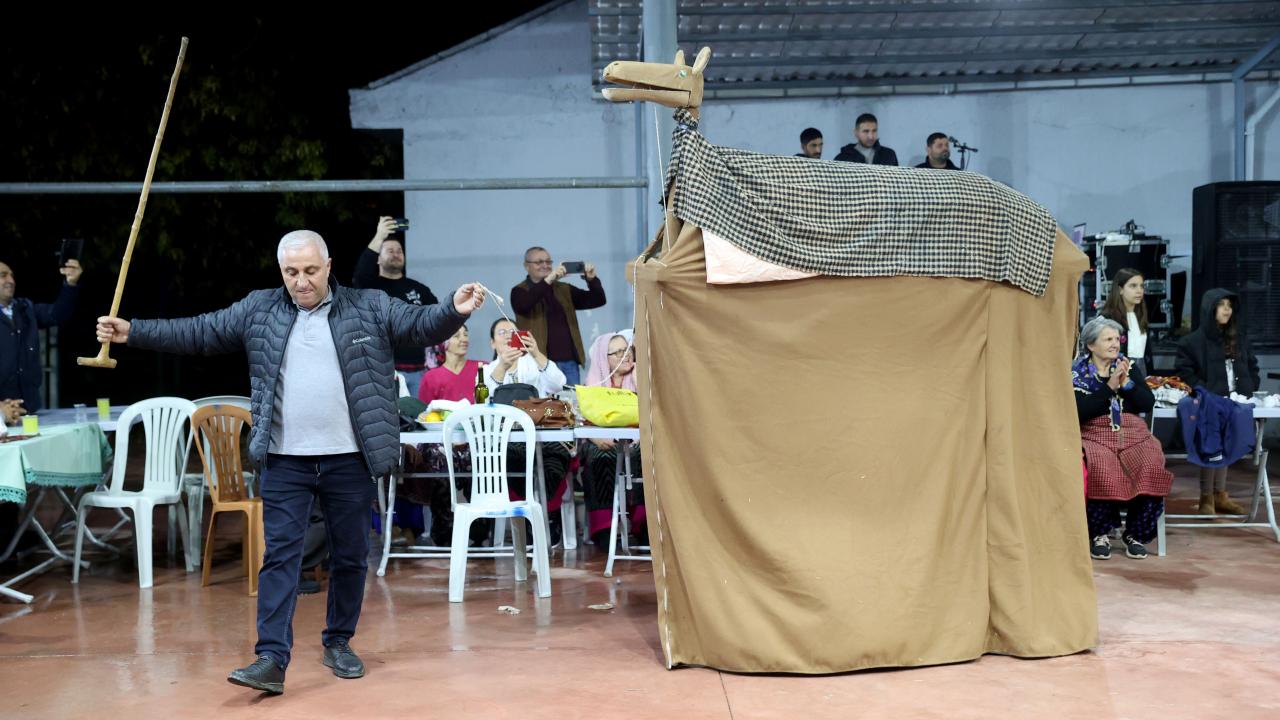 Etkinliğin bir bölümünde iki kişinin sırtına yerleştirilen kalasların üstünün kilim ve çulla örtülmesiyle hazırlanan temsili deve, maniler eşliğinde düğün alanında gezdirildi.