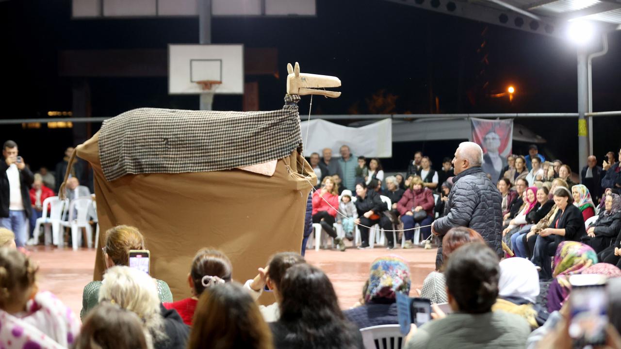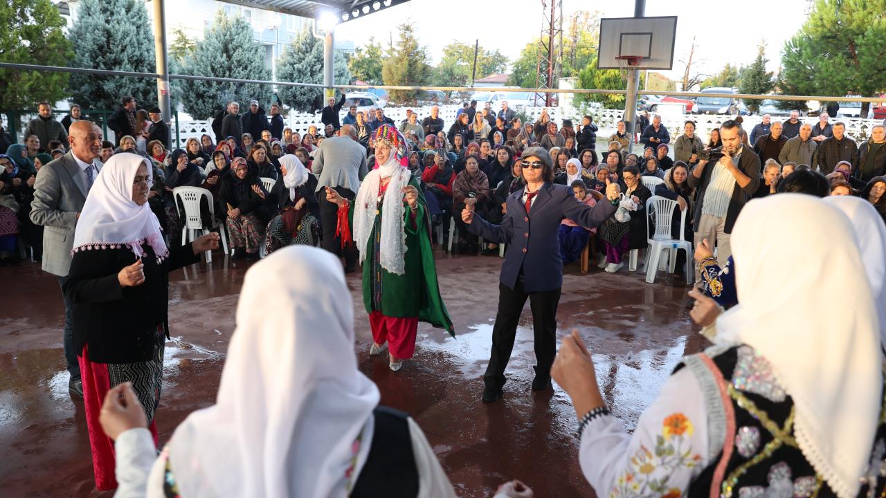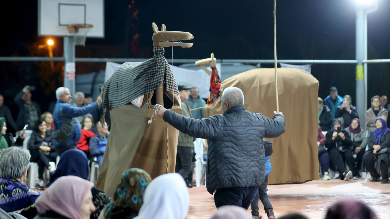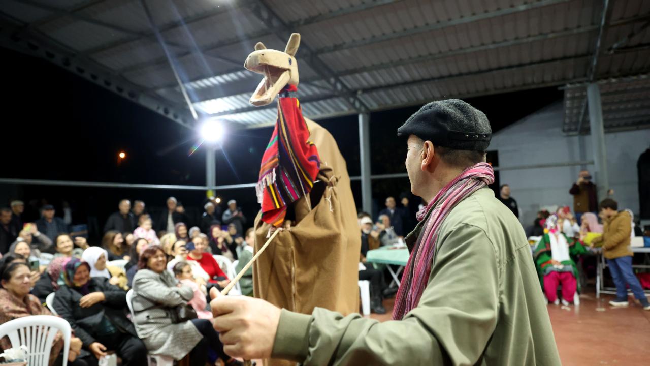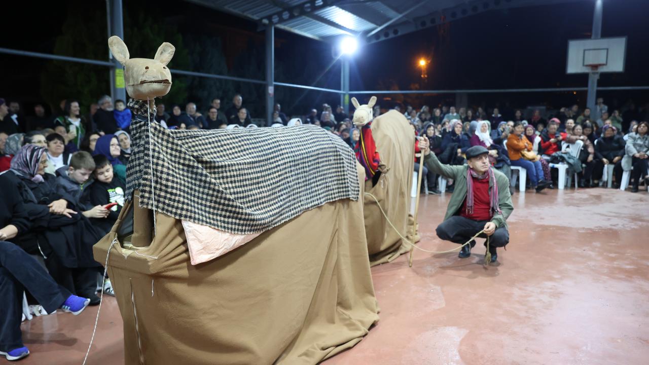 Etkinliğin bir bölümünde iki kişinin sırtına yerleştirilen kalasların üstünün kilim ve çulla örtülmesiyle hazırlanan temsili deve, maniler eşliğinde düğün alanında gezdirildi.