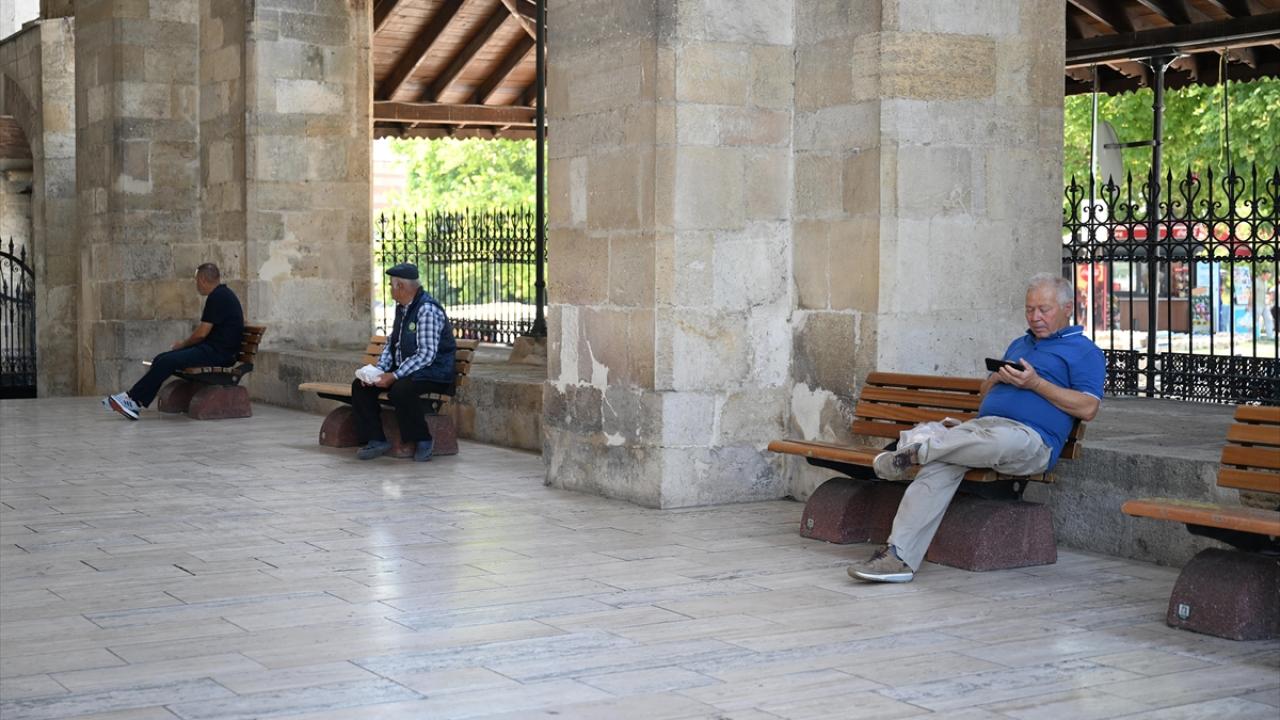 Hava sıcaklığının 38 derece ölçüldüğü Edirne`de sıcak havadan korunmak isteyen vatandaşlar kapalı çarşı, cami avlusu ve ağaçların gölgesinde vakit geçirdi.